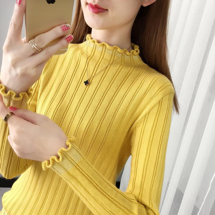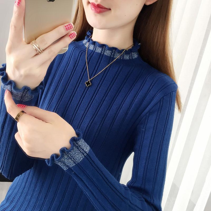 半高領打底衫女秋冬內搭2025新款洋氣亮絲修身套頭木耳邊針織毛衣