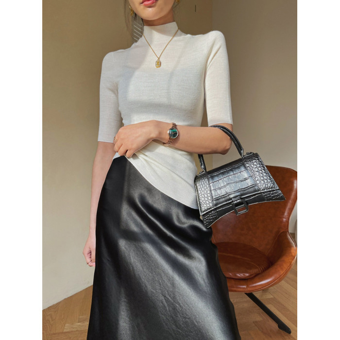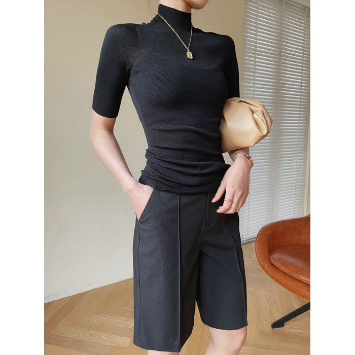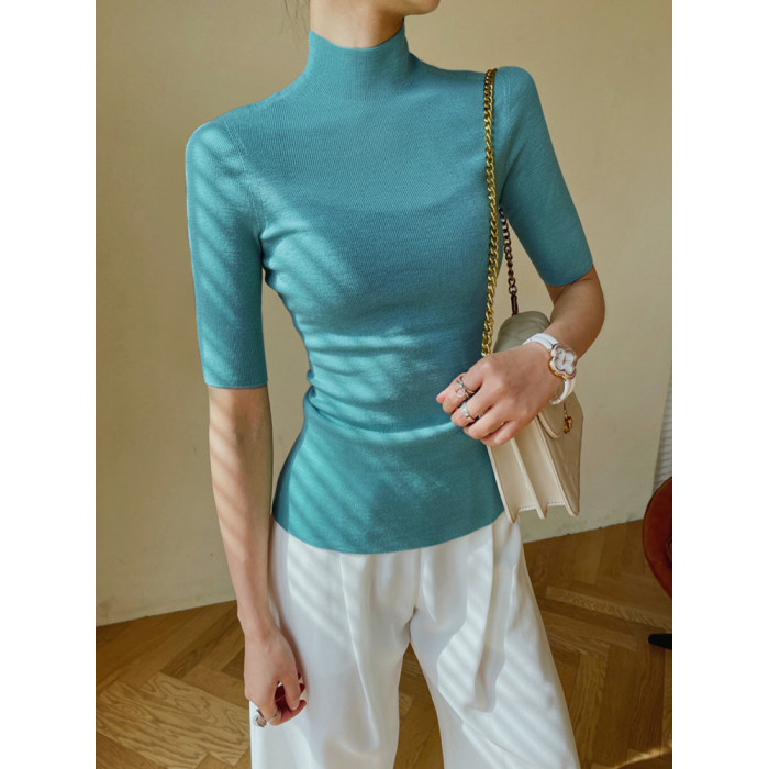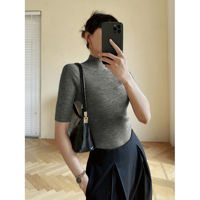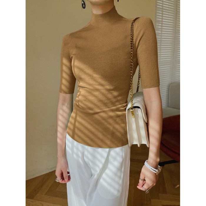 可機洗100%羊毛針織無縫一體5分袖短袖半高領針織上衣 打底衫女