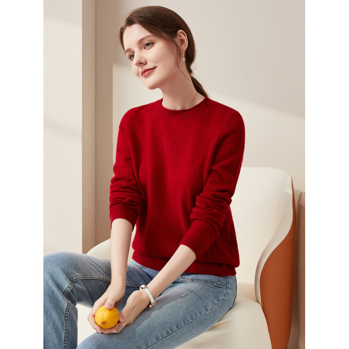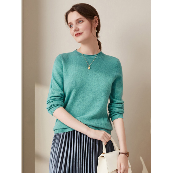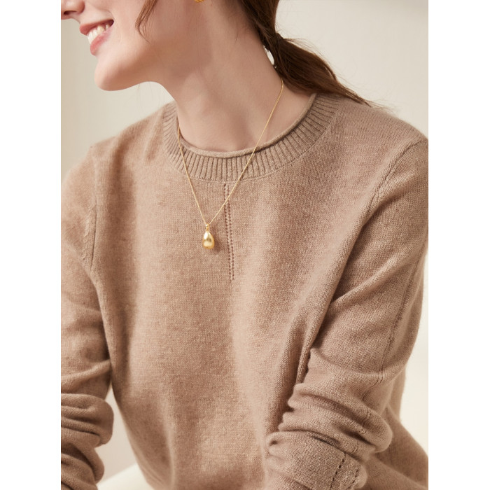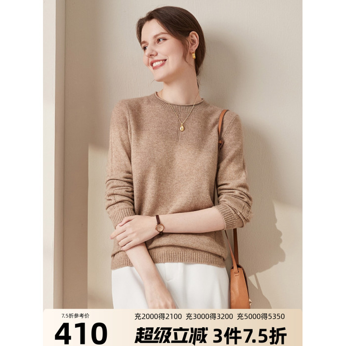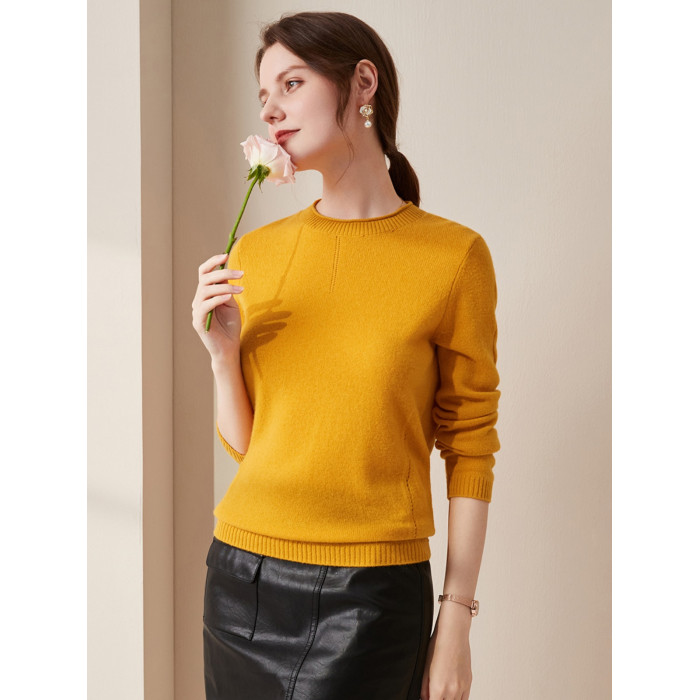兆君秋冬新款卷邊圓領純色羊絨衫女長袖針織打底衫保暖羊絨毛衣