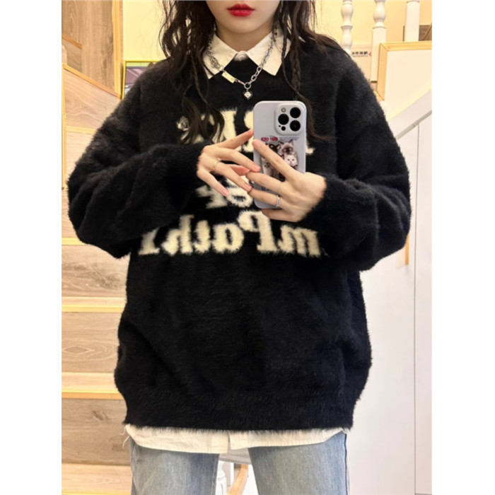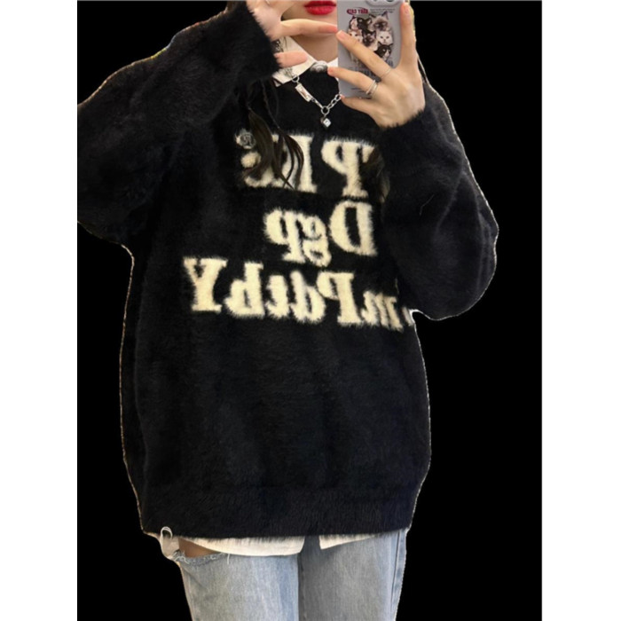 美式字母水貂絨毛衣女秋冬季高中初中學生大童女孩加絨加厚打底衫