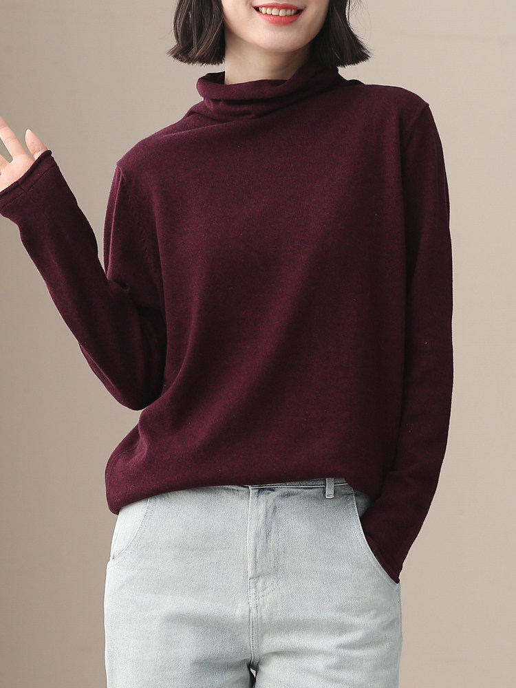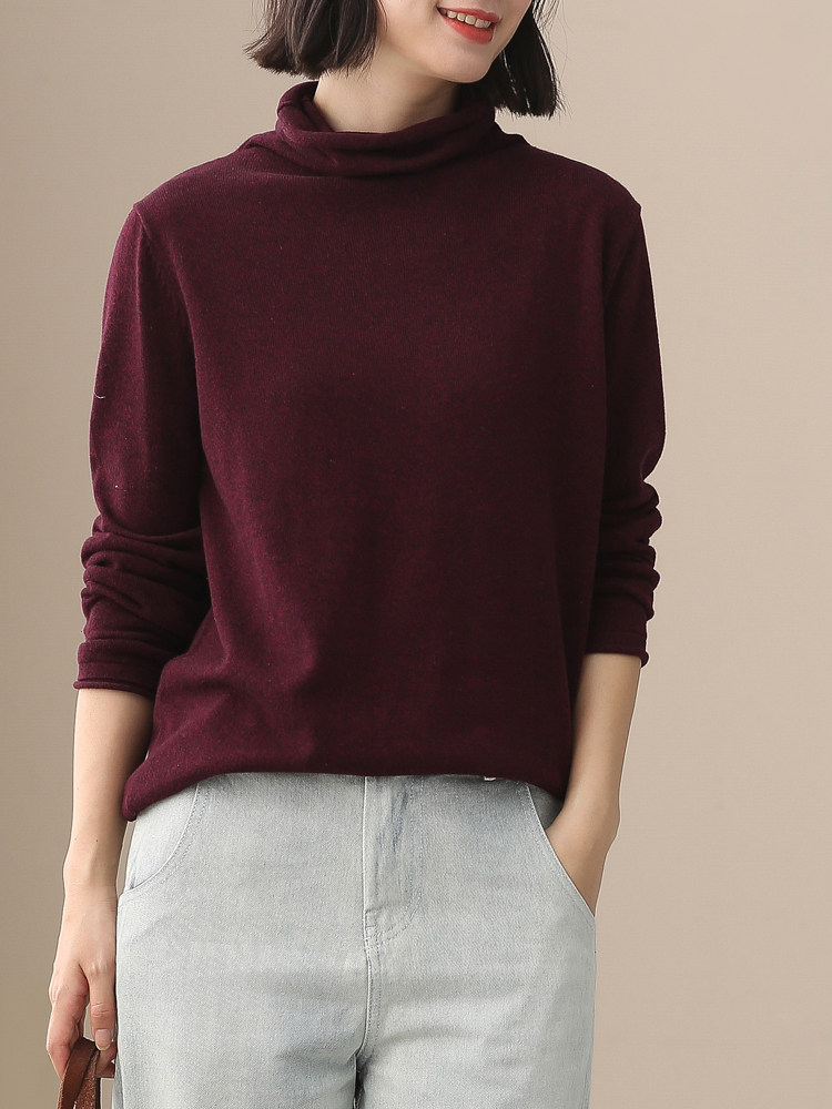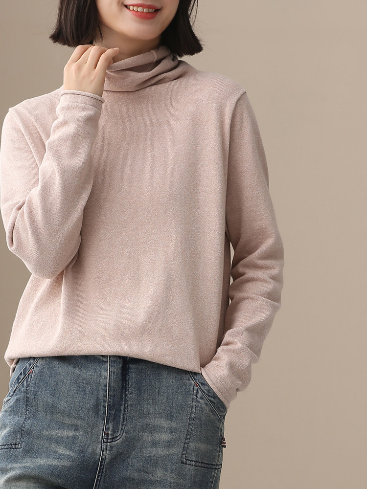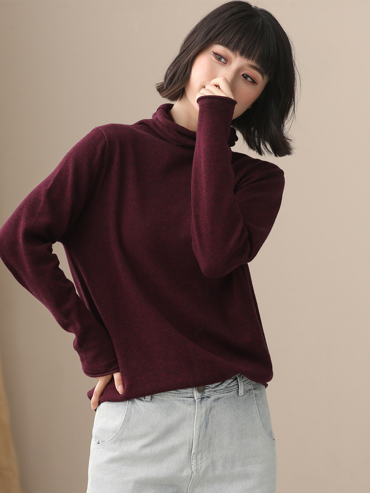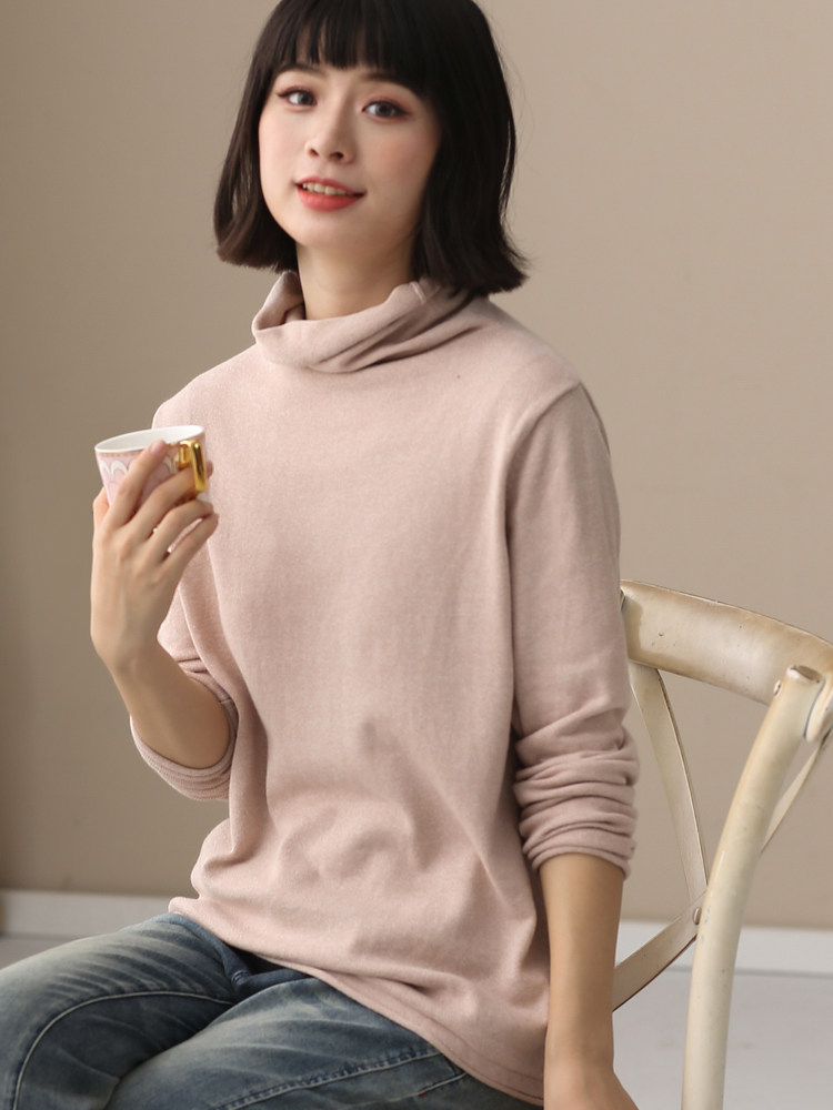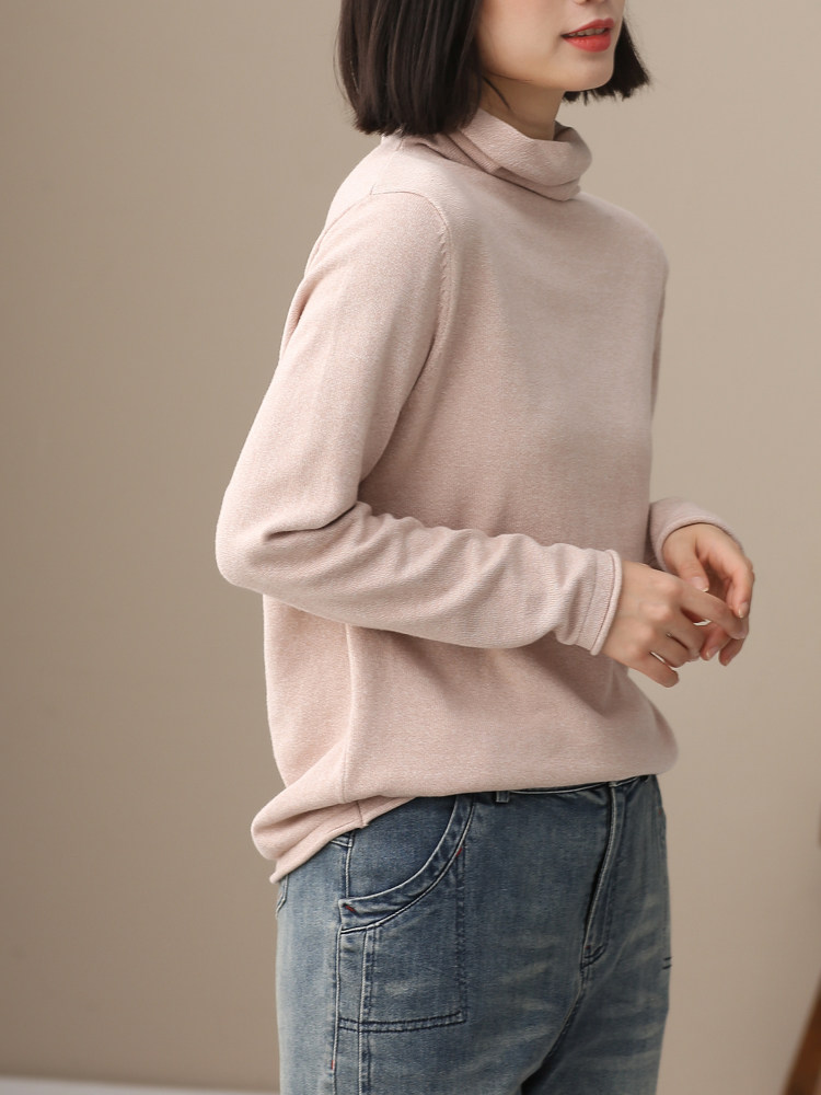 不起球 純棉針織衫女高領原創文藝寬鬆休閒打底衫堆堆領毛衣