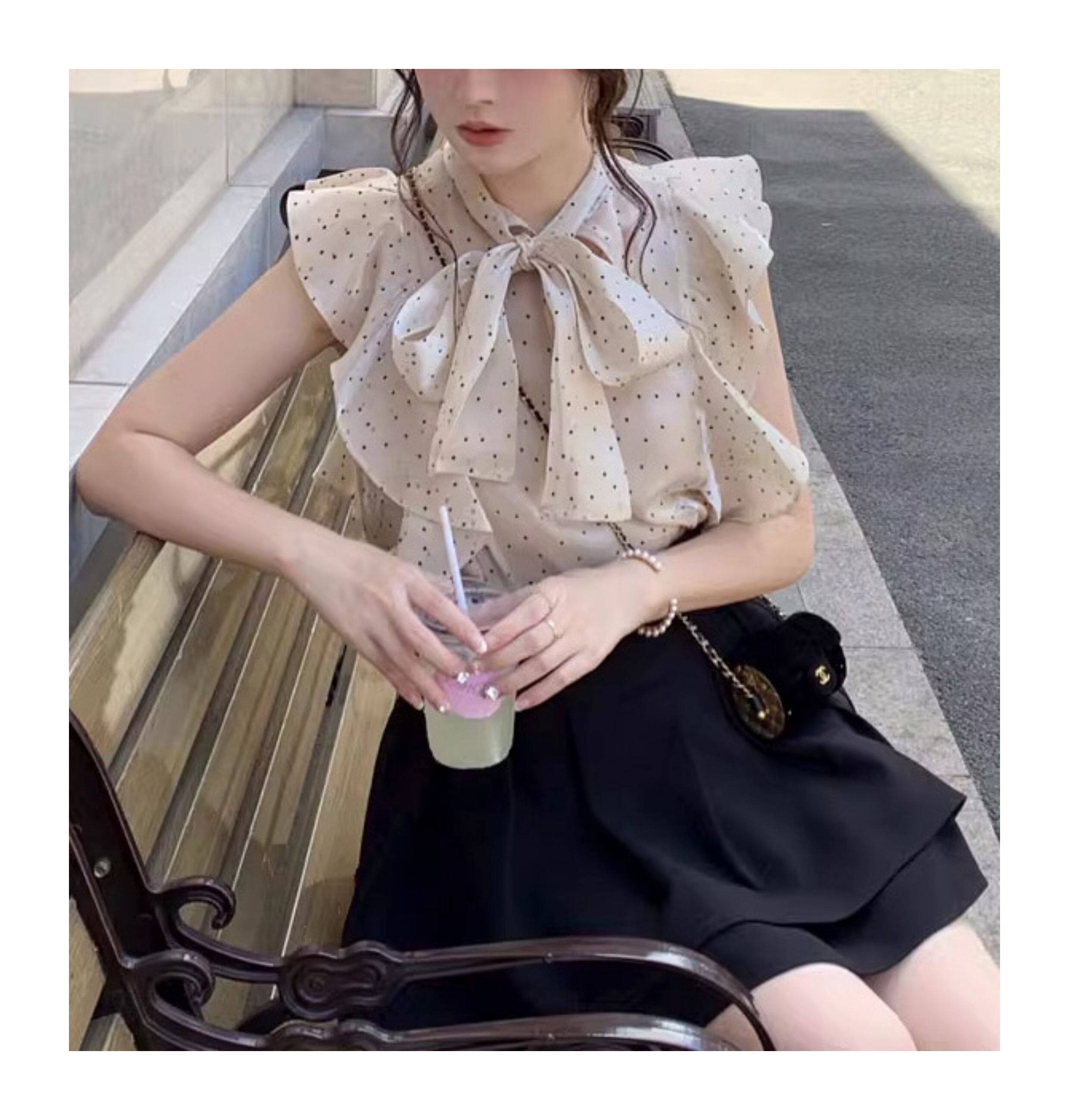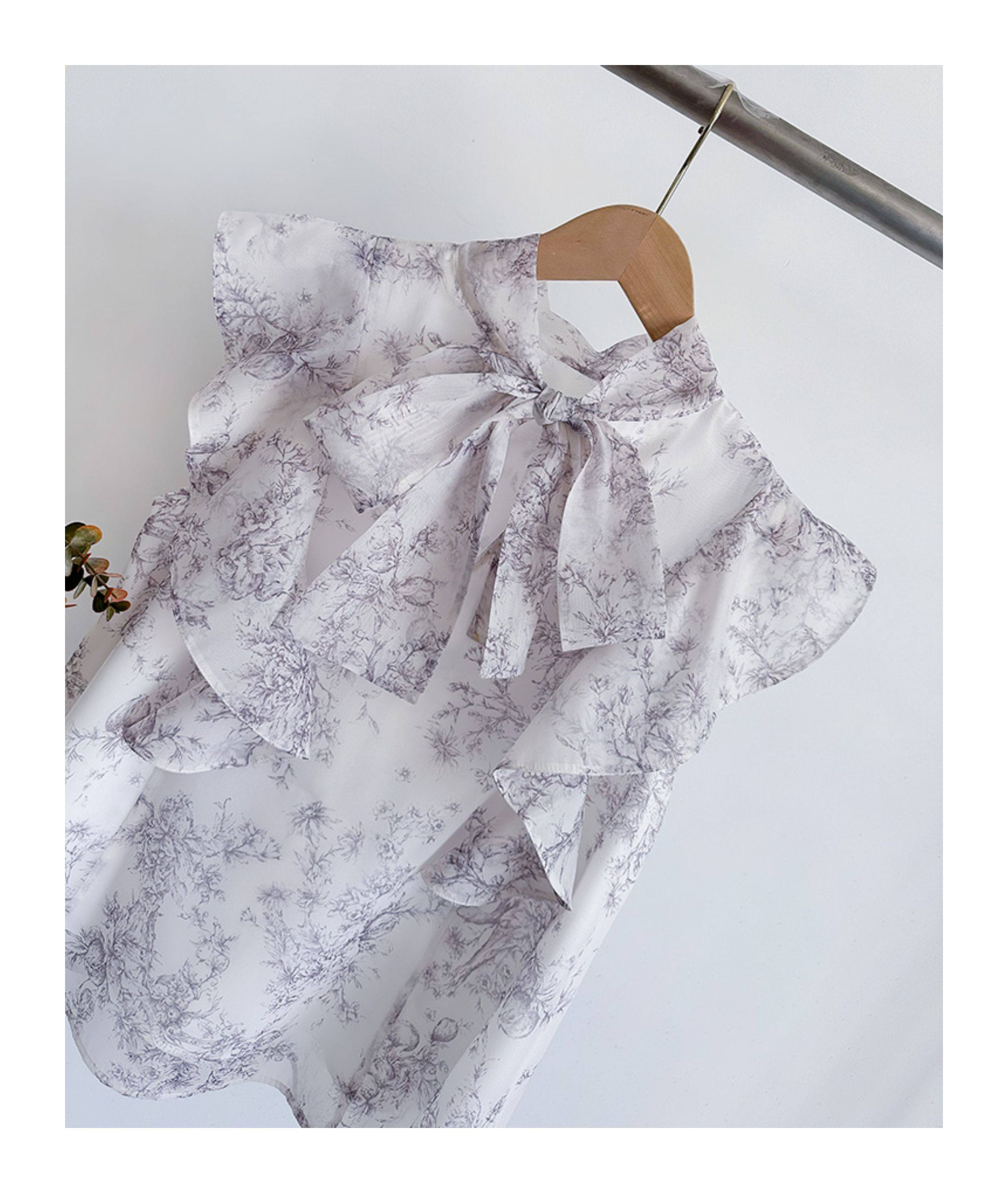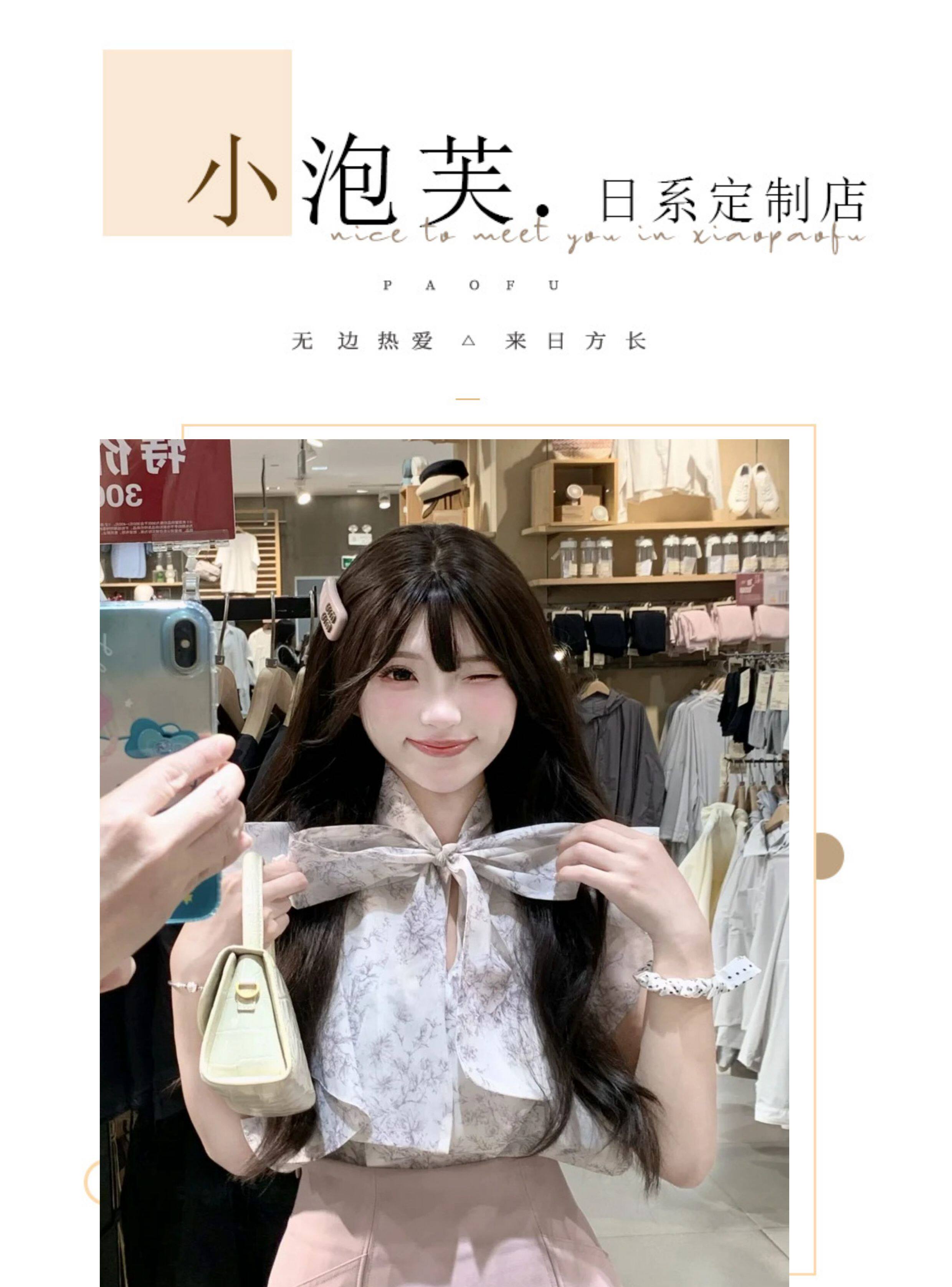 小泡芙日系春夏新款女裝時尚甜美印花小飛袖蝴蝶結系帶襯衫上衣女