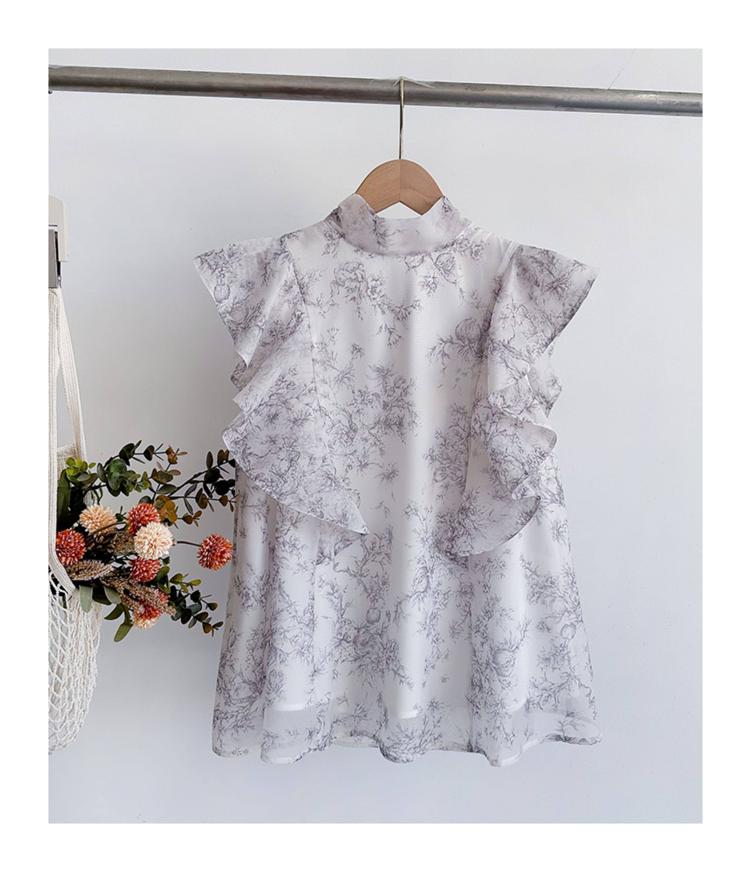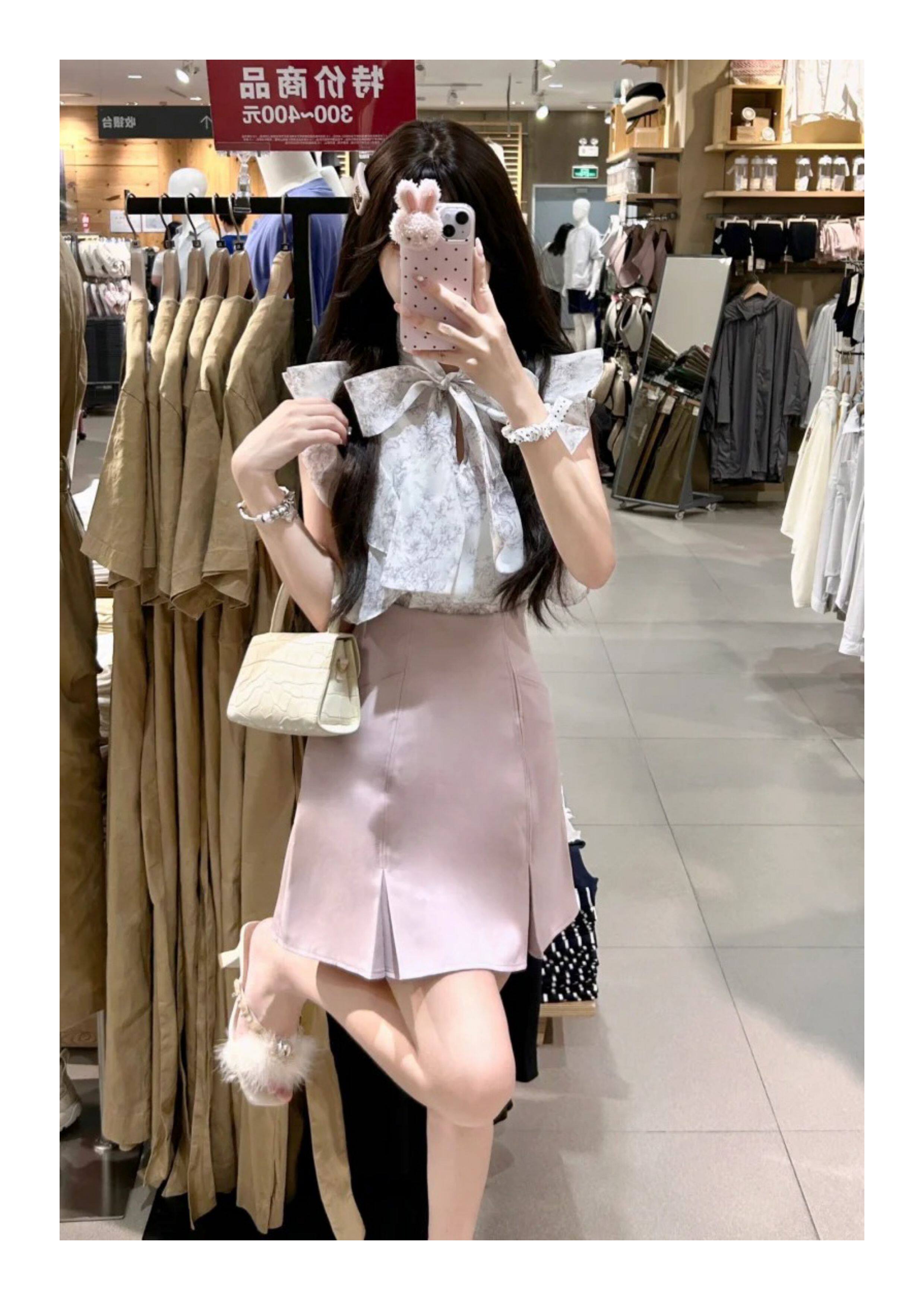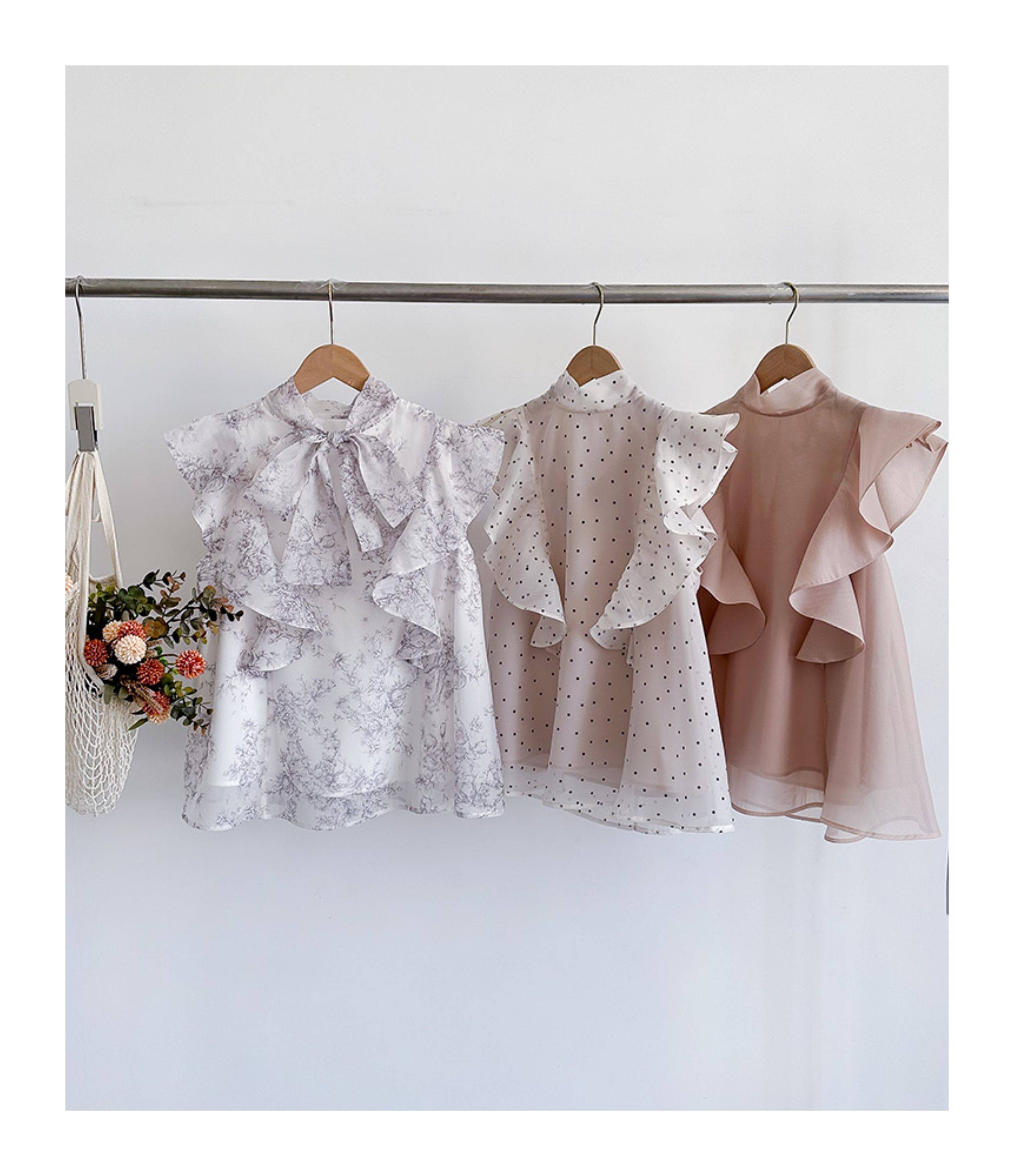 小泡芙日系春夏新款女裝時尚甜美印花小飛袖蝴蝶結系帶襯衫上衣女