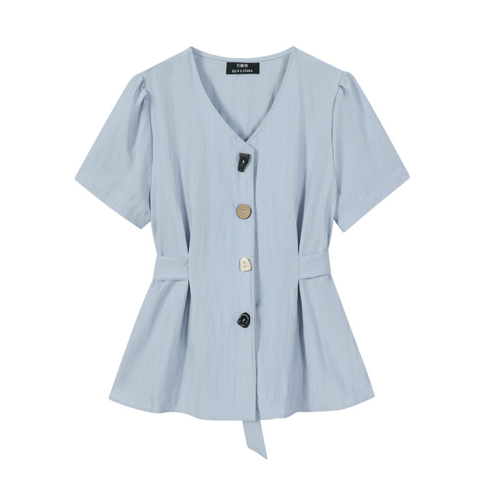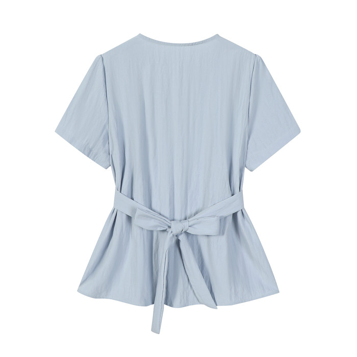 巧麗莎 韓裡韓氣小衫夏季正肩短袖襯衫蝴蝶結綁帶設計感v領上衣女