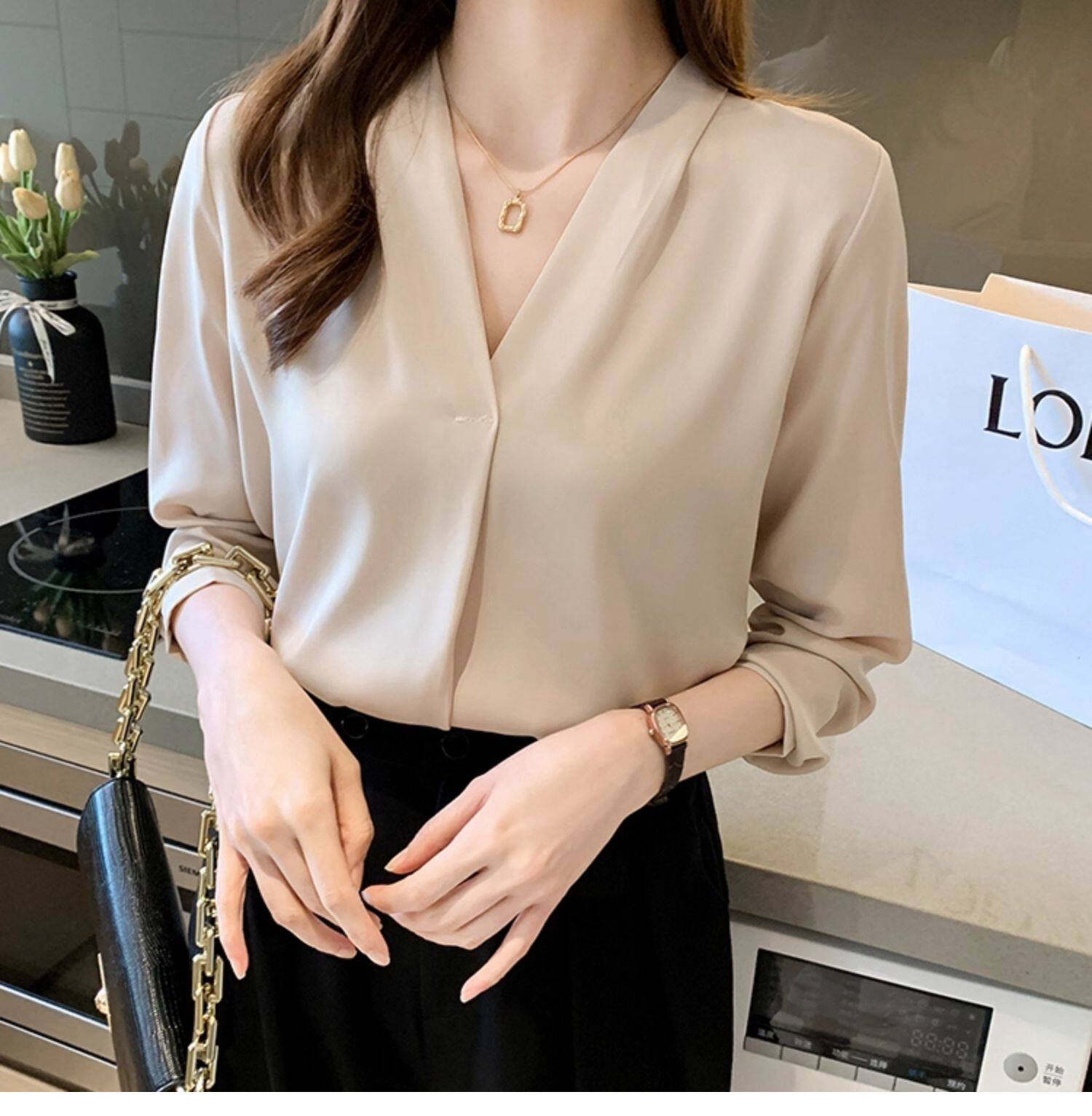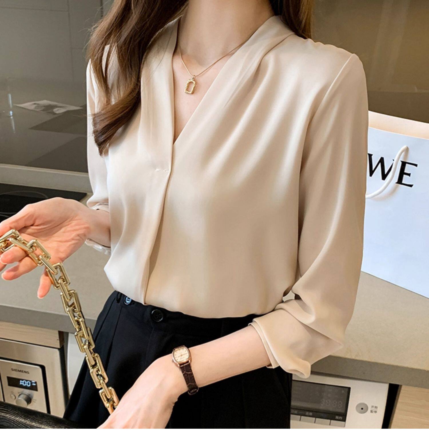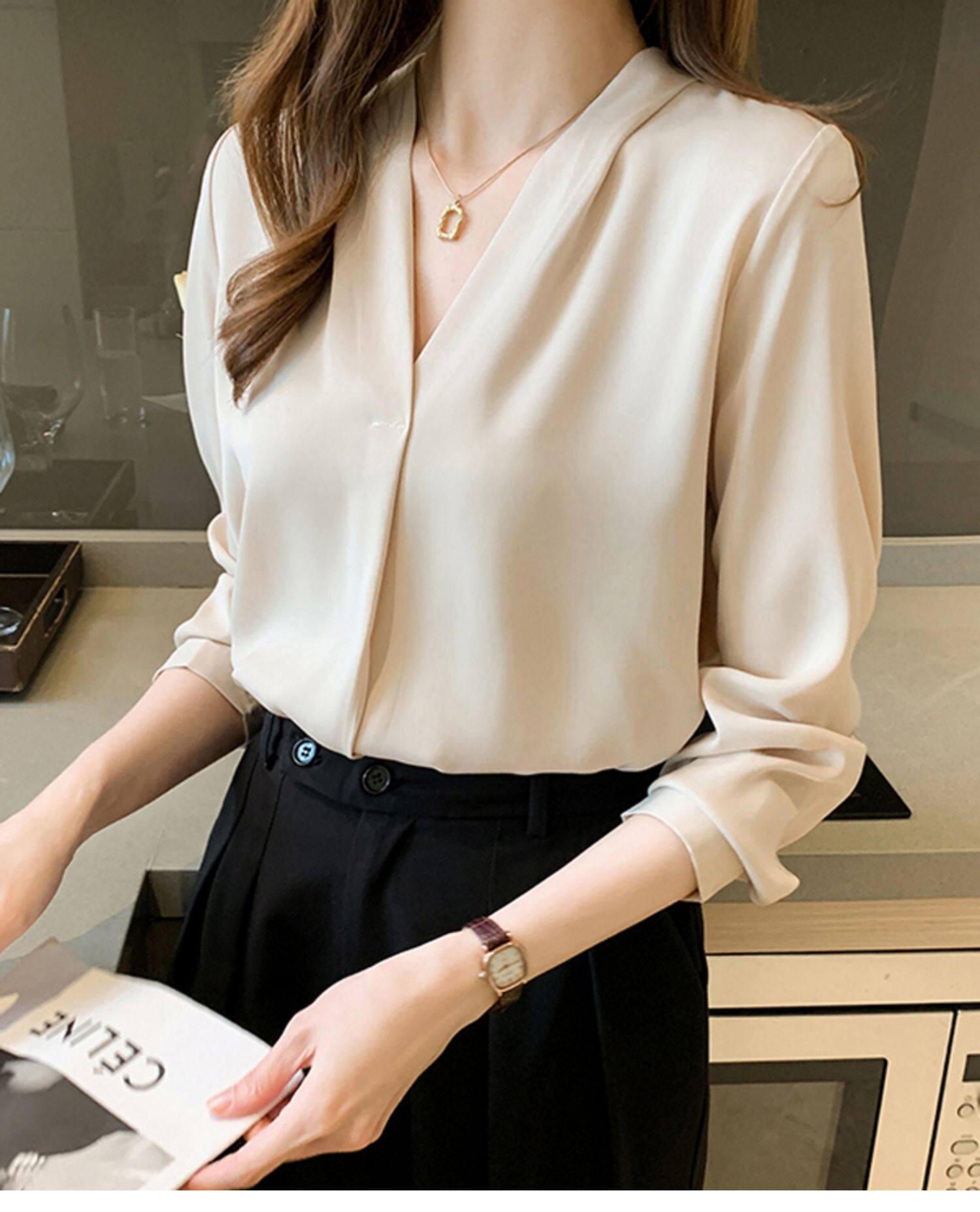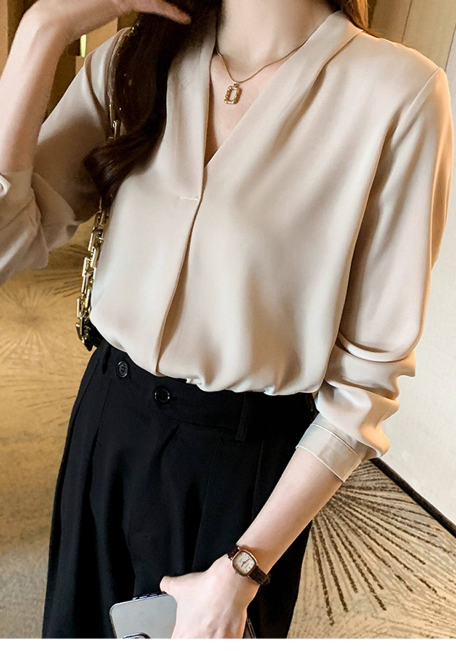 緞面雪紡襯衫女西裝內搭高級感上衣春秋職業v領2026新款杏色襯衣