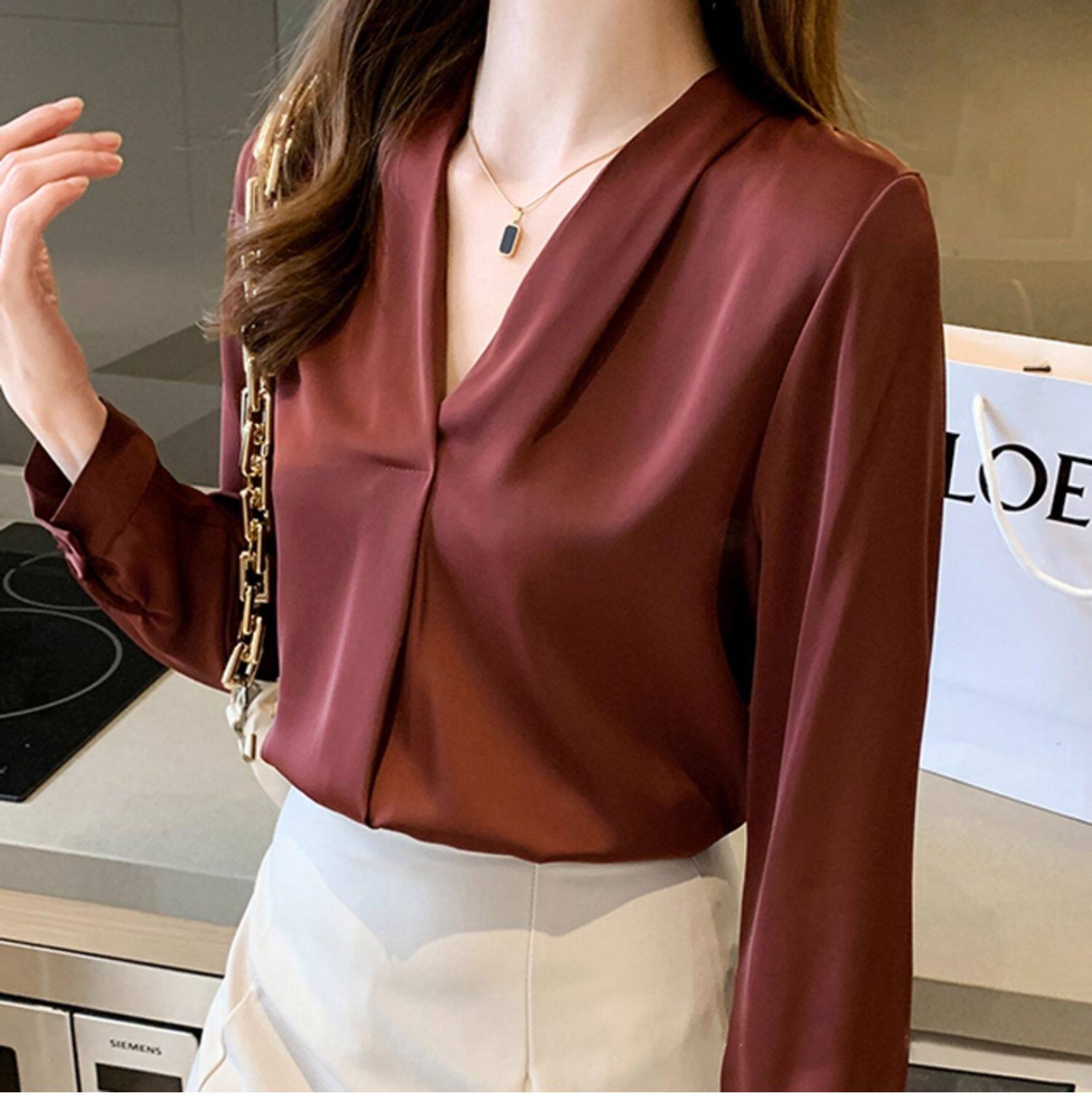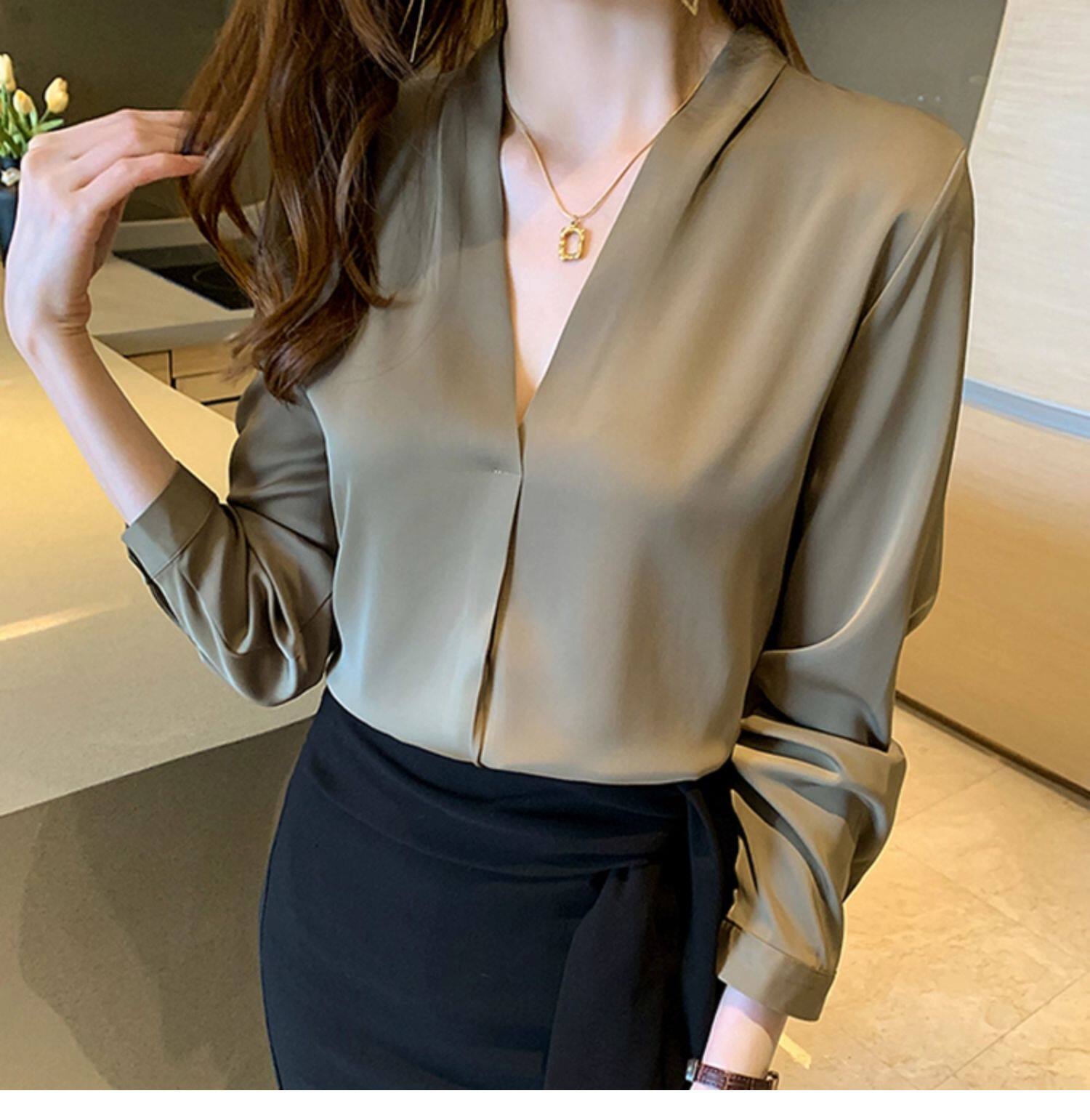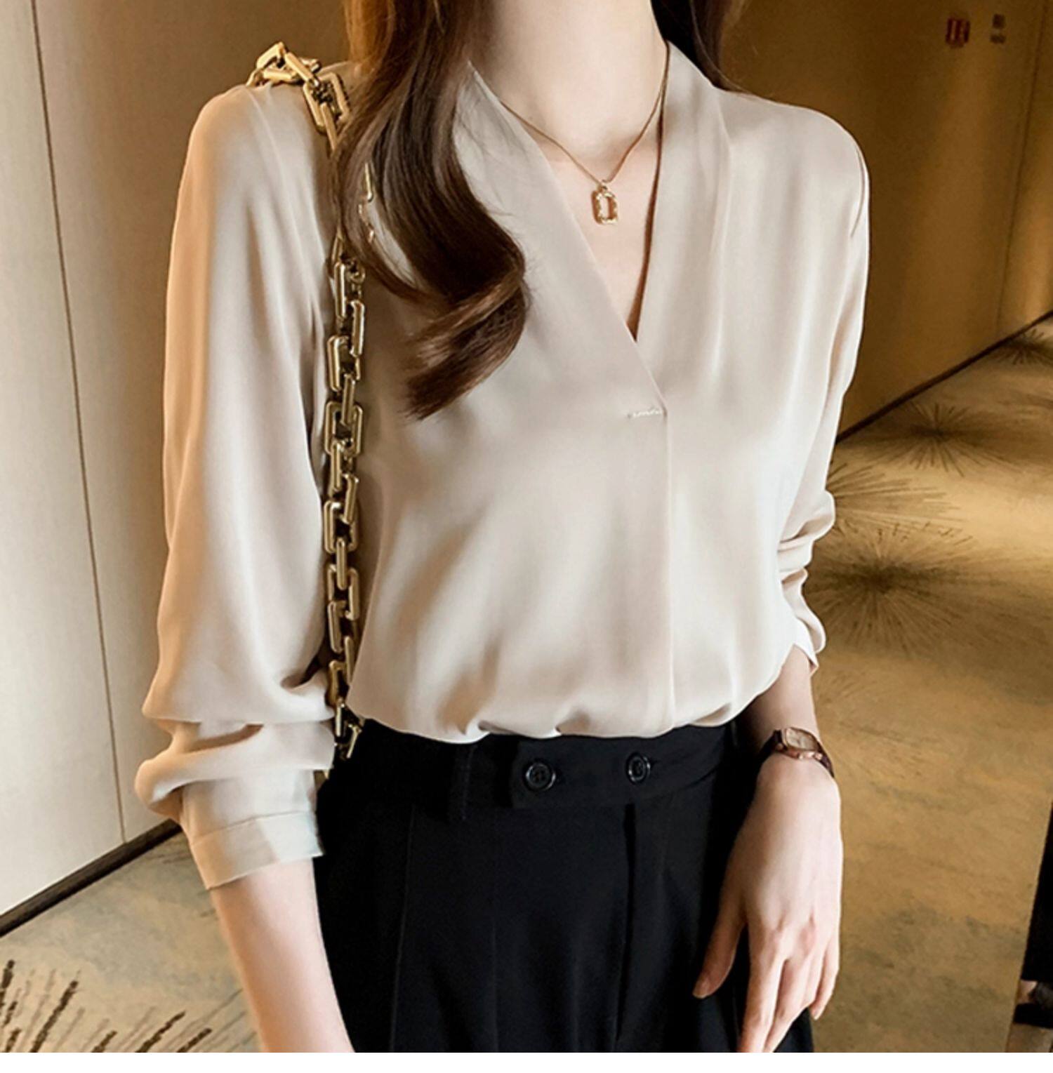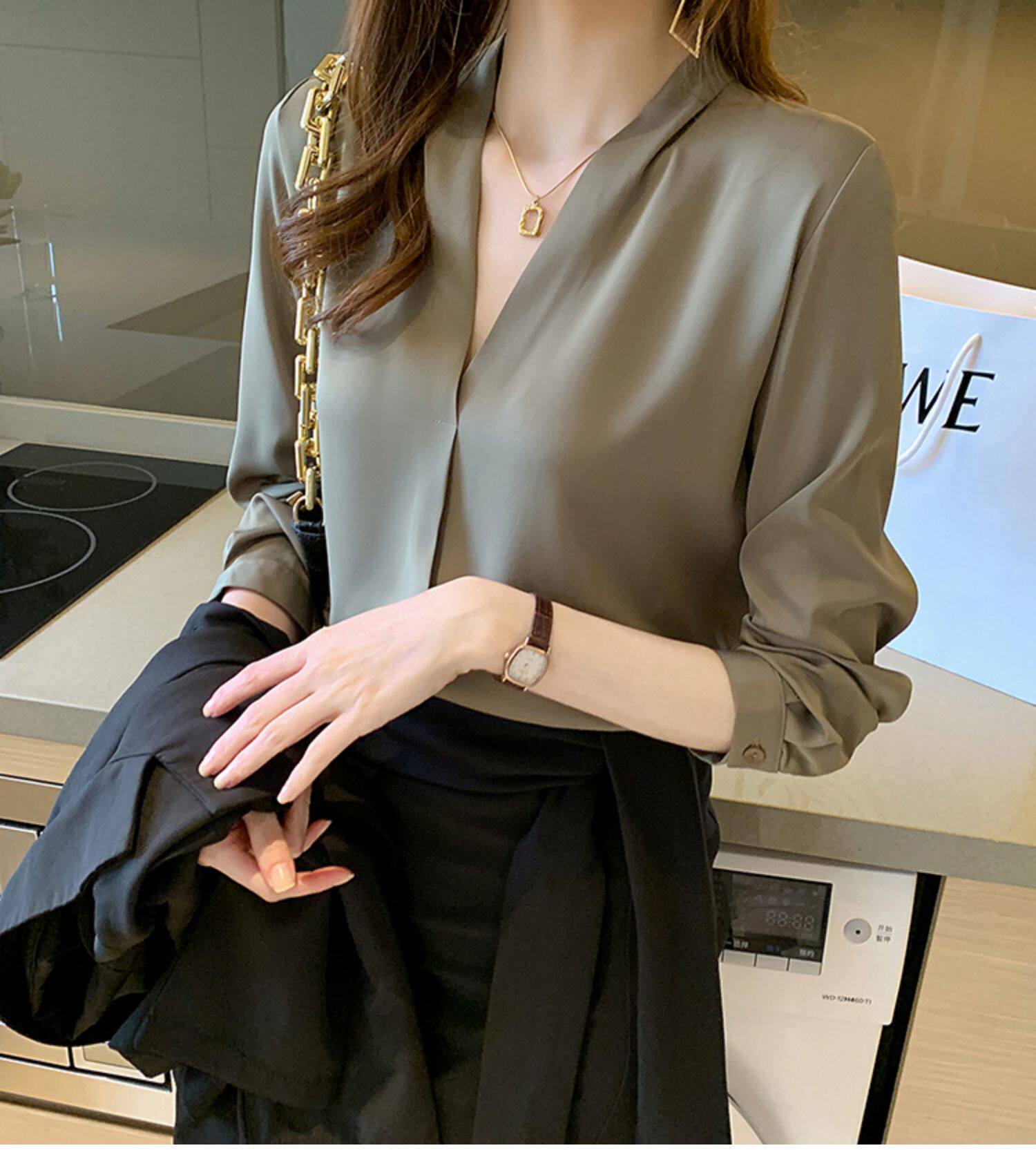 緞面雪紡襯衫女西裝內搭高級感上衣春秋職業v領2026新款杏色襯衣
