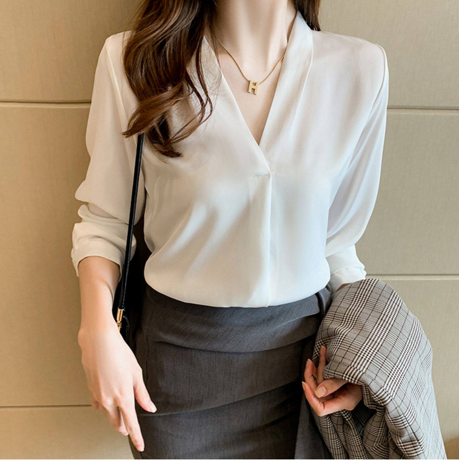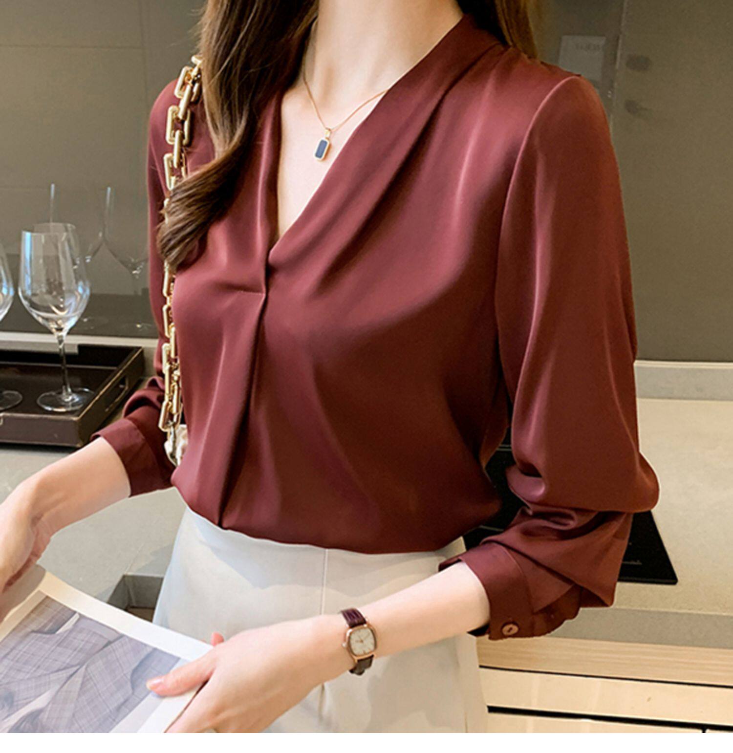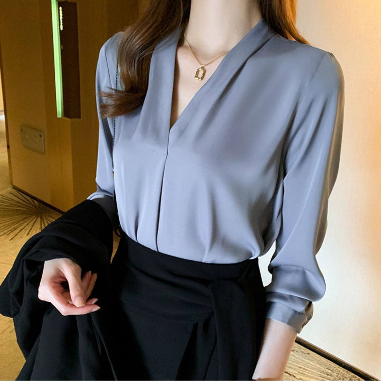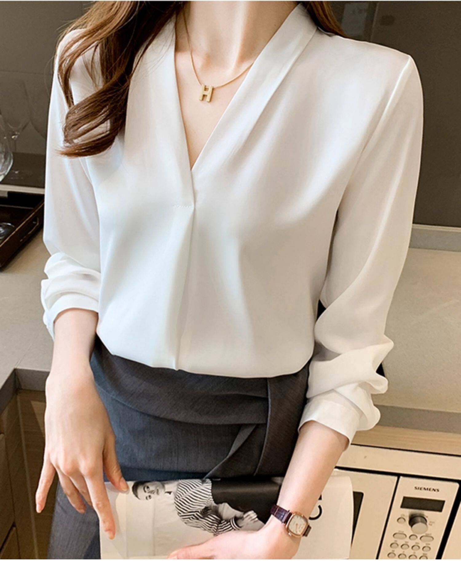 緞面雪紡襯衫女西裝內搭高級感上衣春秋職業v領2026新款杏色襯衣