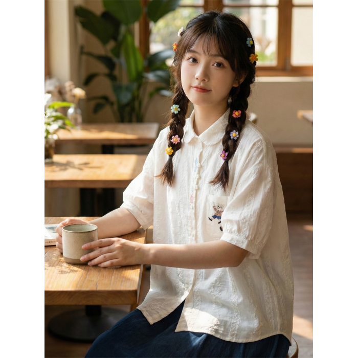 日系軟妹花藤麥穗刺綉短袖襯衫女彼得潘娃娃領前短後長小個子上衣