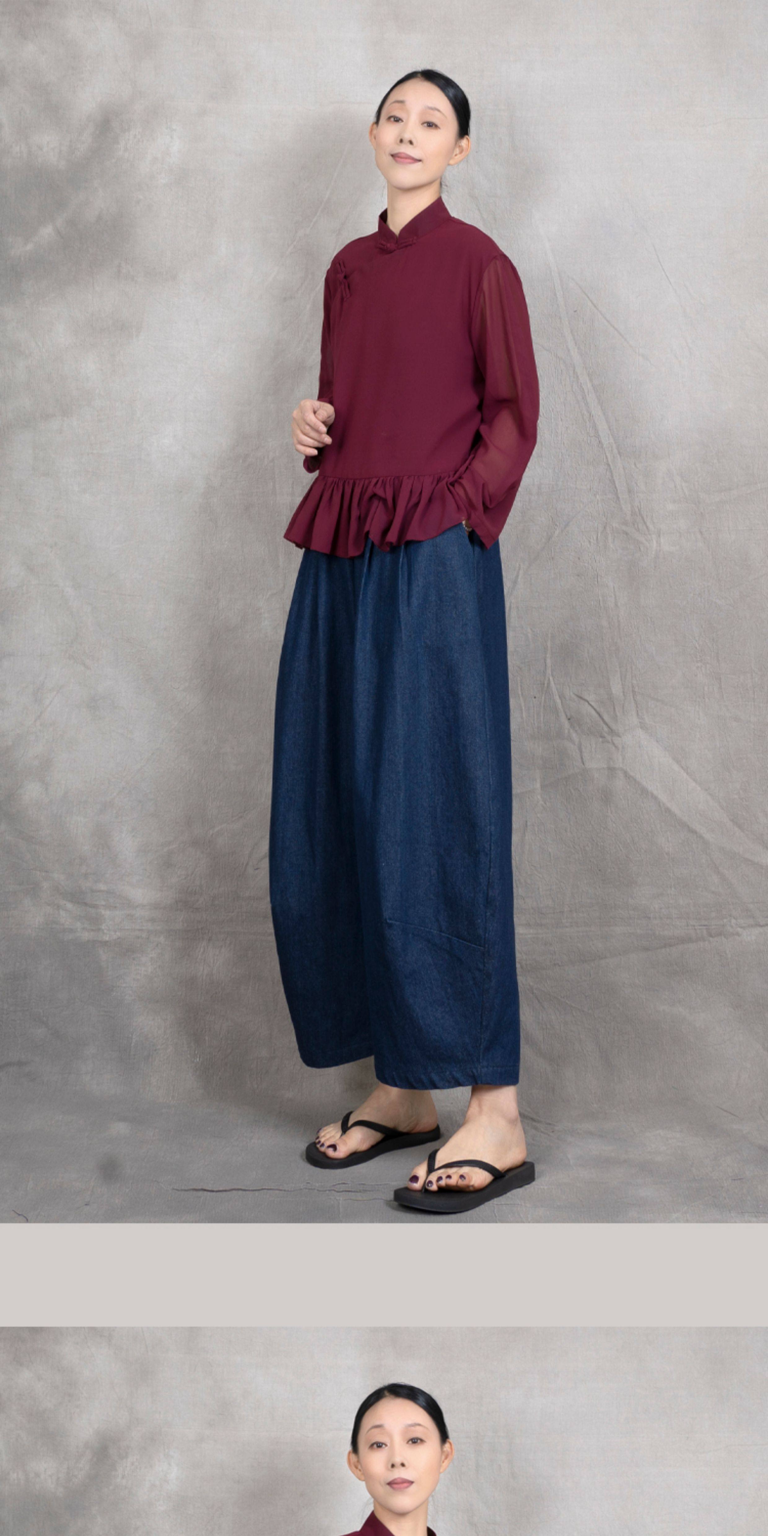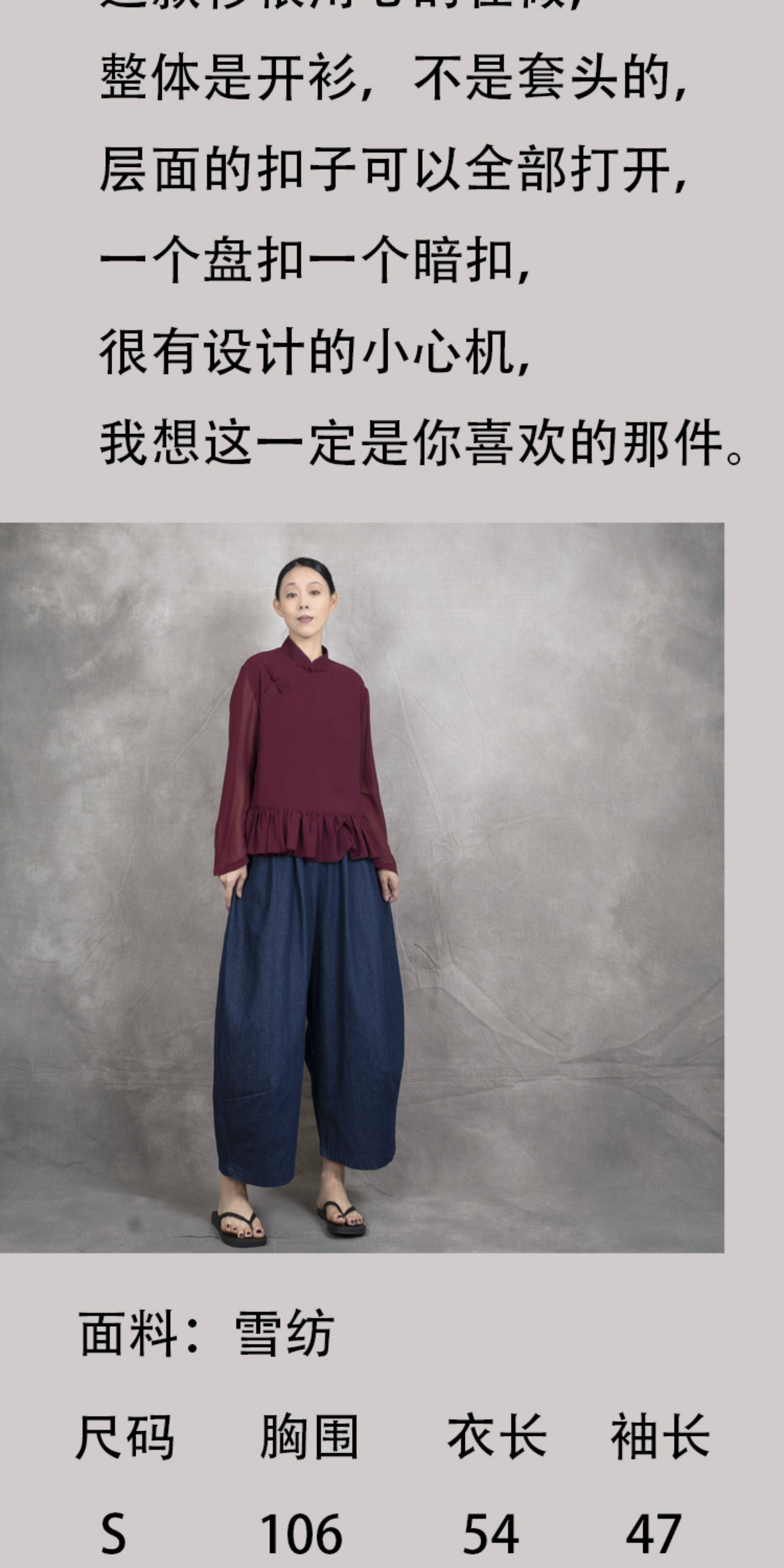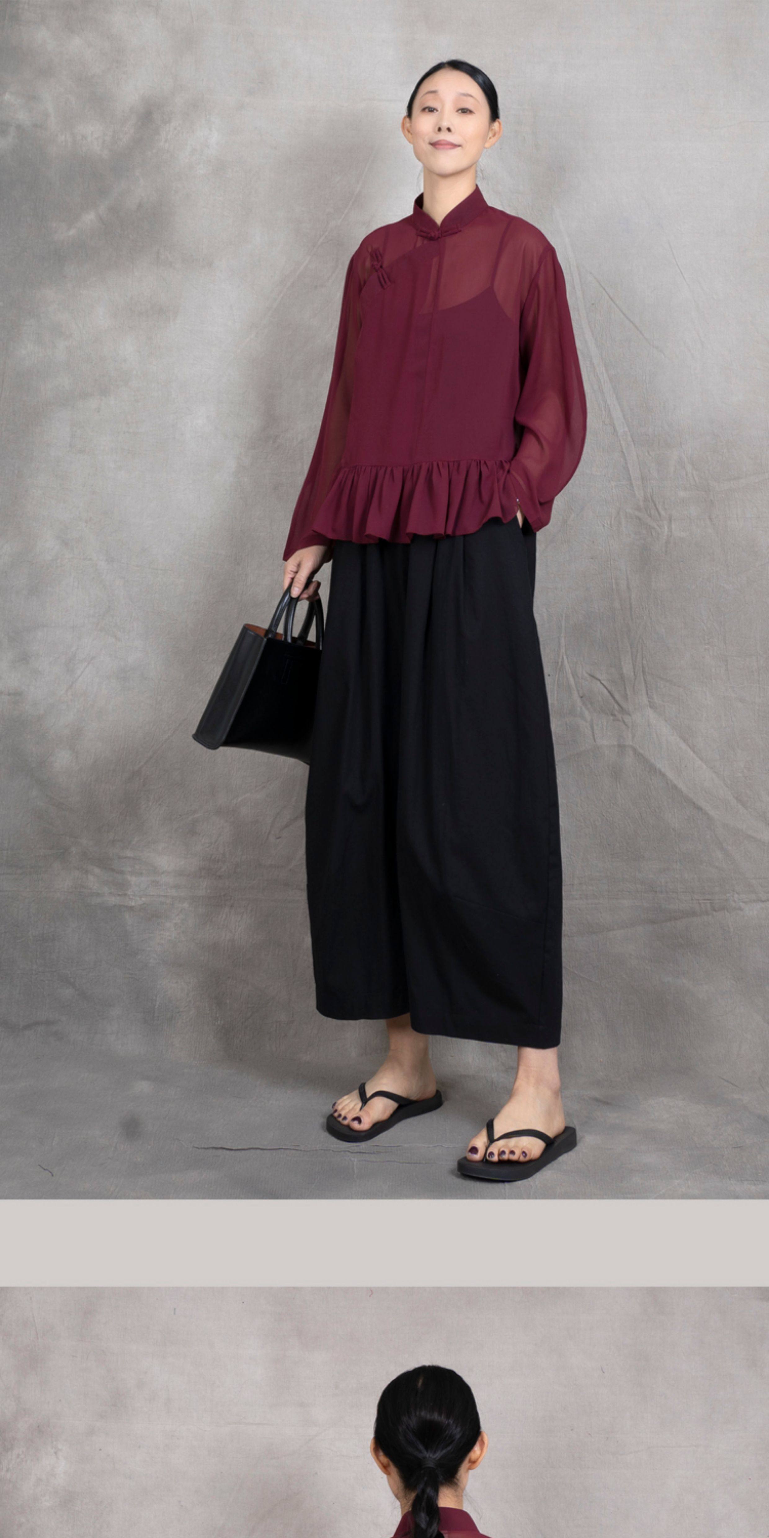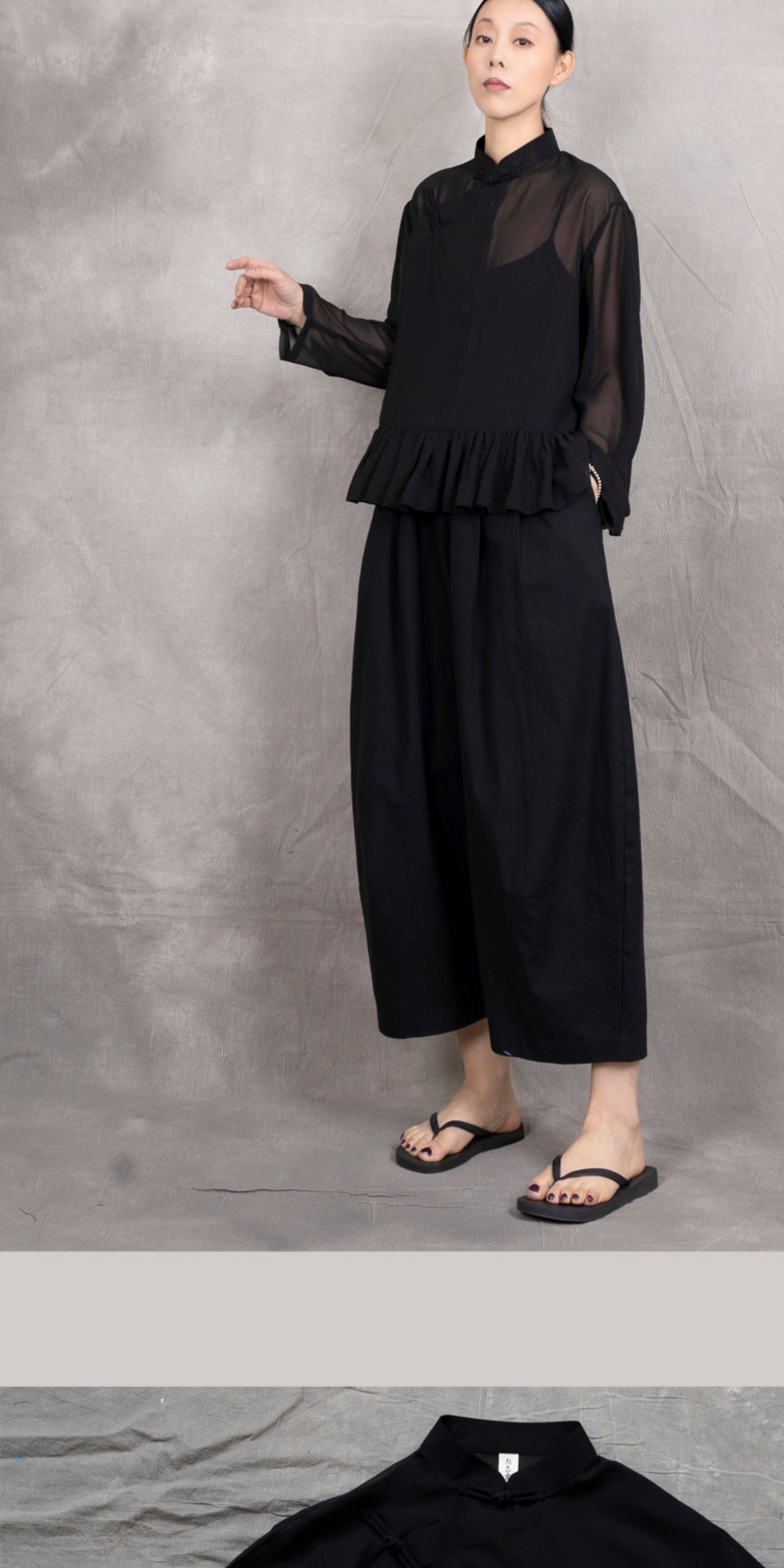 原創夏季女士寬鬆復古文藝輕薄雙層雪紡純色立領盤釦斜襟飛邊襯衫