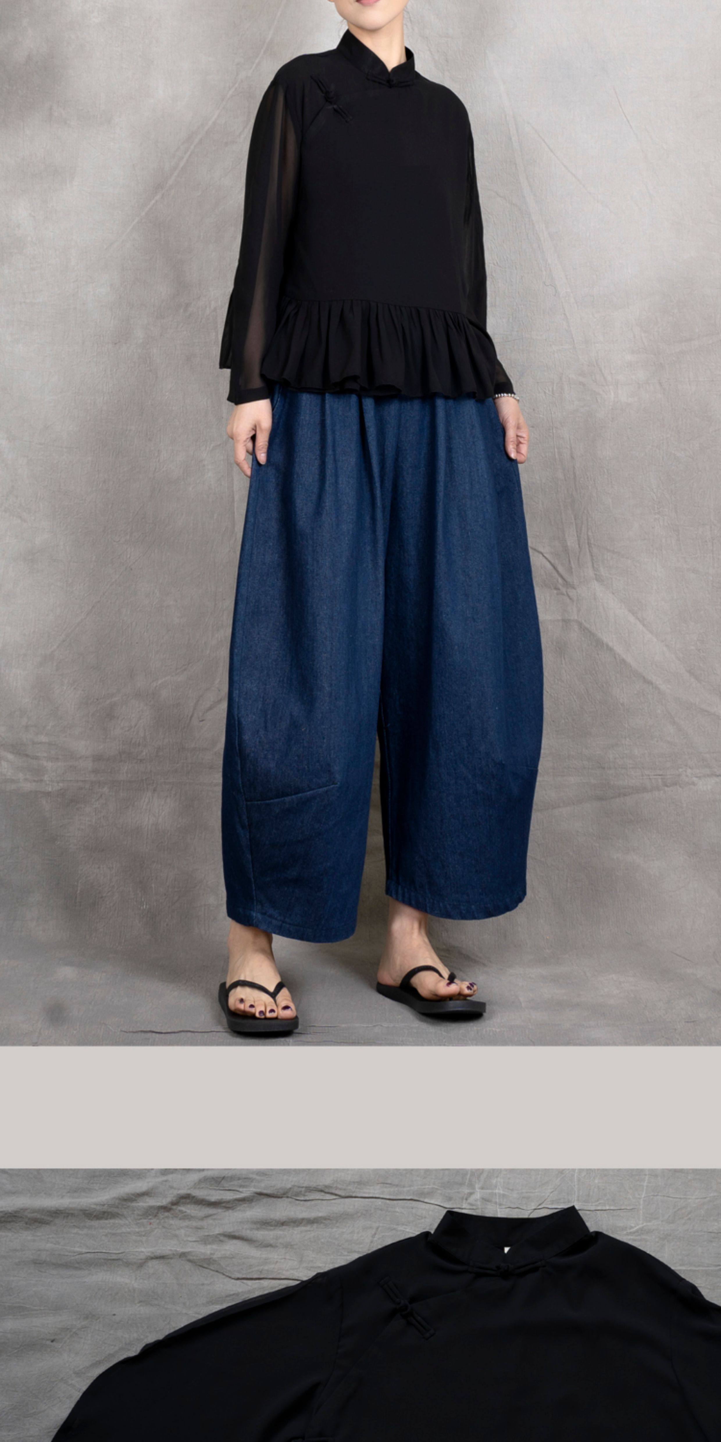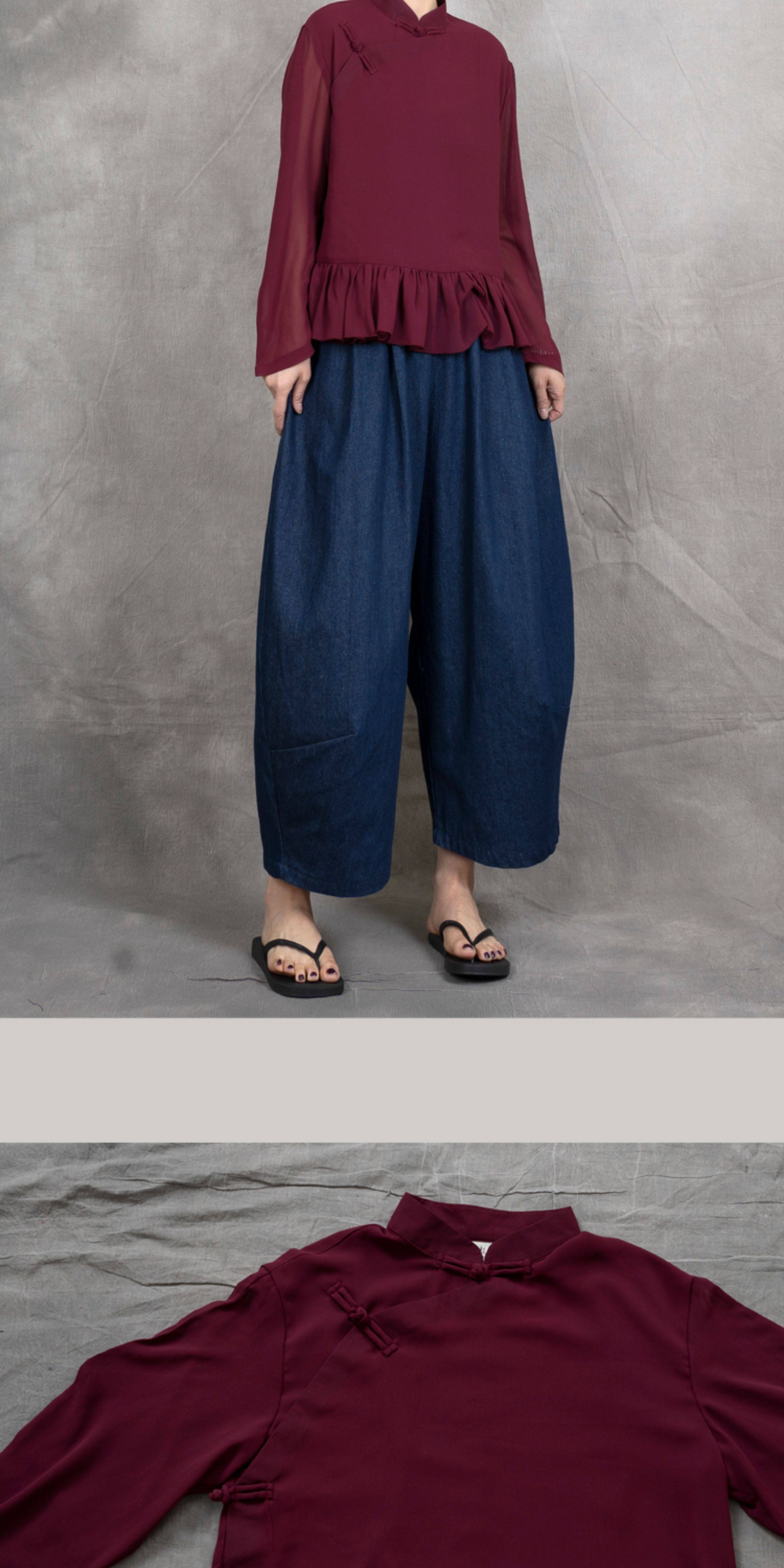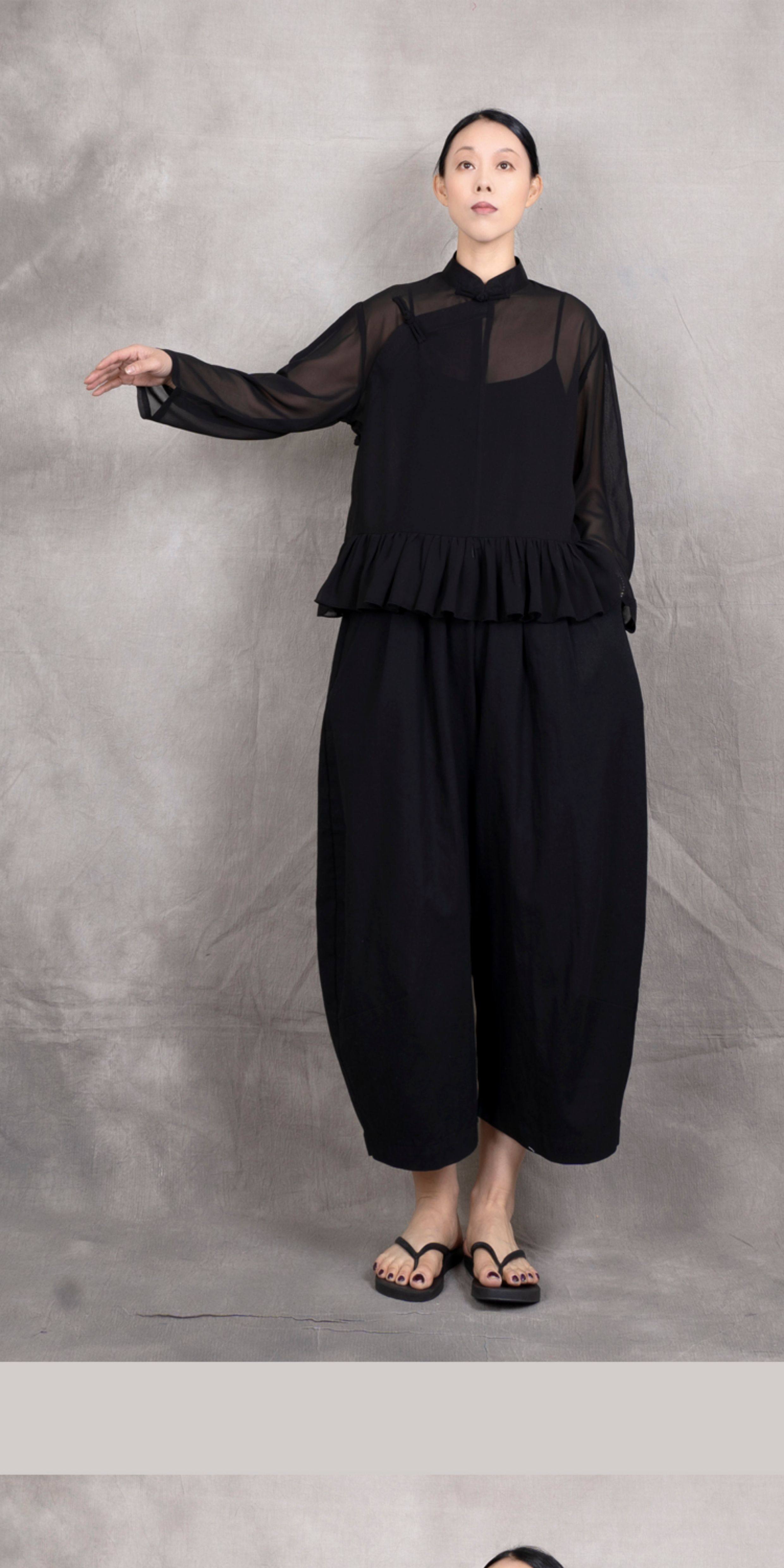 原創夏季女士寬鬆復古文藝輕薄雙層雪紡純色立領盤釦斜襟飛邊襯衫