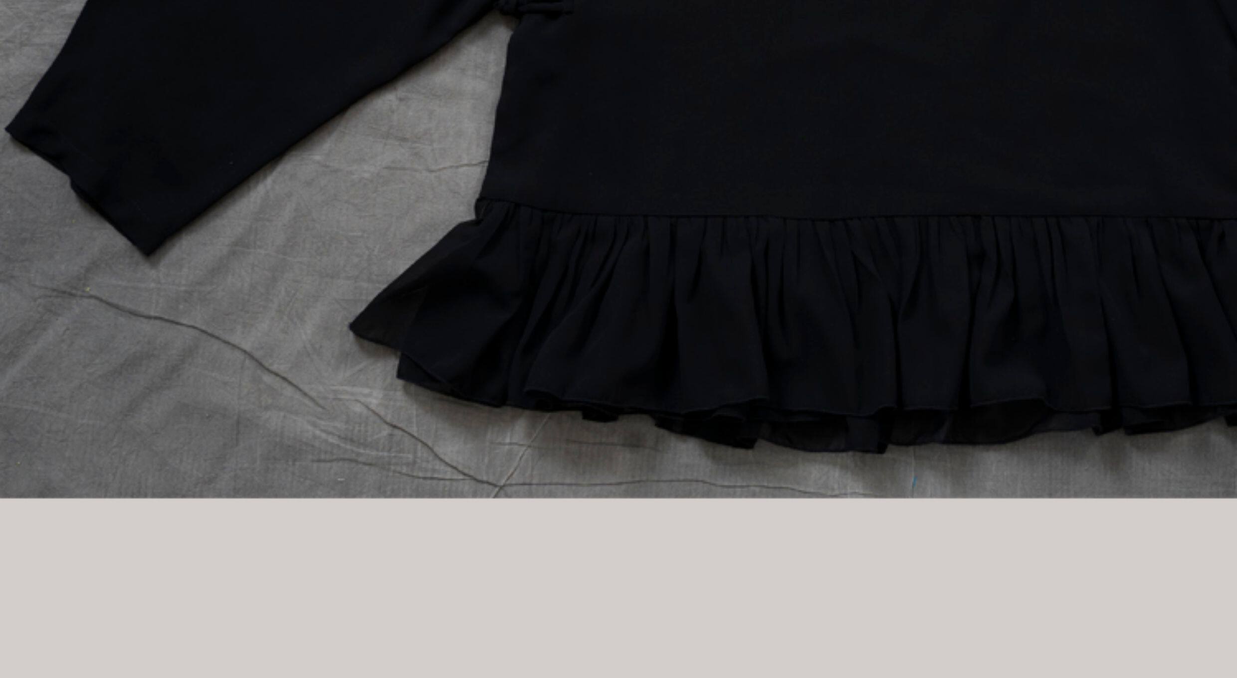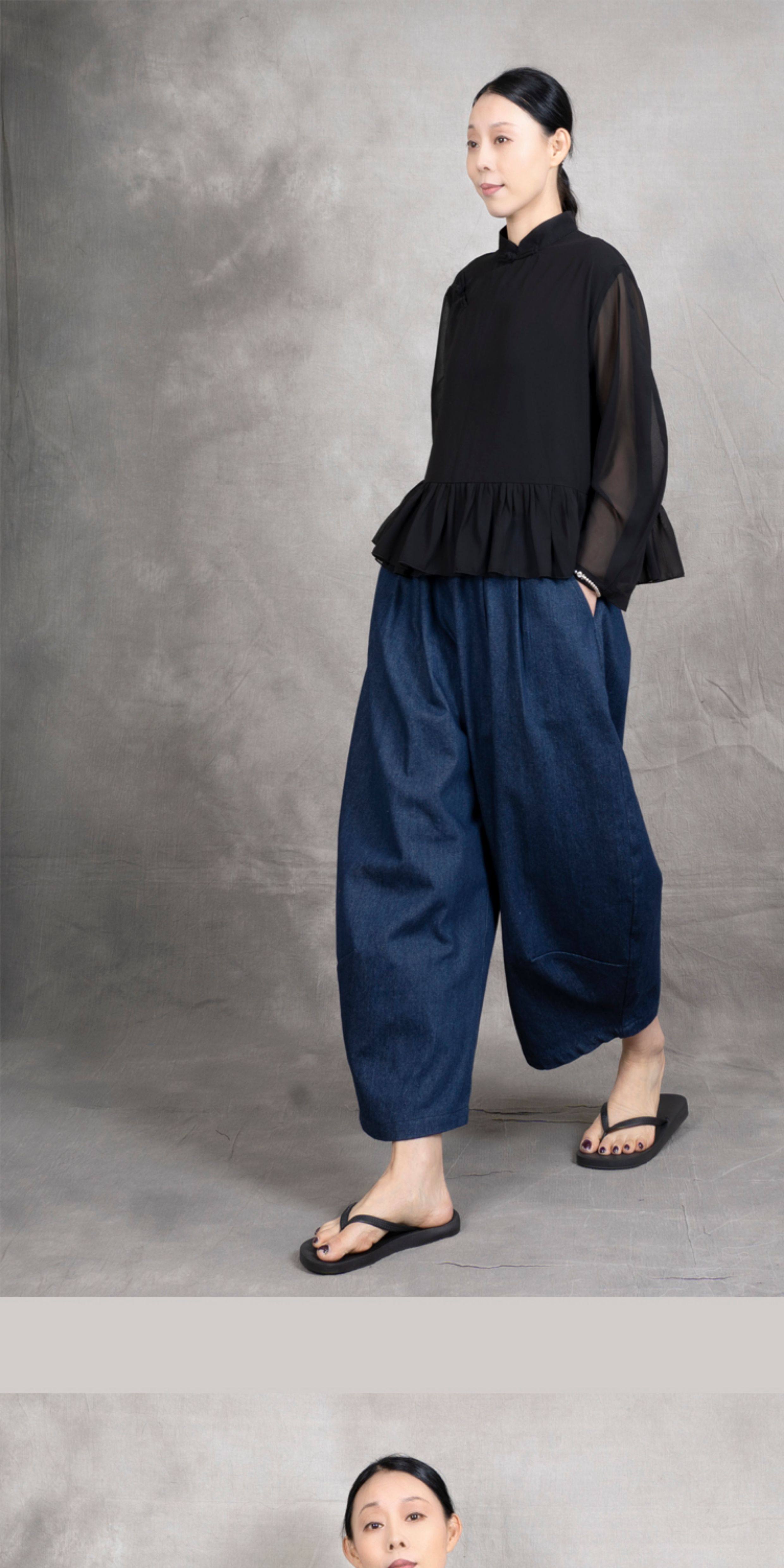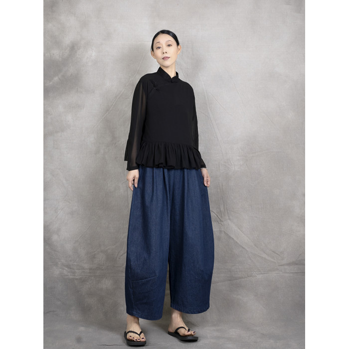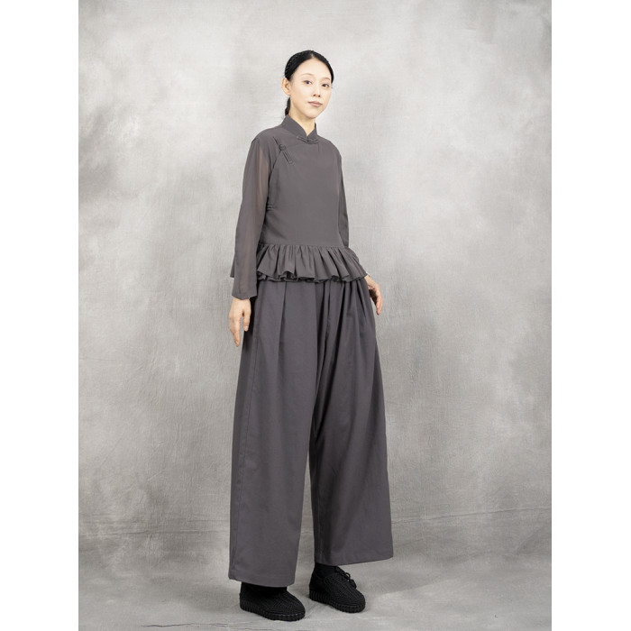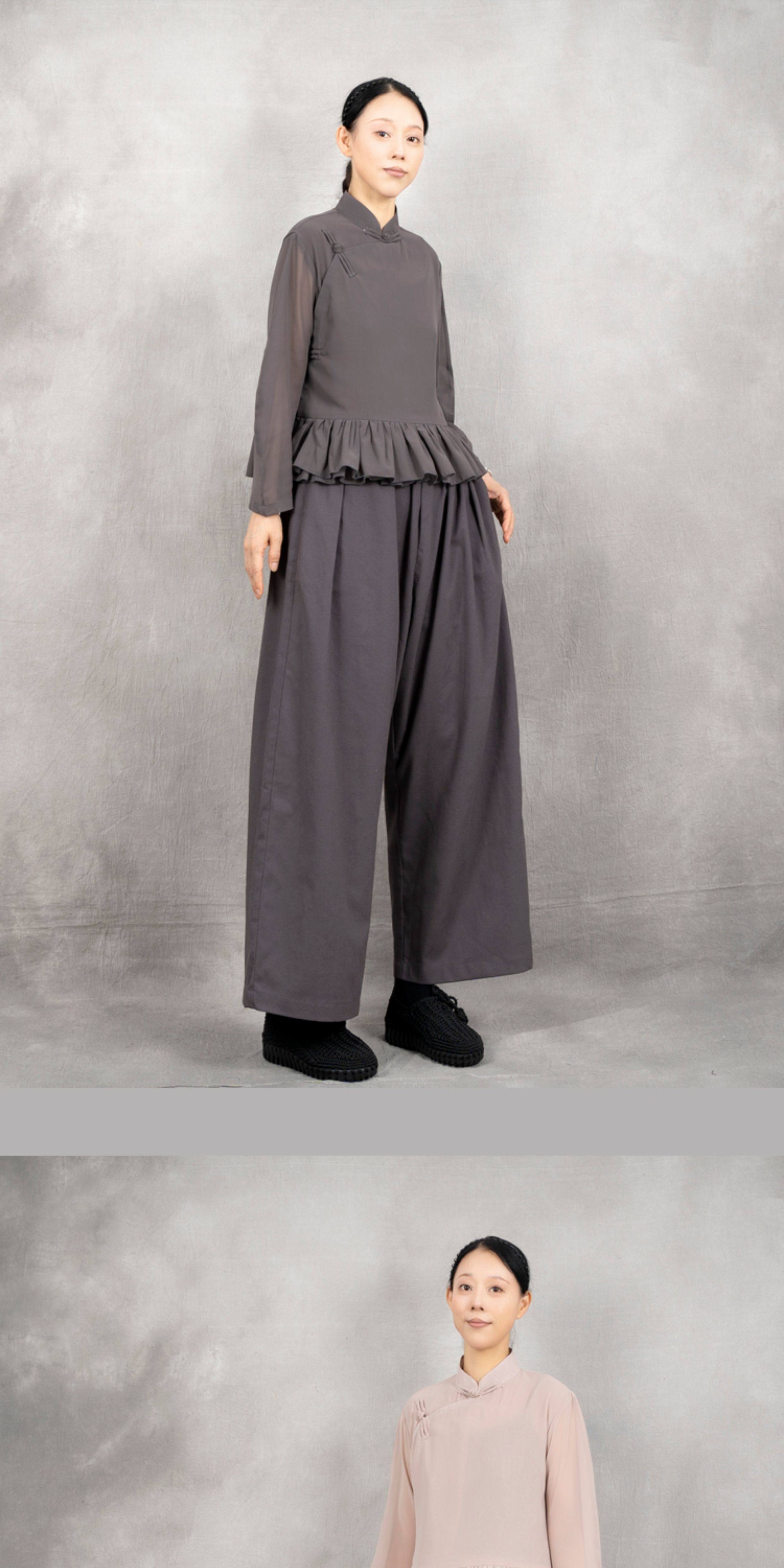 原創夏季女士寬鬆復古文藝輕薄雙層雪紡純色立領盤釦斜襟飛邊襯衫