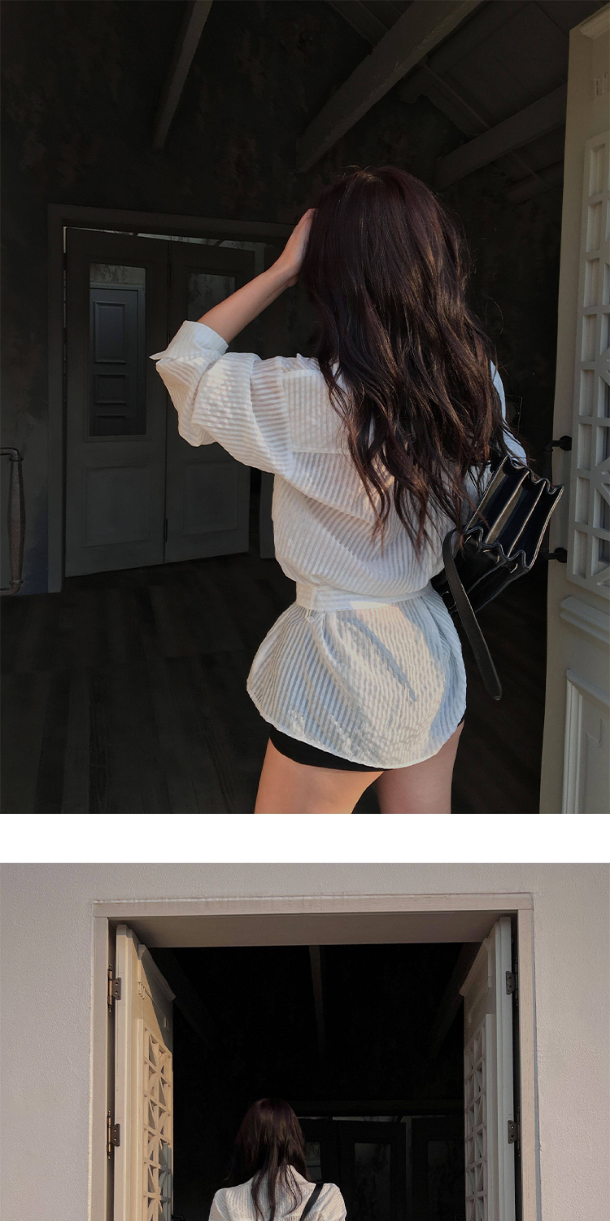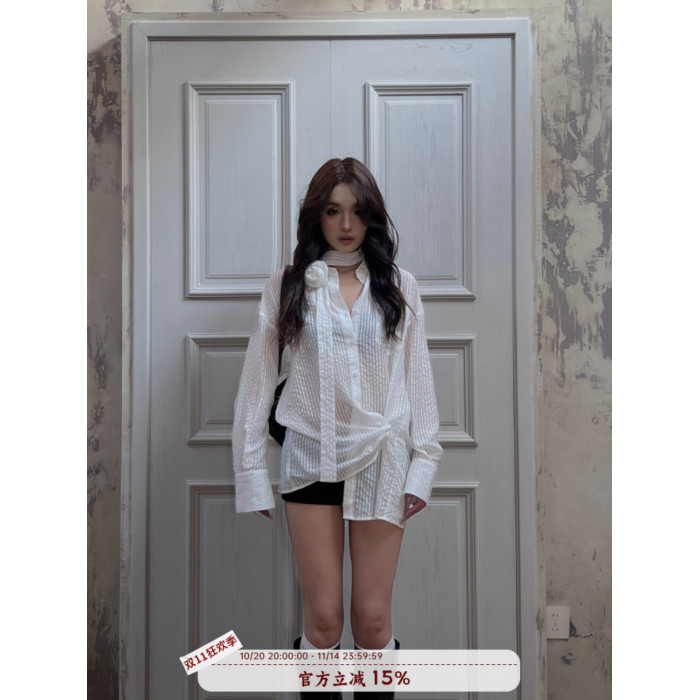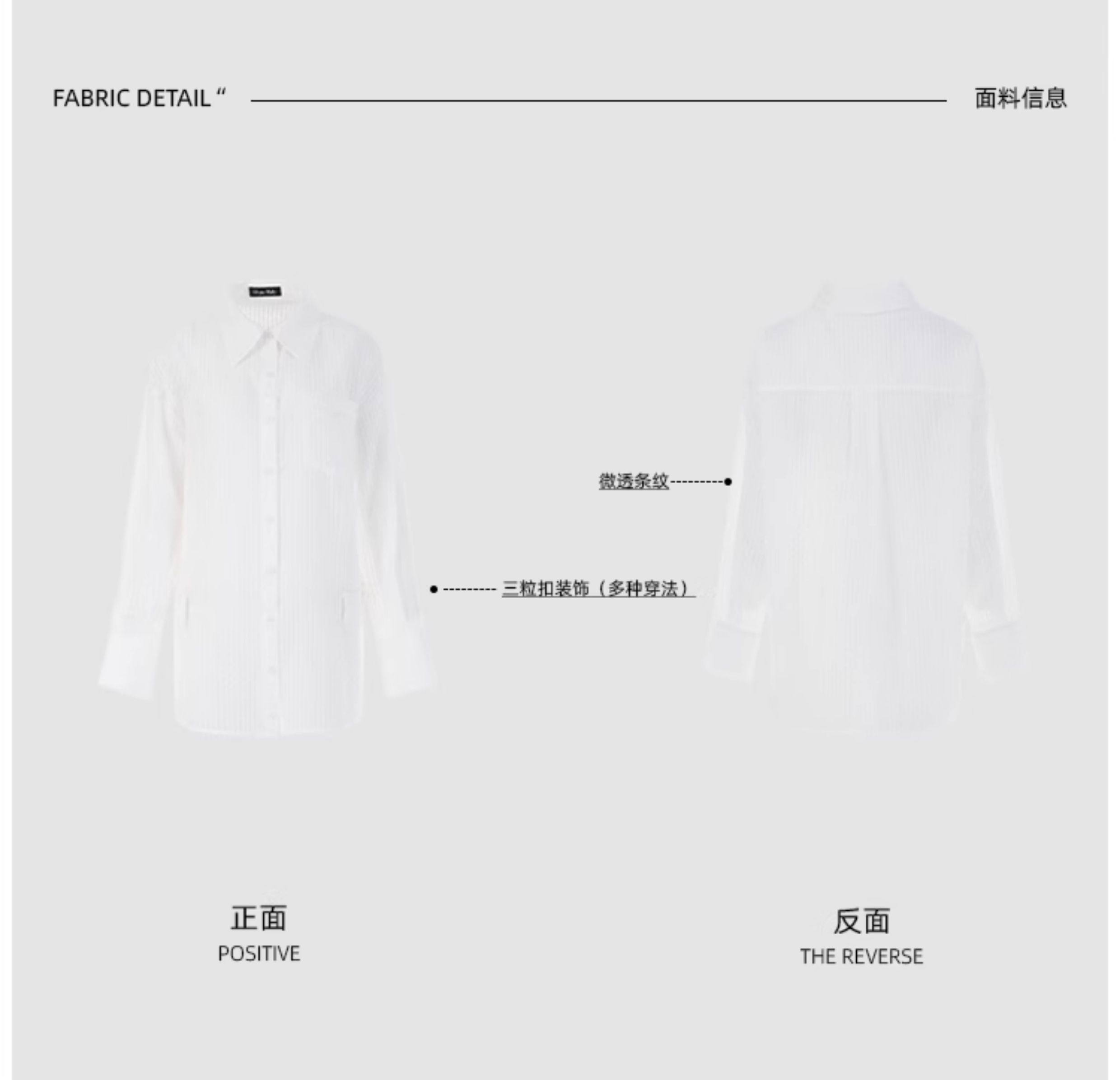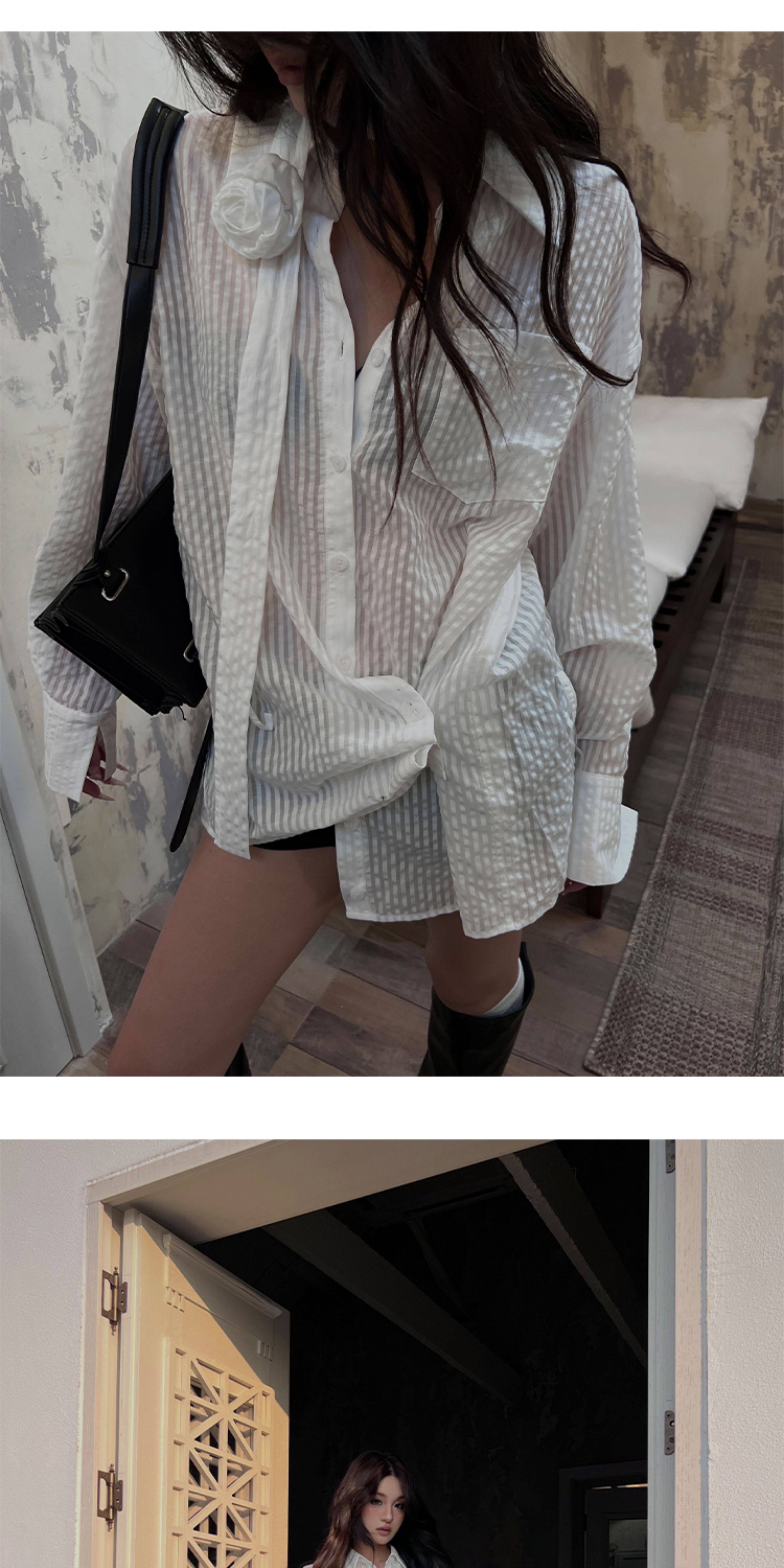 HYTEMOLY手工花朵腰側紐釦多穿法襯衫微透條紋寬鬆防曬長袖襯衣女