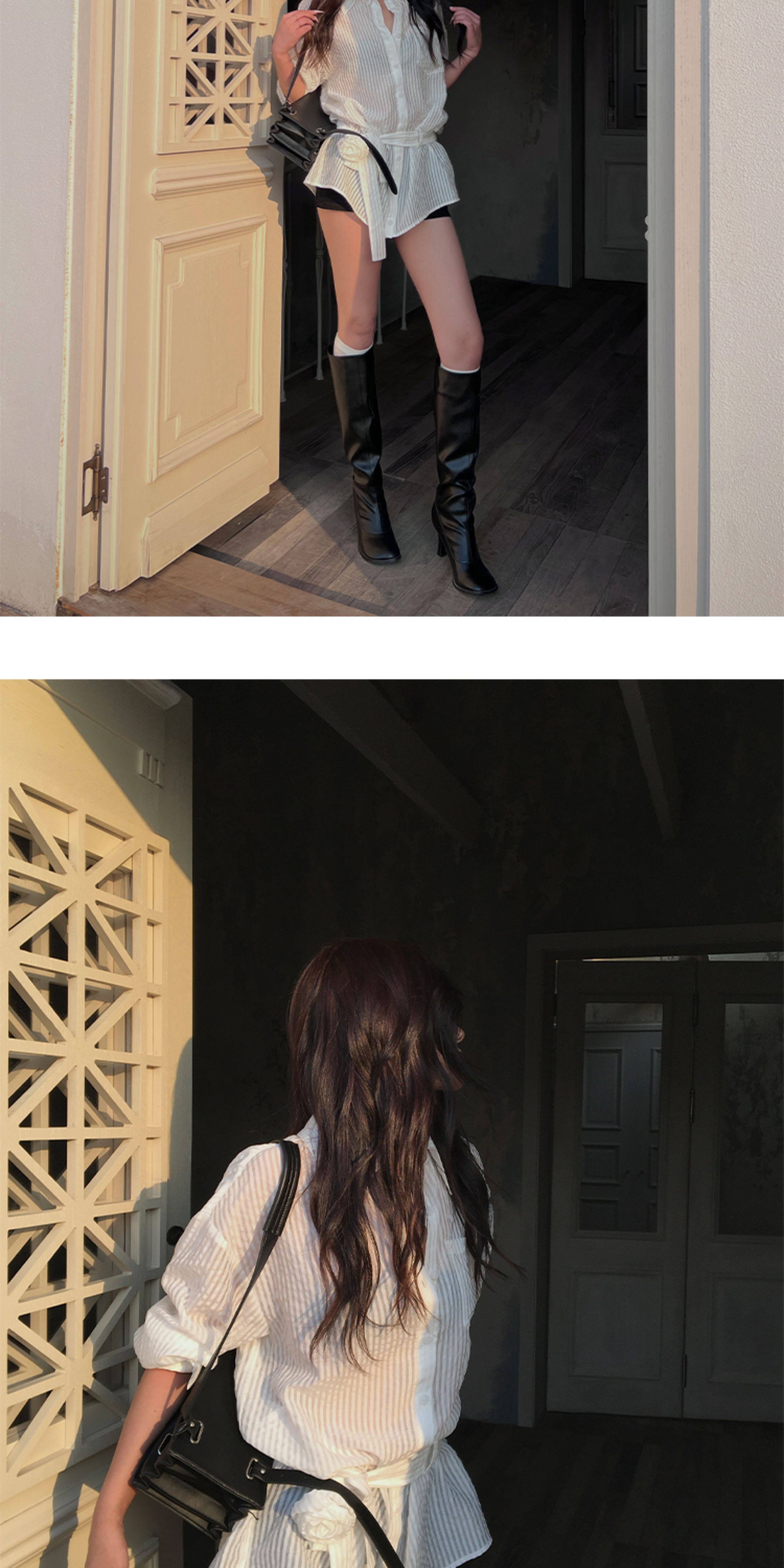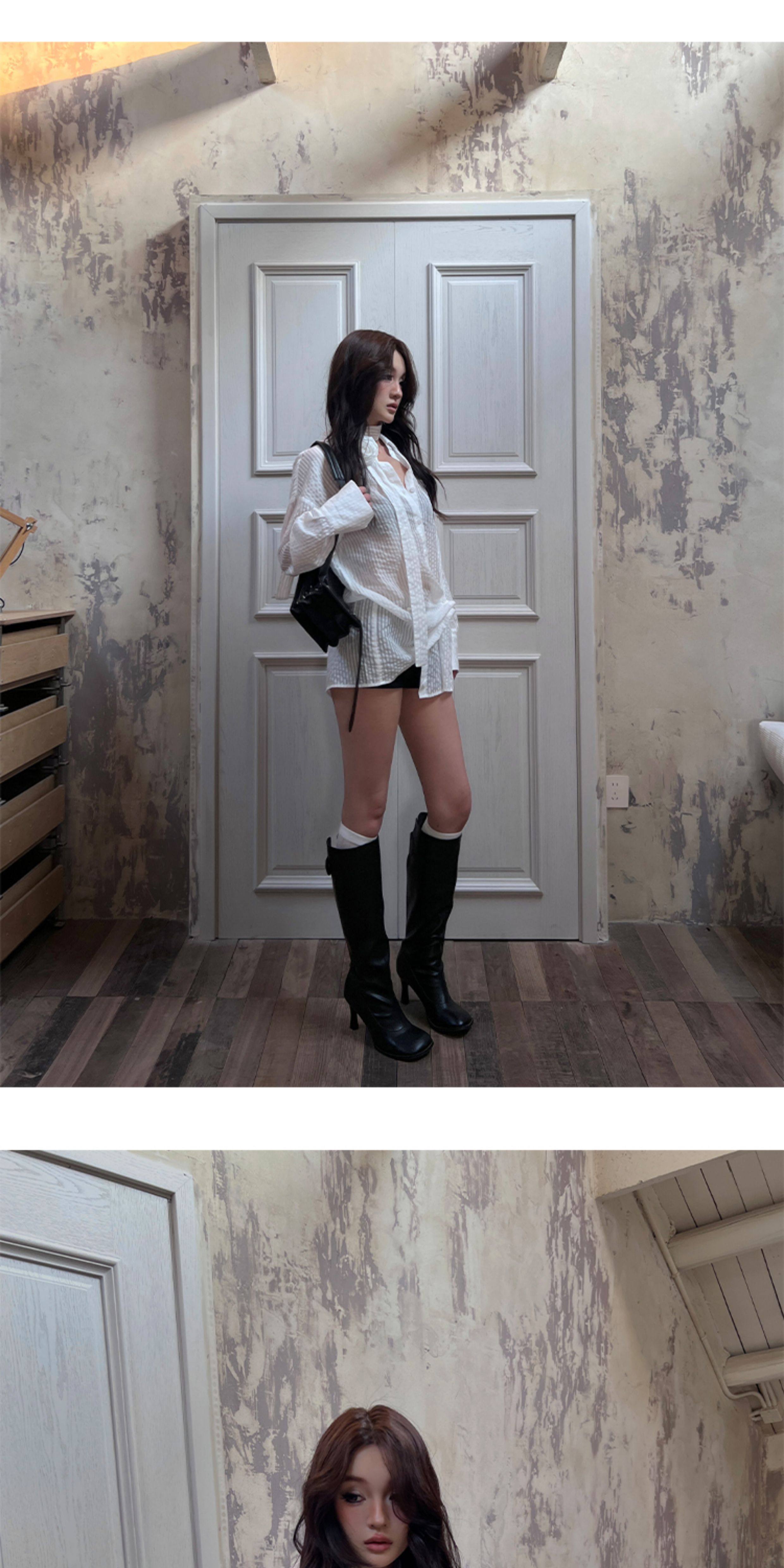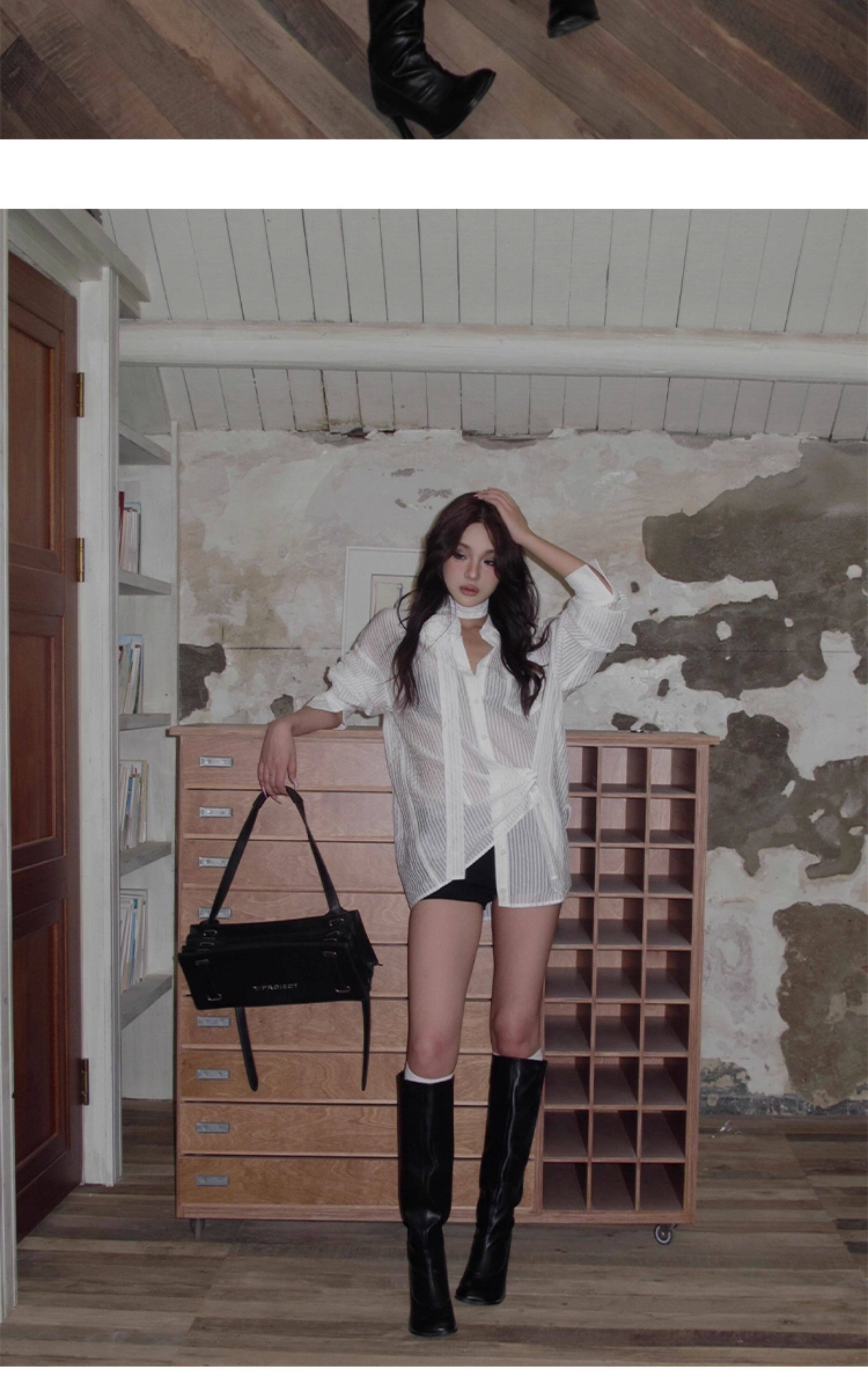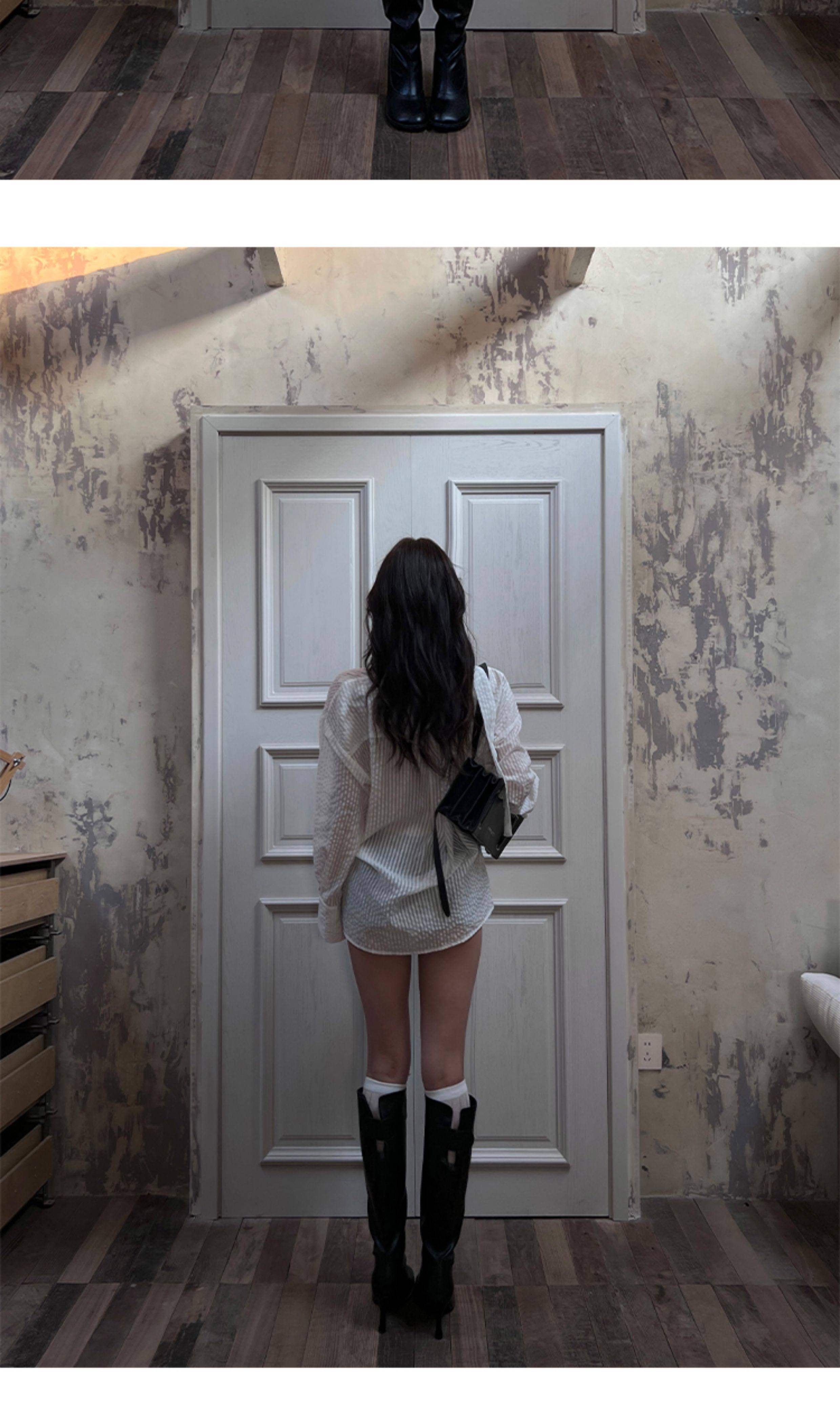 HYTEMOLY手工花朵腰側紐釦多穿法襯衫微透條紋寬鬆防曬長袖襯衣女