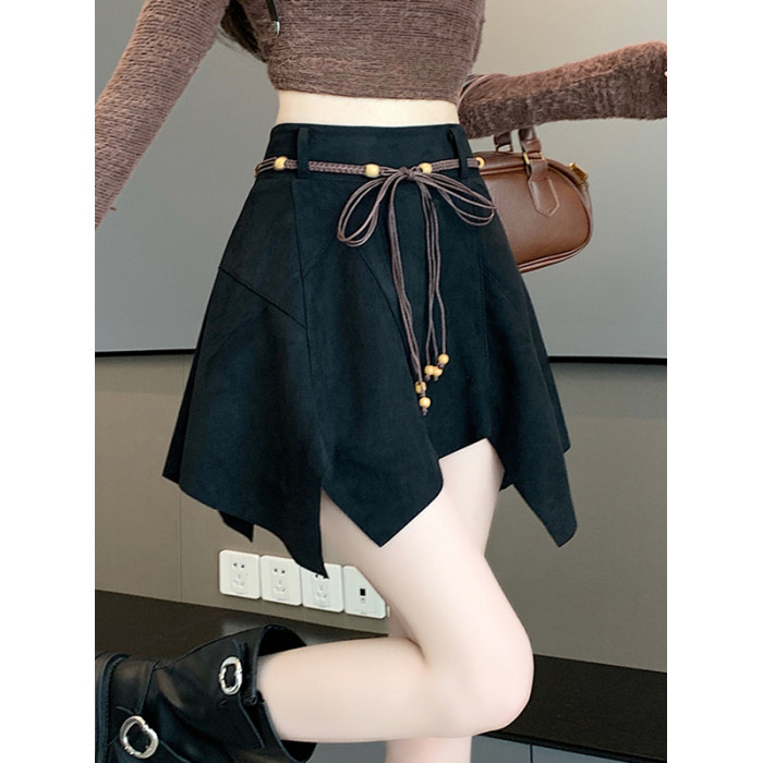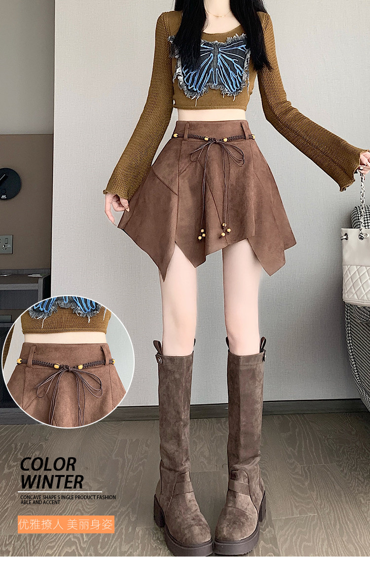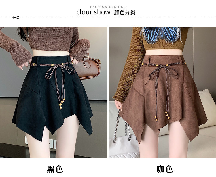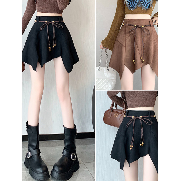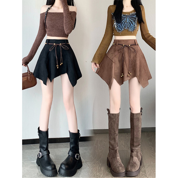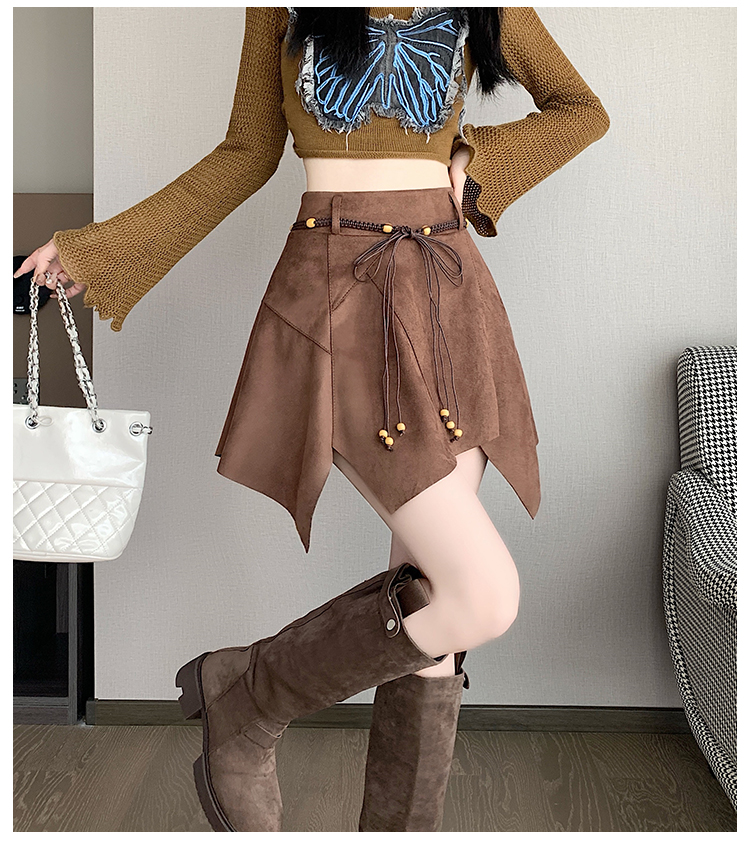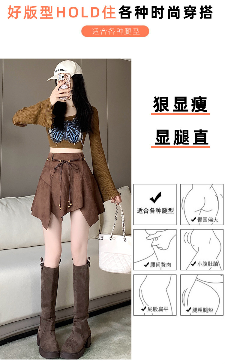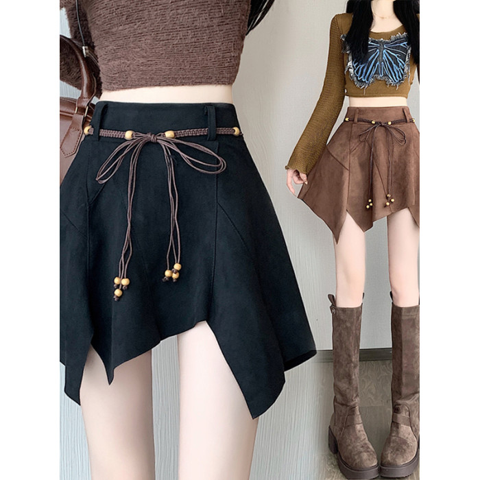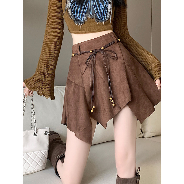 美式復古咖色麂皮高腰半身裙女早秋設計感不規則顯瘦a字包臀短裙