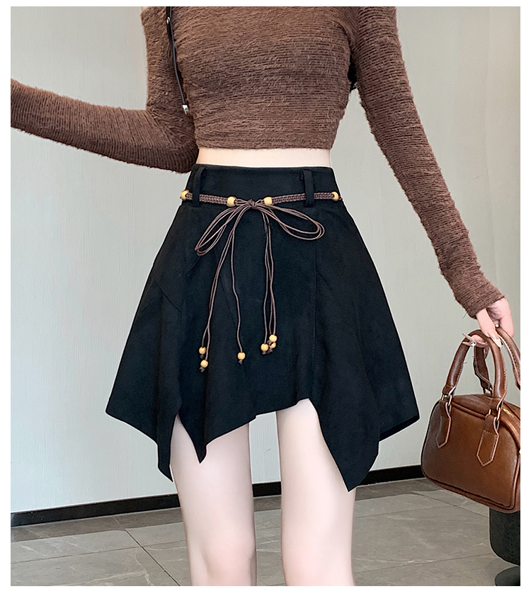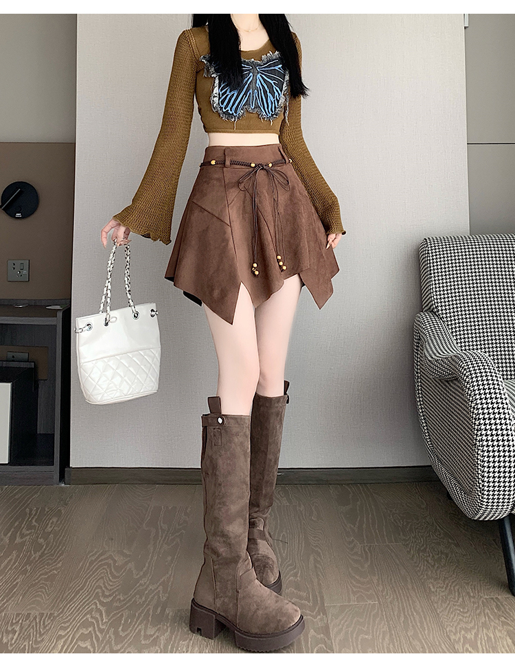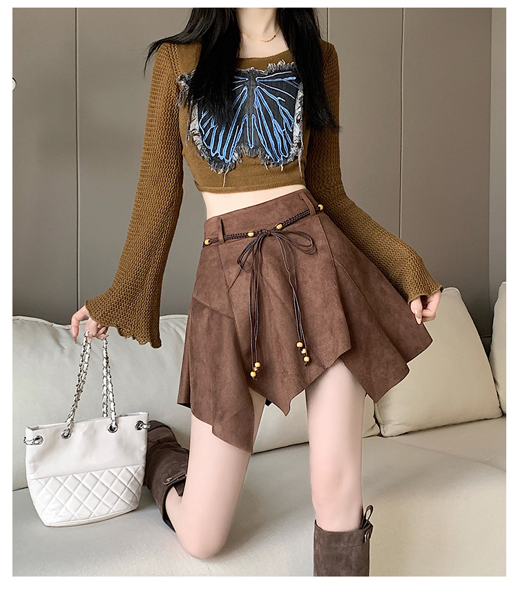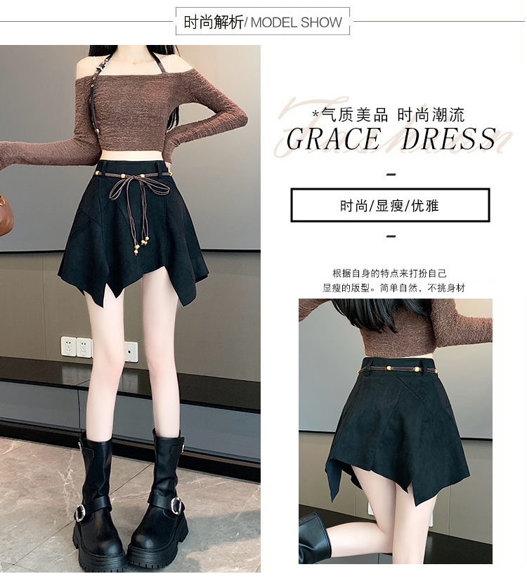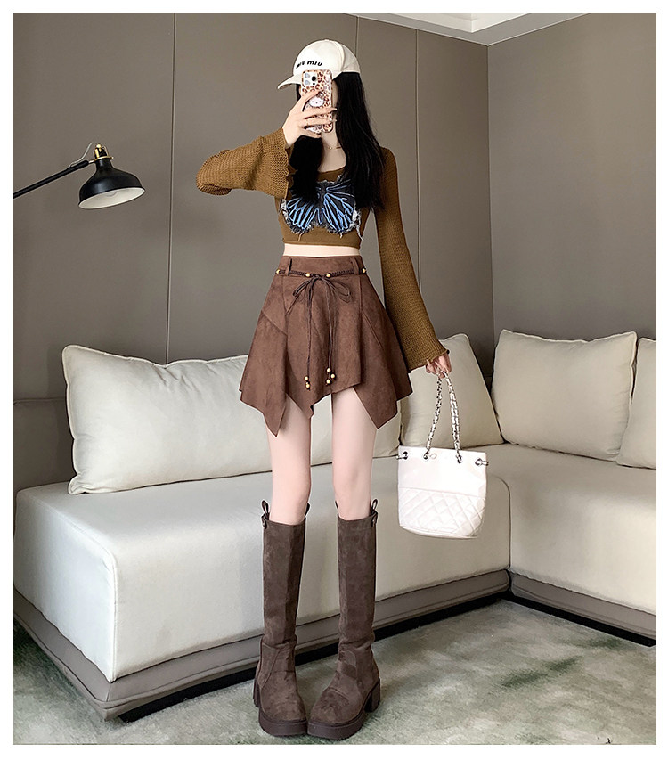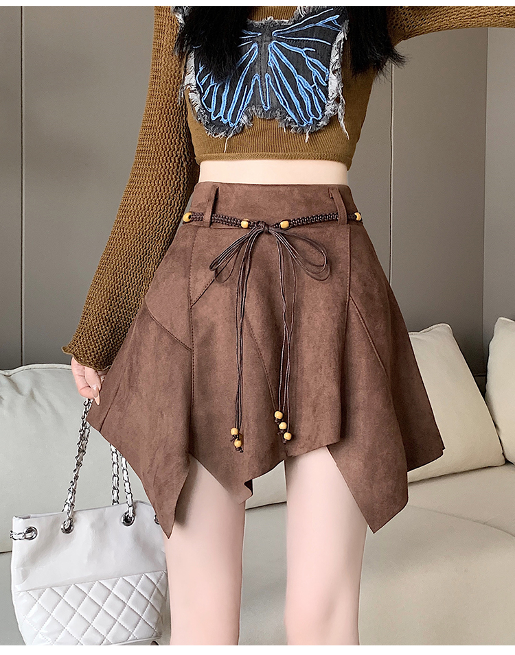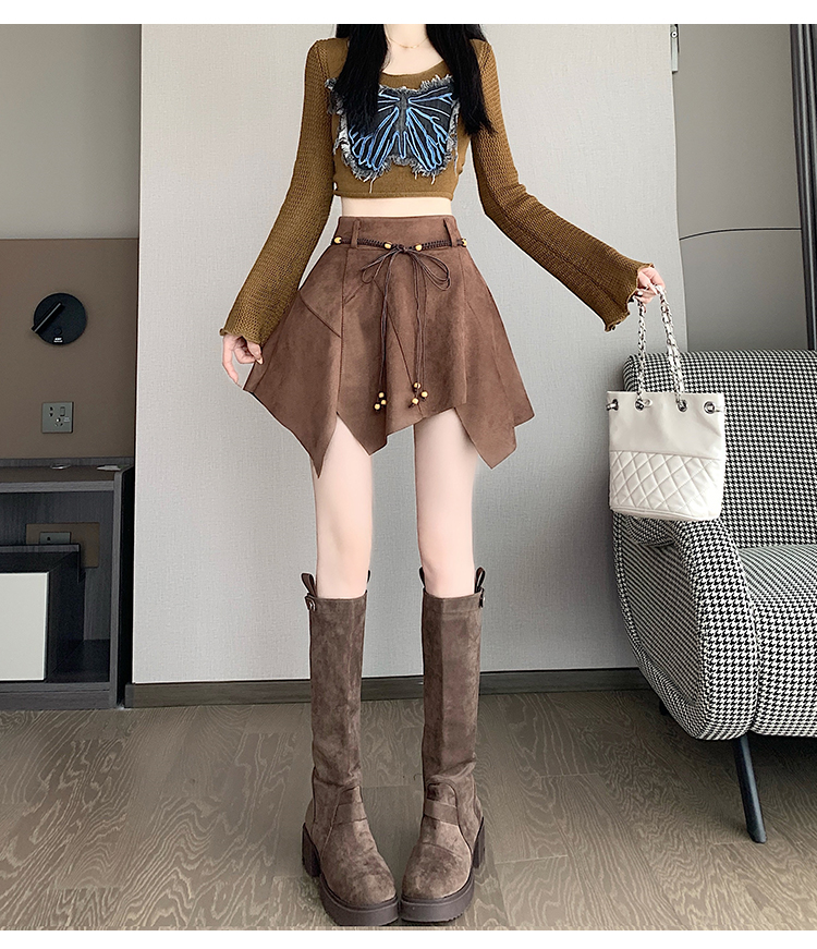 美式復古咖色麂皮高腰半身裙女早秋設計感不規則顯瘦a字包臀短裙