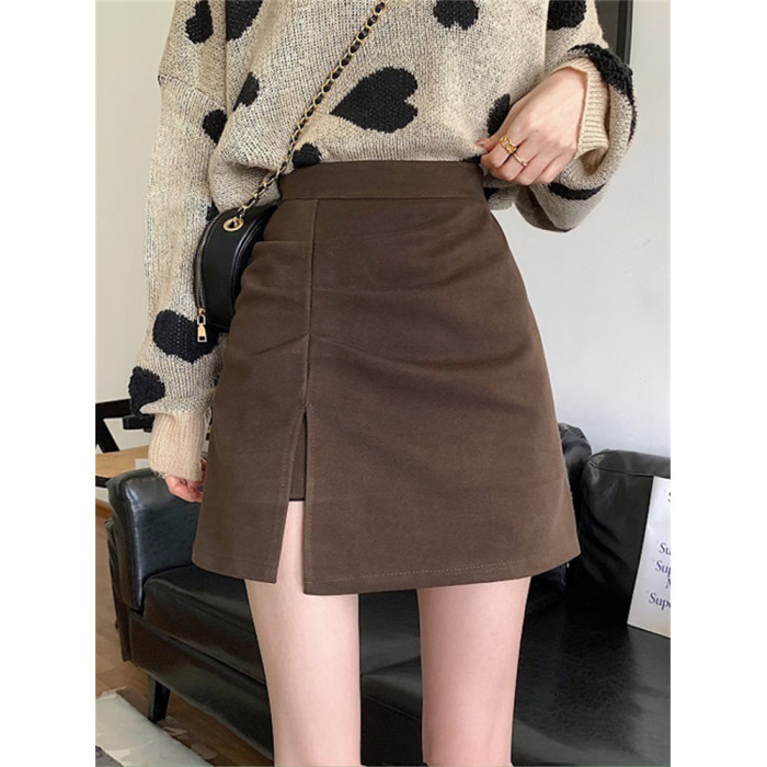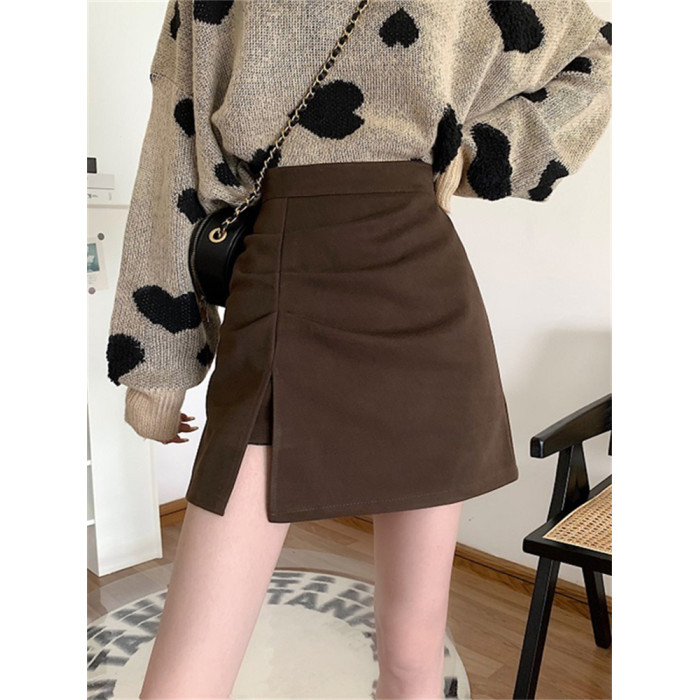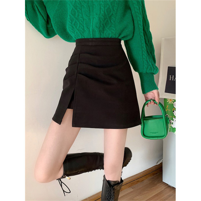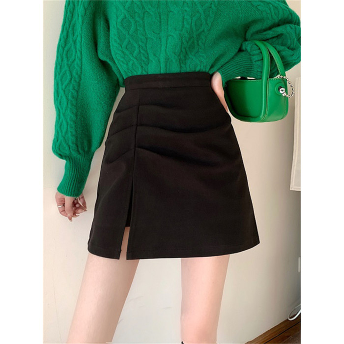 大碼胖妹妹mm毛呢半身裙女春秋開叉a字裙子顯瘦高腰褶皺包臀短裙