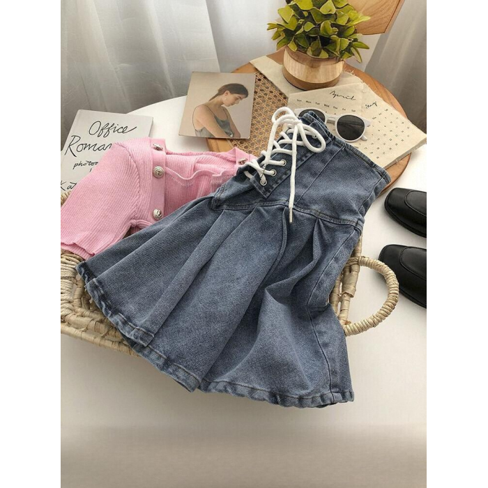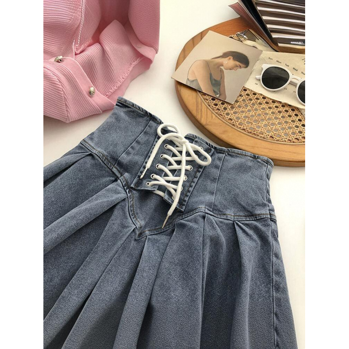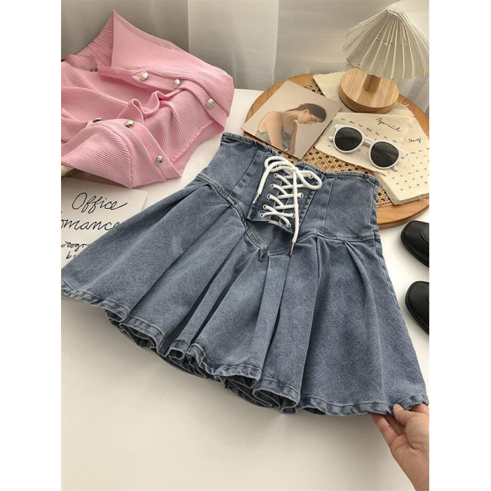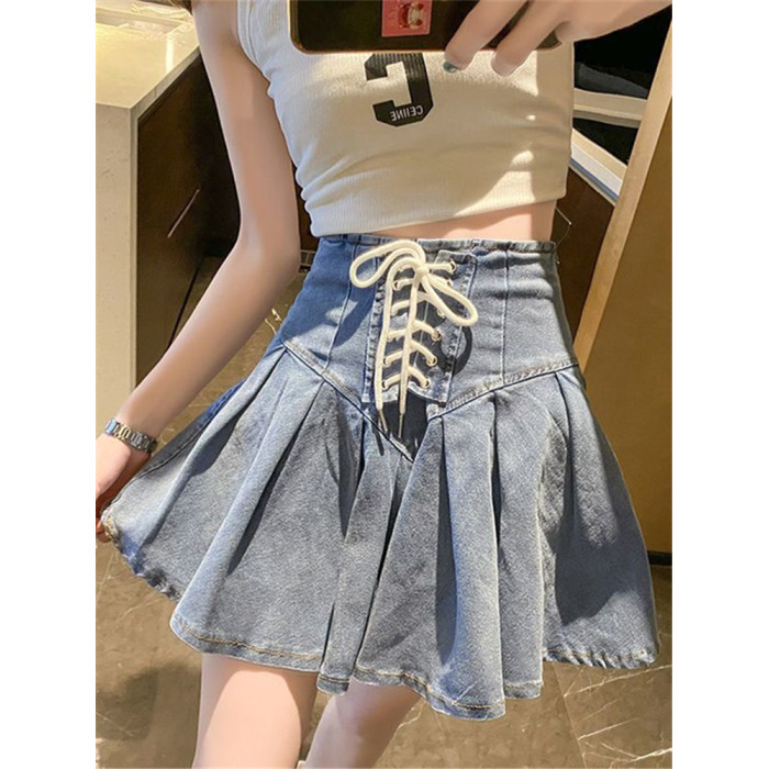 2024新款辣妹彈力牛仔百褶裙女韓版交叉綁帶短裙時尚百搭半身裙