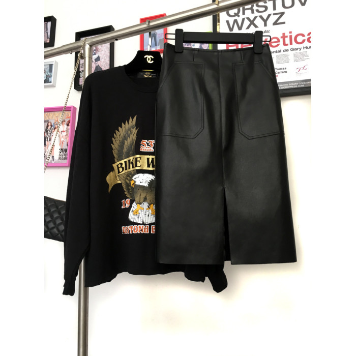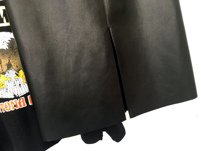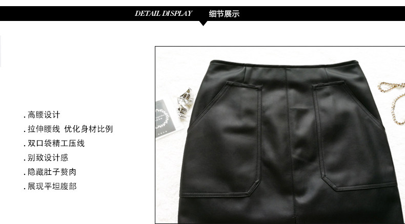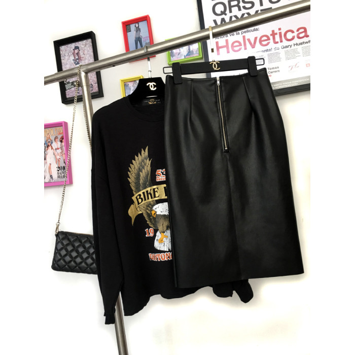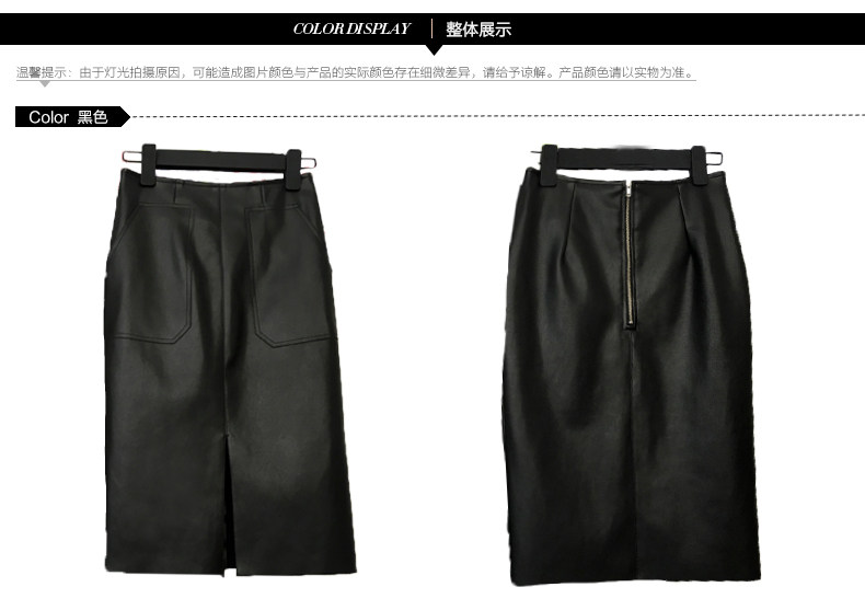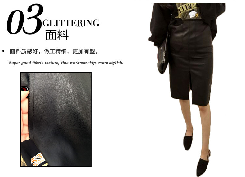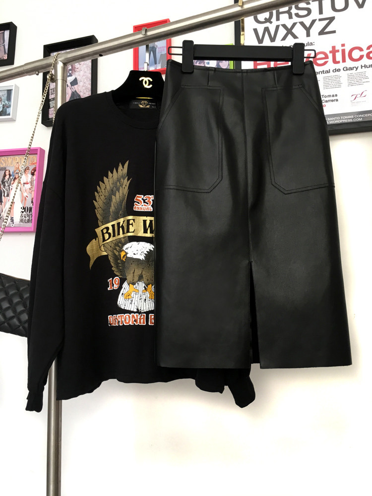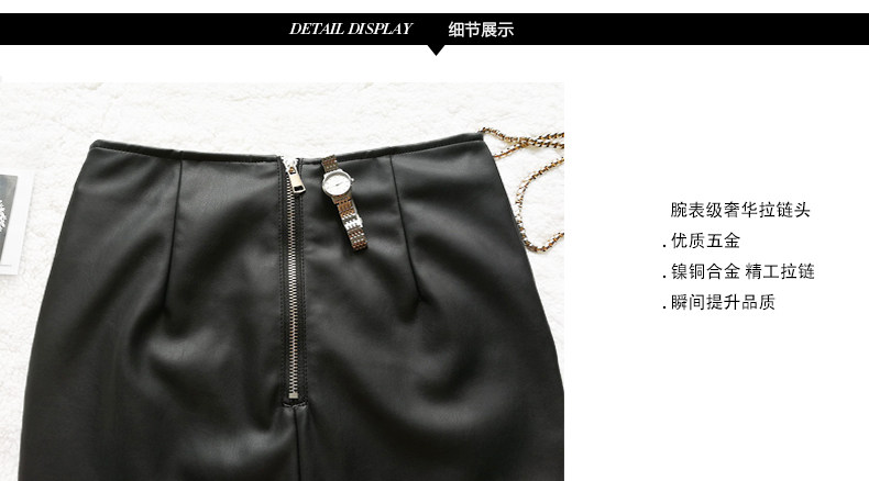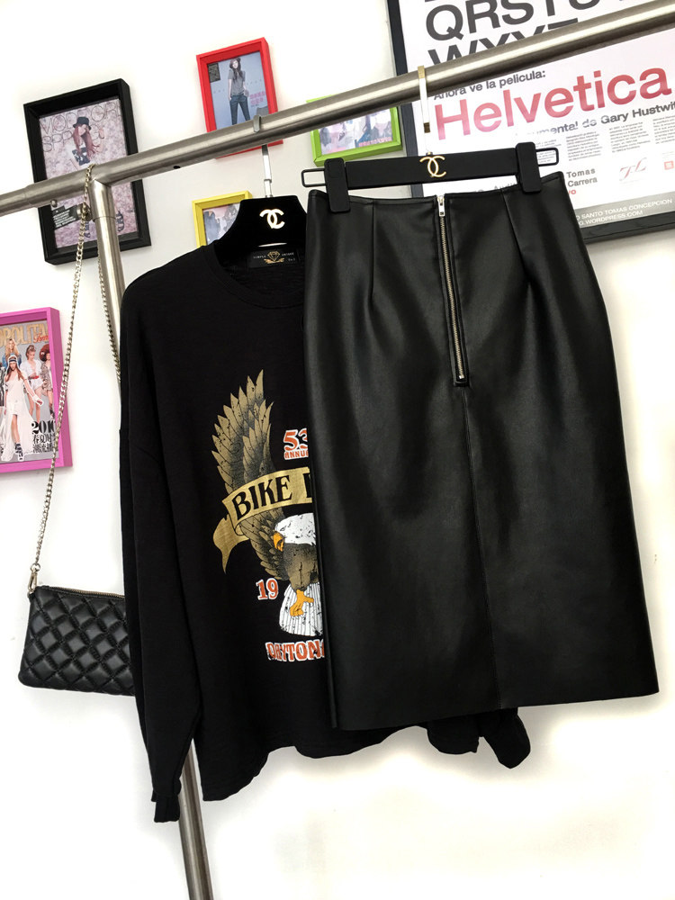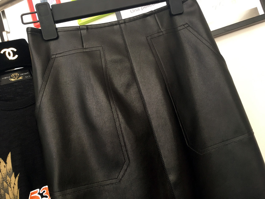 我們今年秋推出的黑色仿羊皮中裙,高腰設計,對於腿部線條不夠的,腰線拉升了,整體比例就好了,即使個子不高也能穿出170+的身形