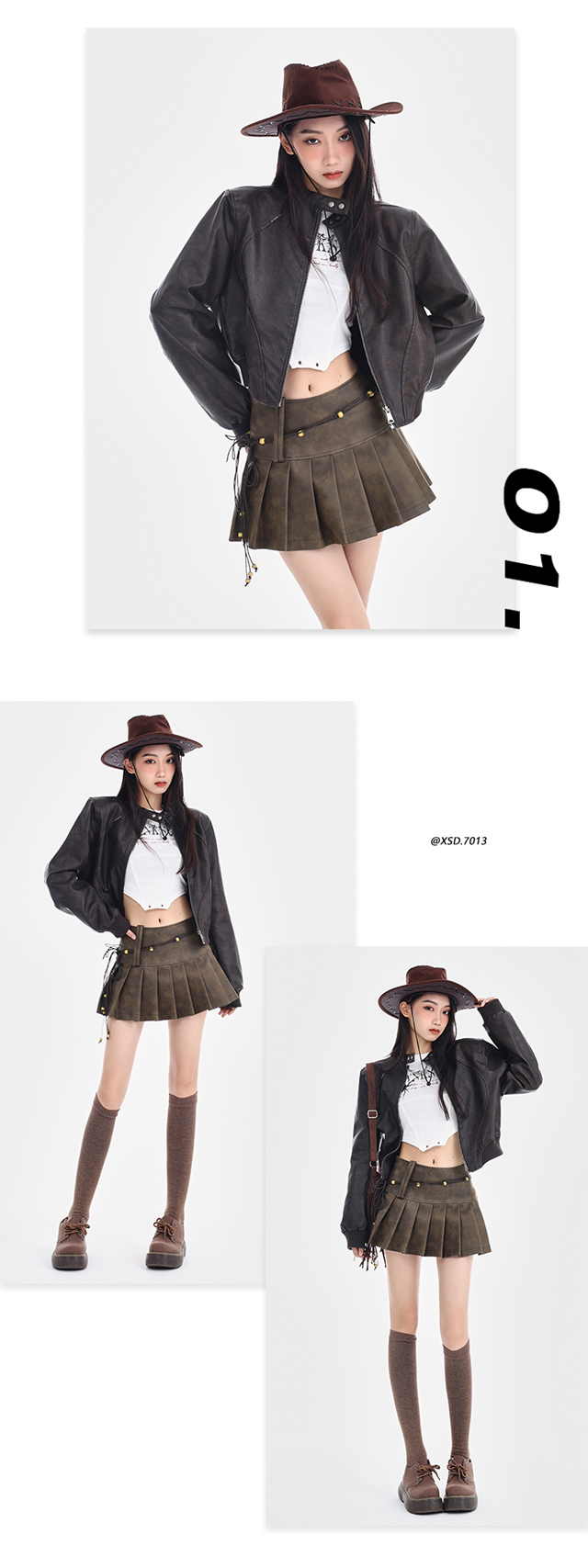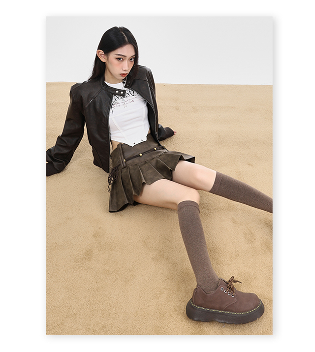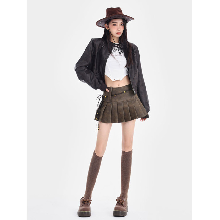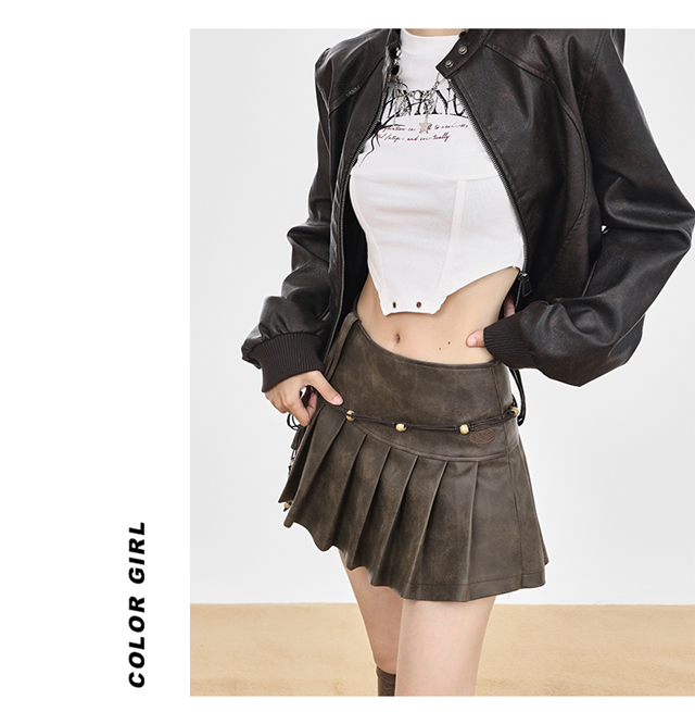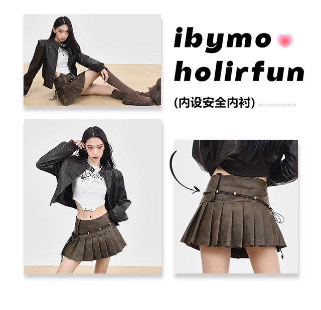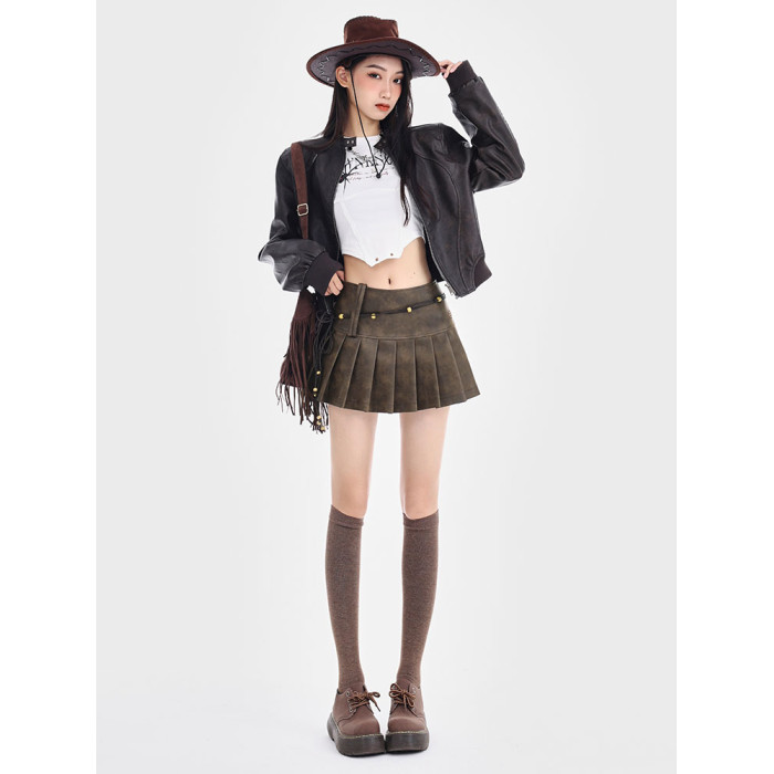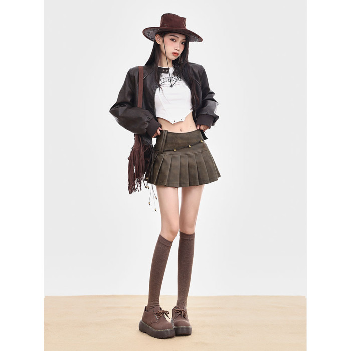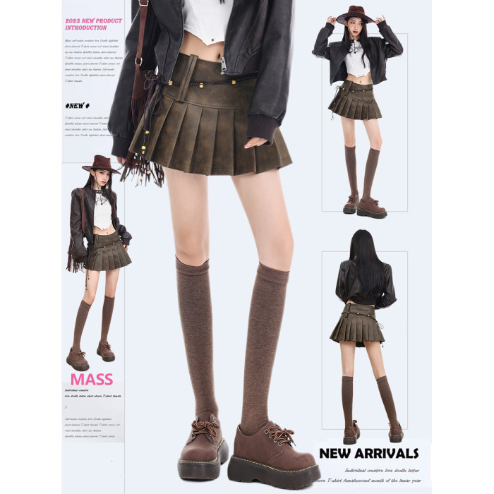 MASS 美式辣妹PU皮裙棕色做舊百褶短裙顯瘦A字裙半身裙美拉德穿搭