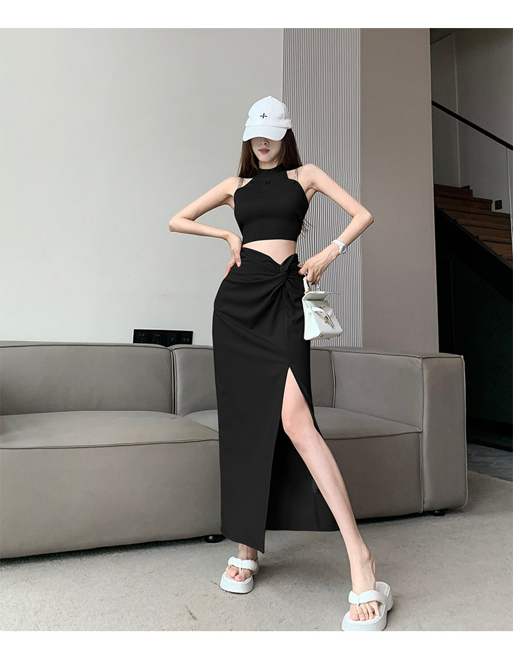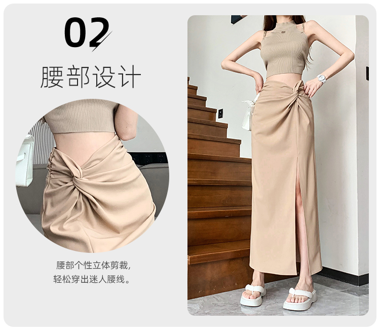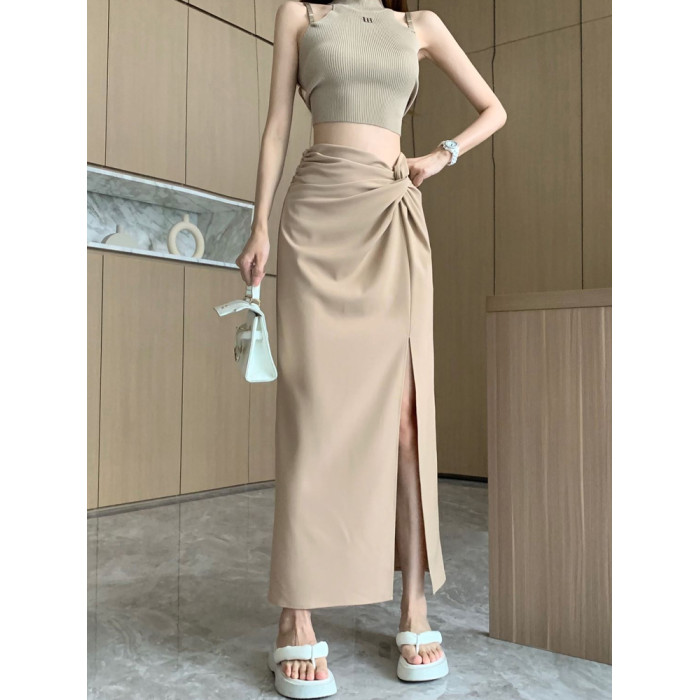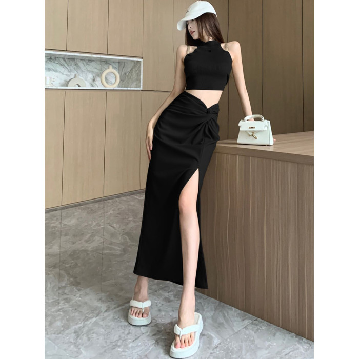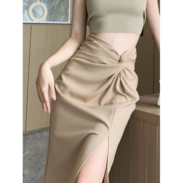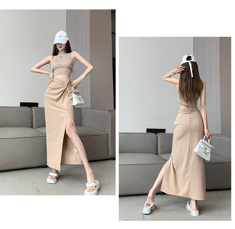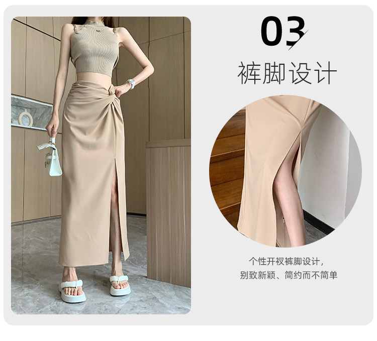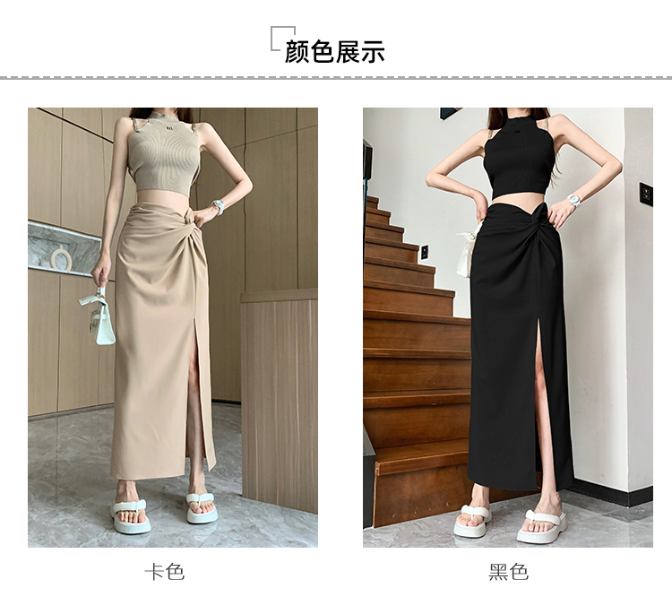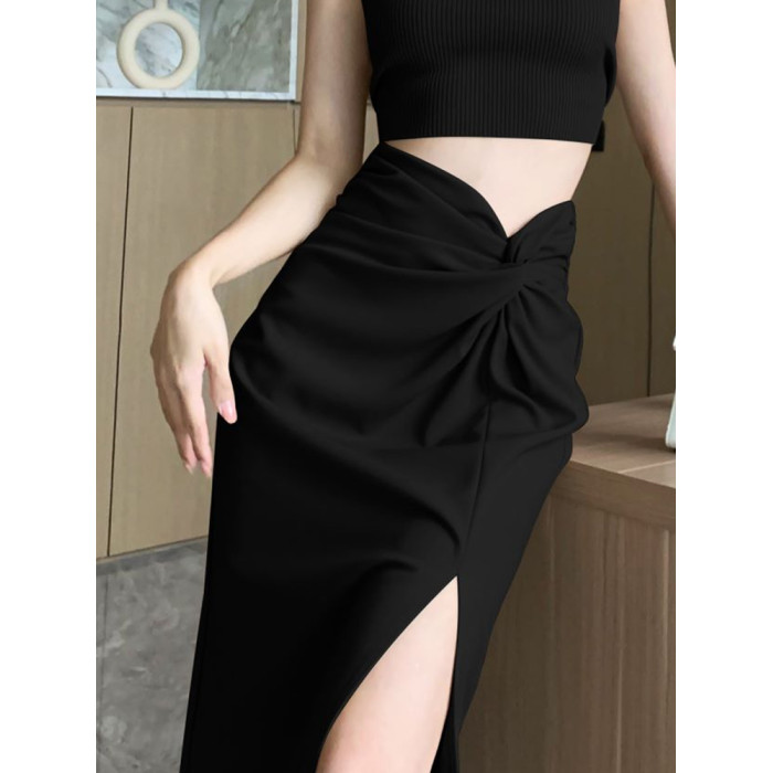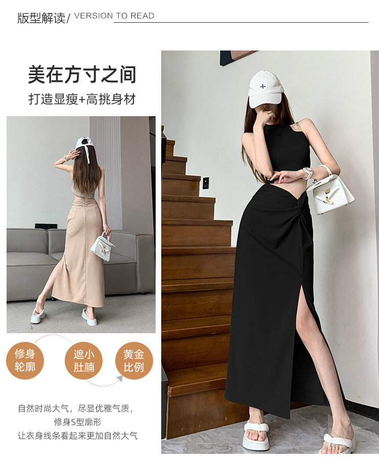 黑色開叉西裝半身裙子女夏季薄款設計感抽褶高腰中長款直筒包臀裙