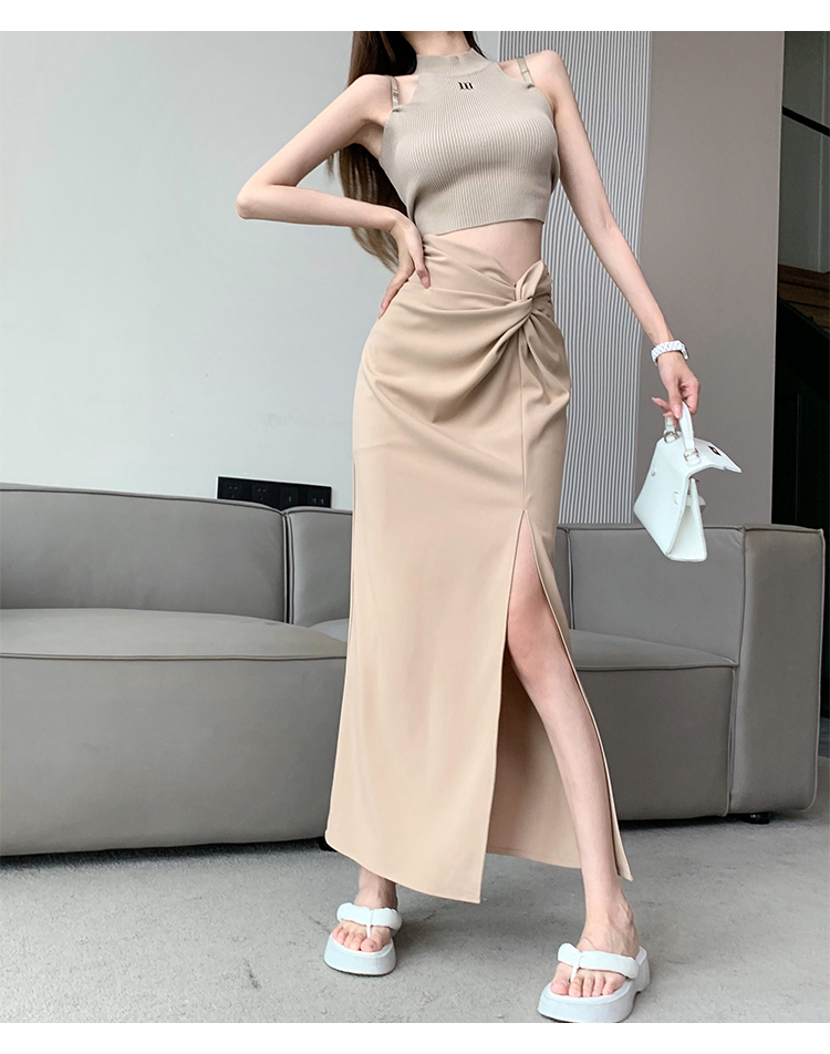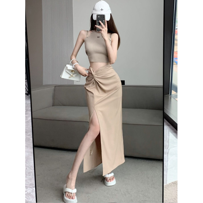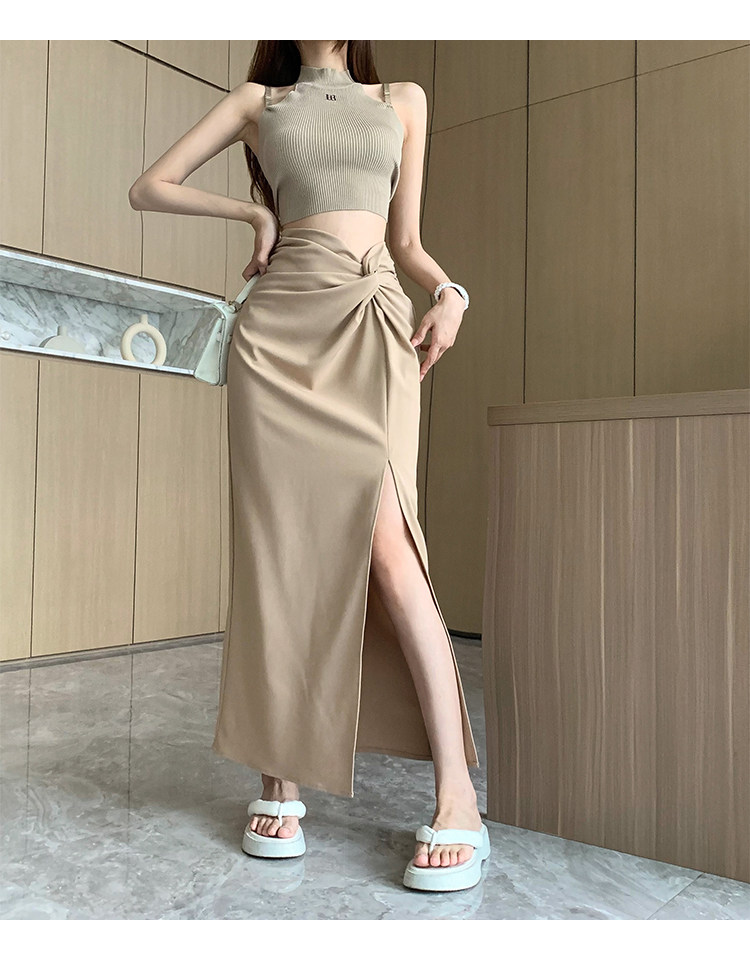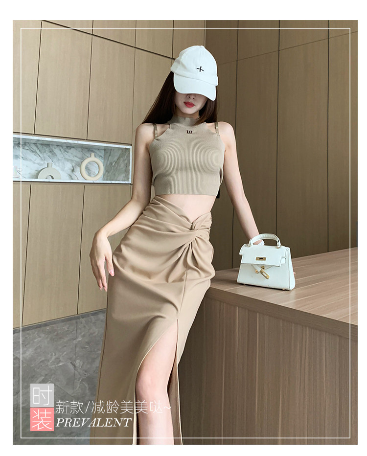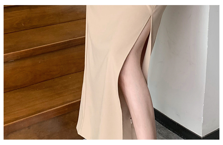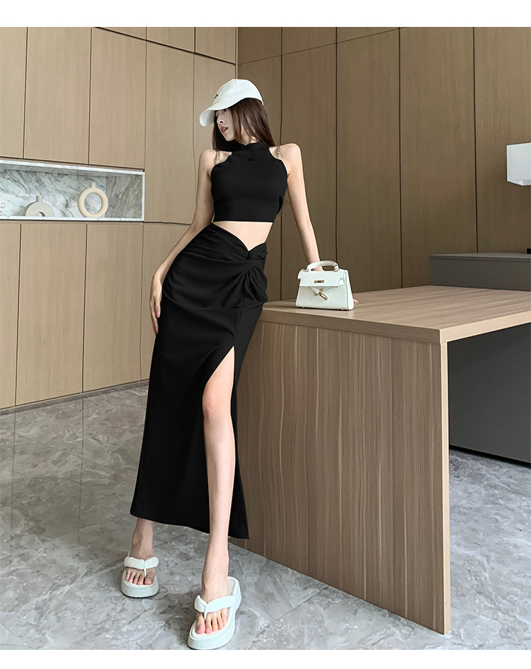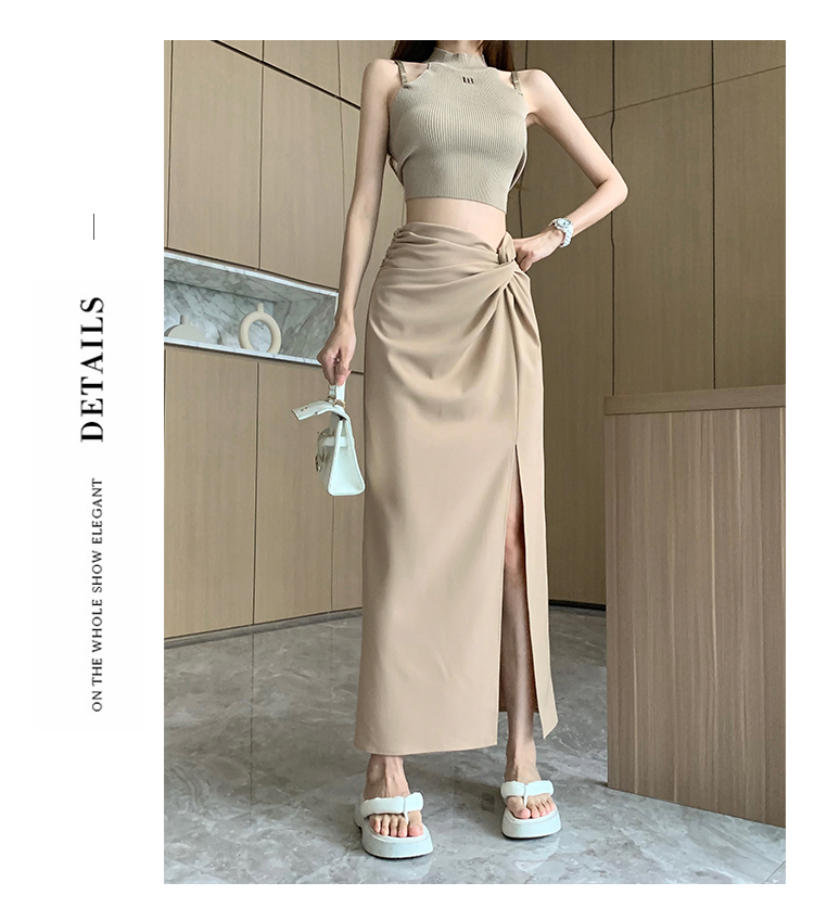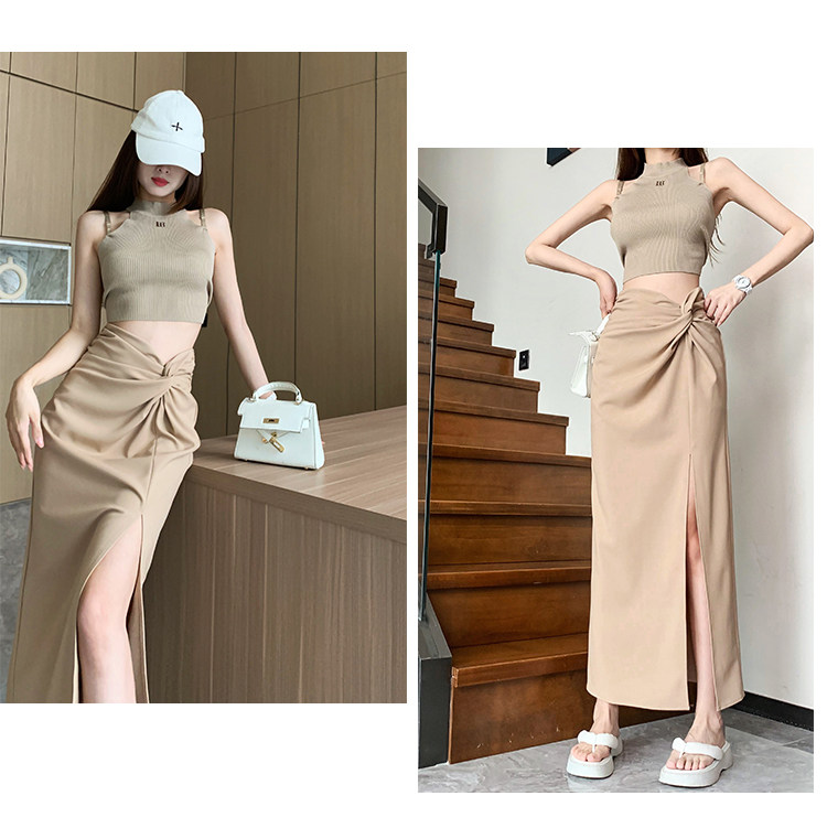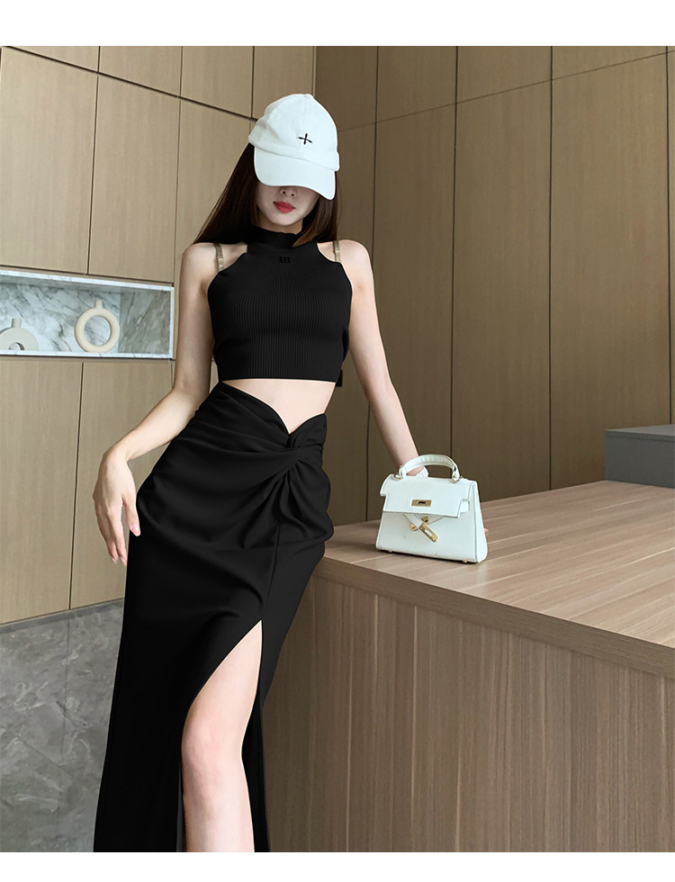 黑色開叉西裝半身裙子女夏季薄款設計感抽褶高腰中長款直筒包臀裙