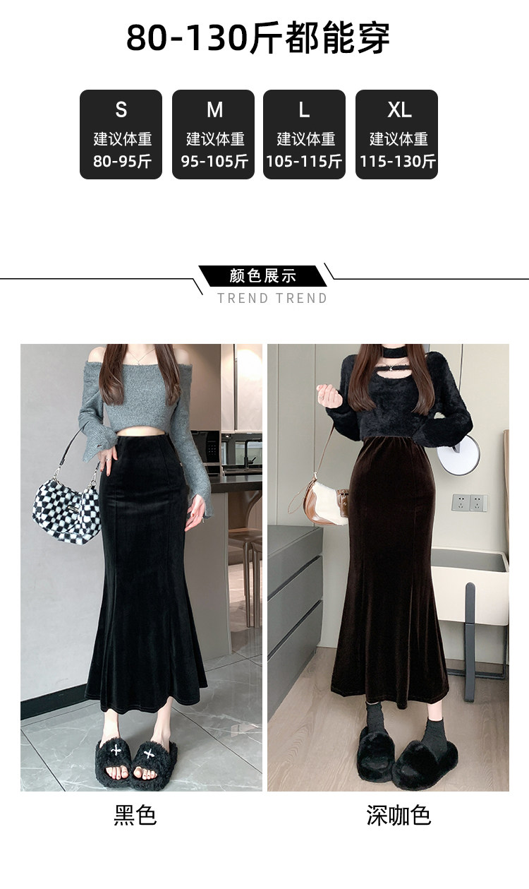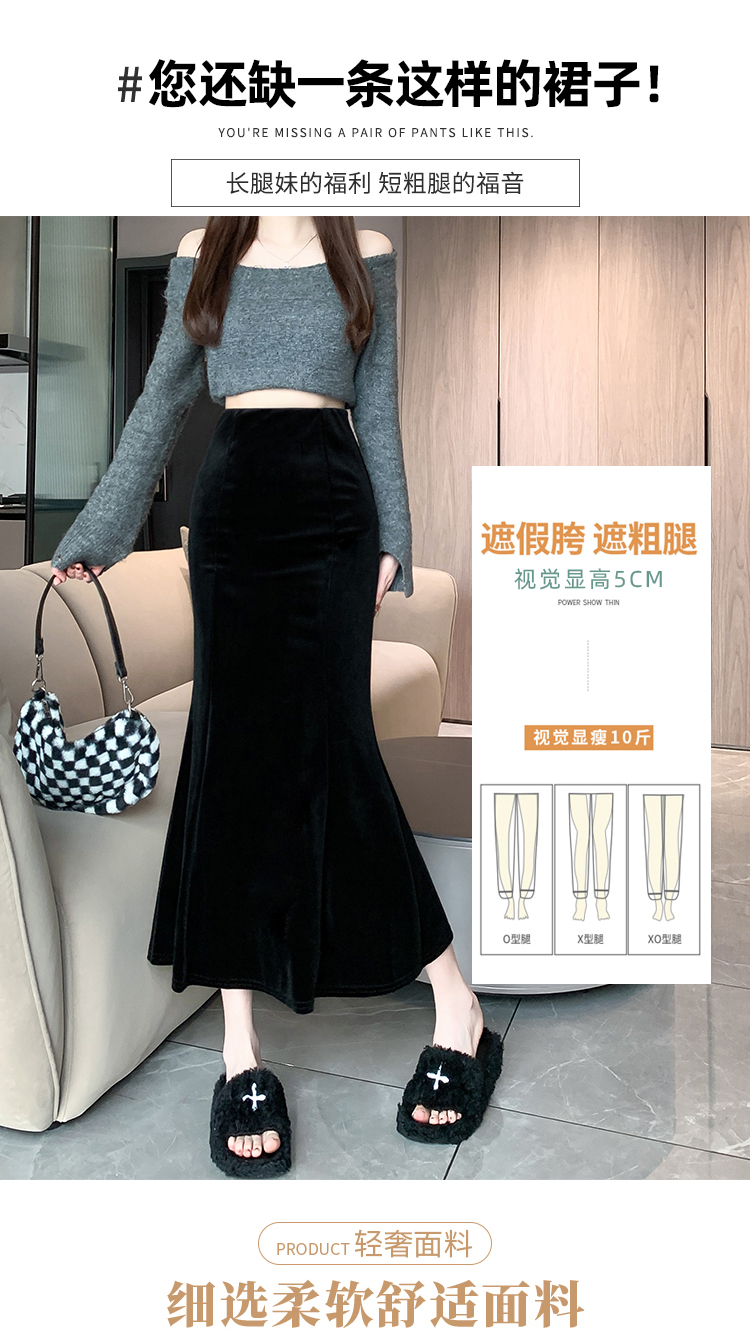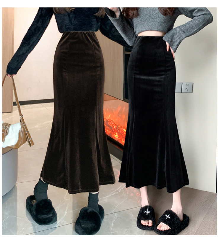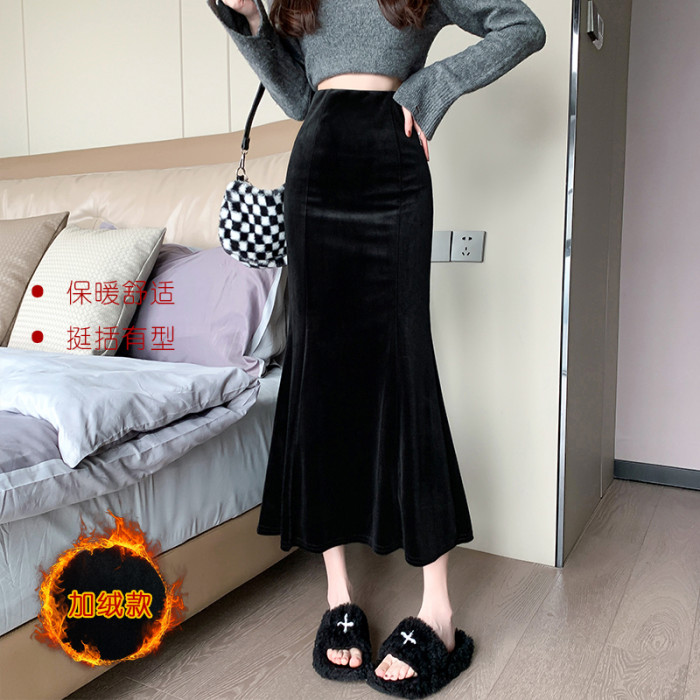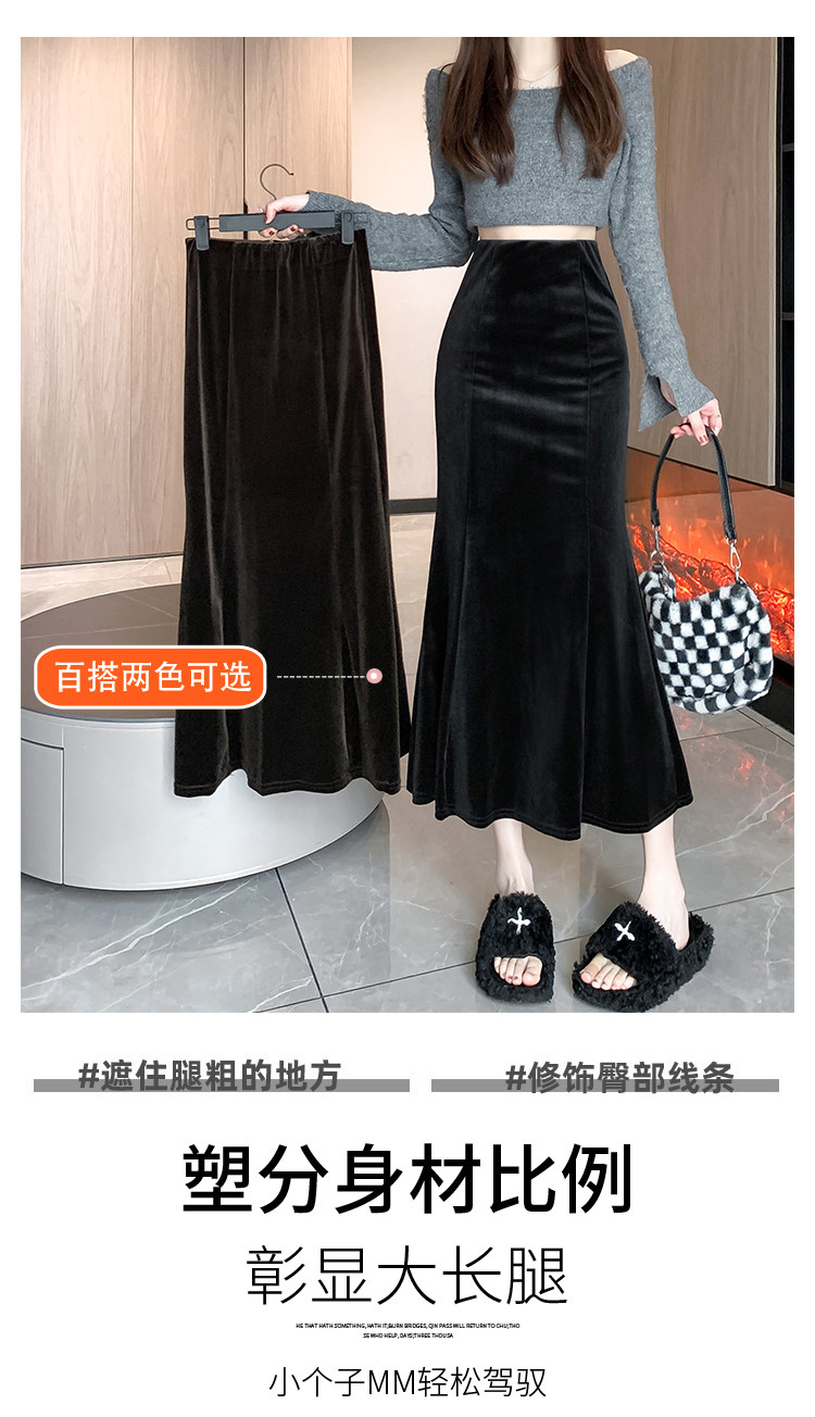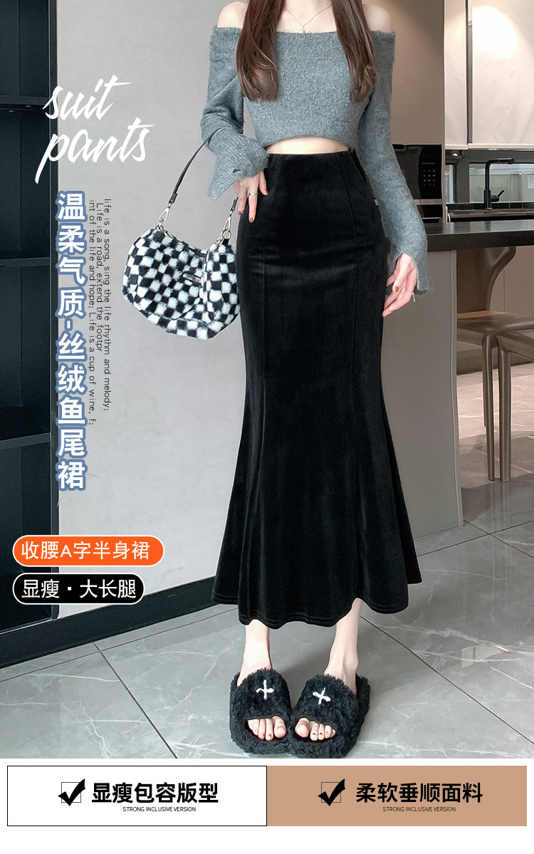 黑色金絲絨半身裙女秋冬天加絨加厚高腰顯瘦中長款a字包臀魚尾裙