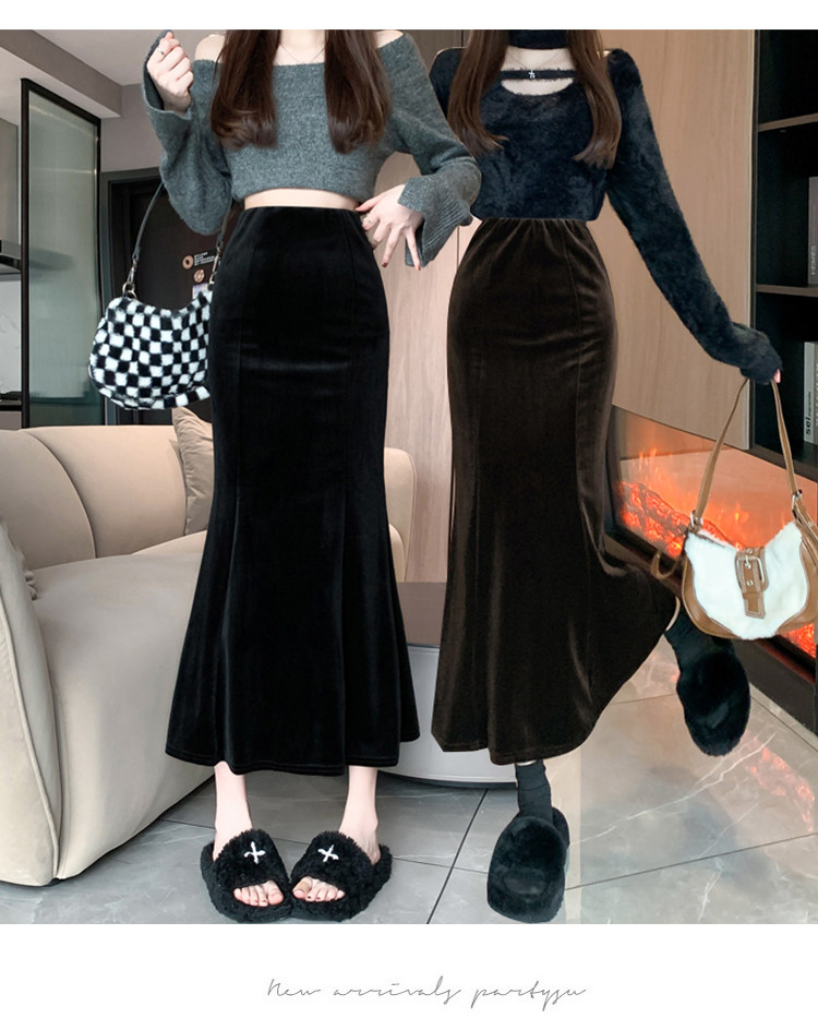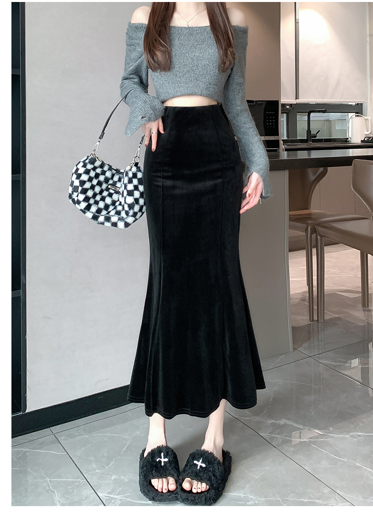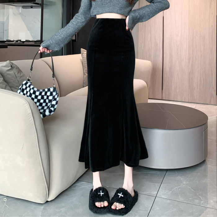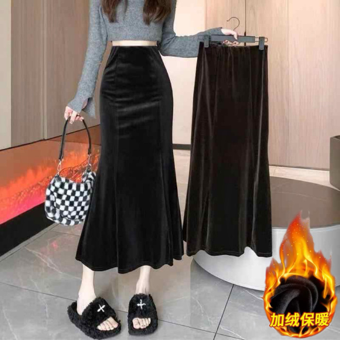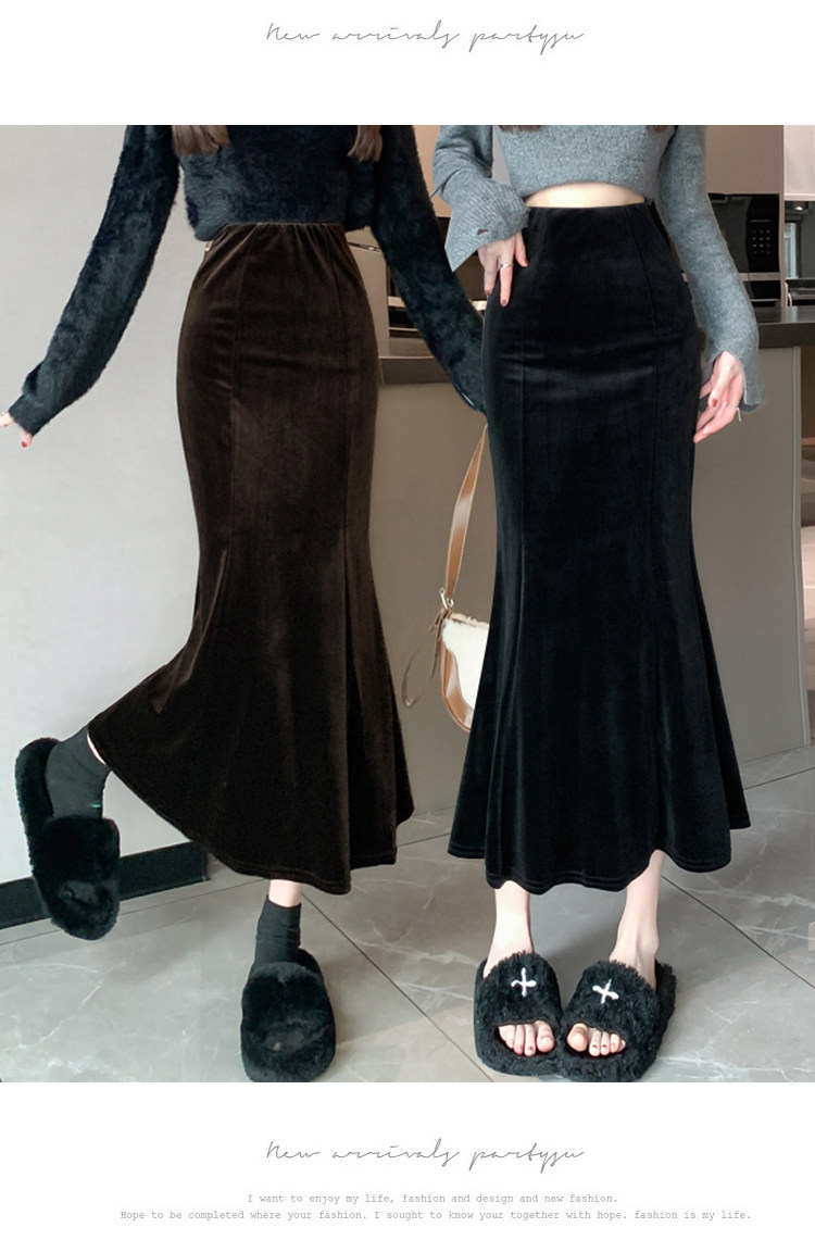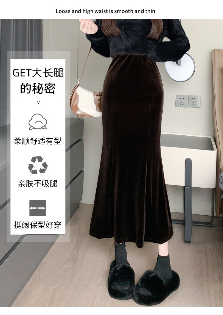 黑色金絲絨半身裙女秋冬天加絨加厚高腰顯瘦中長款a字包臀魚尾裙