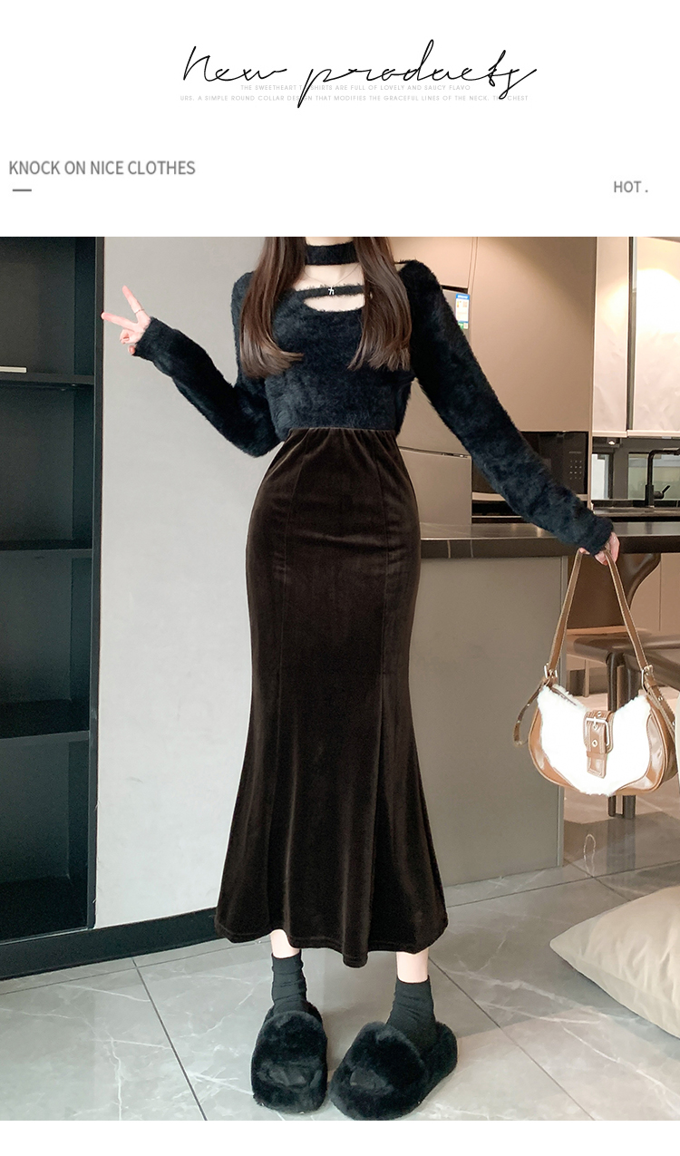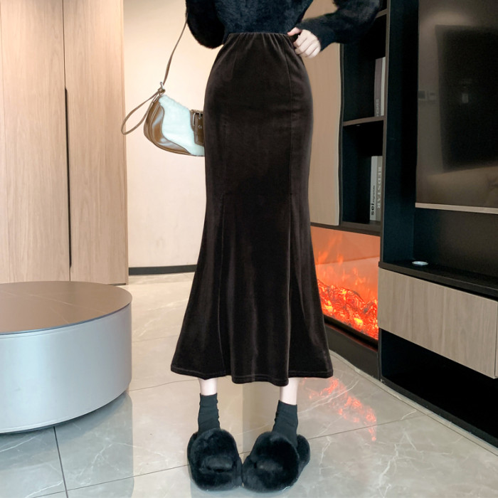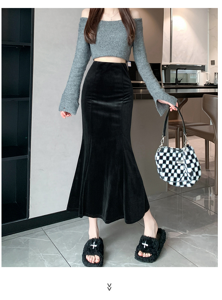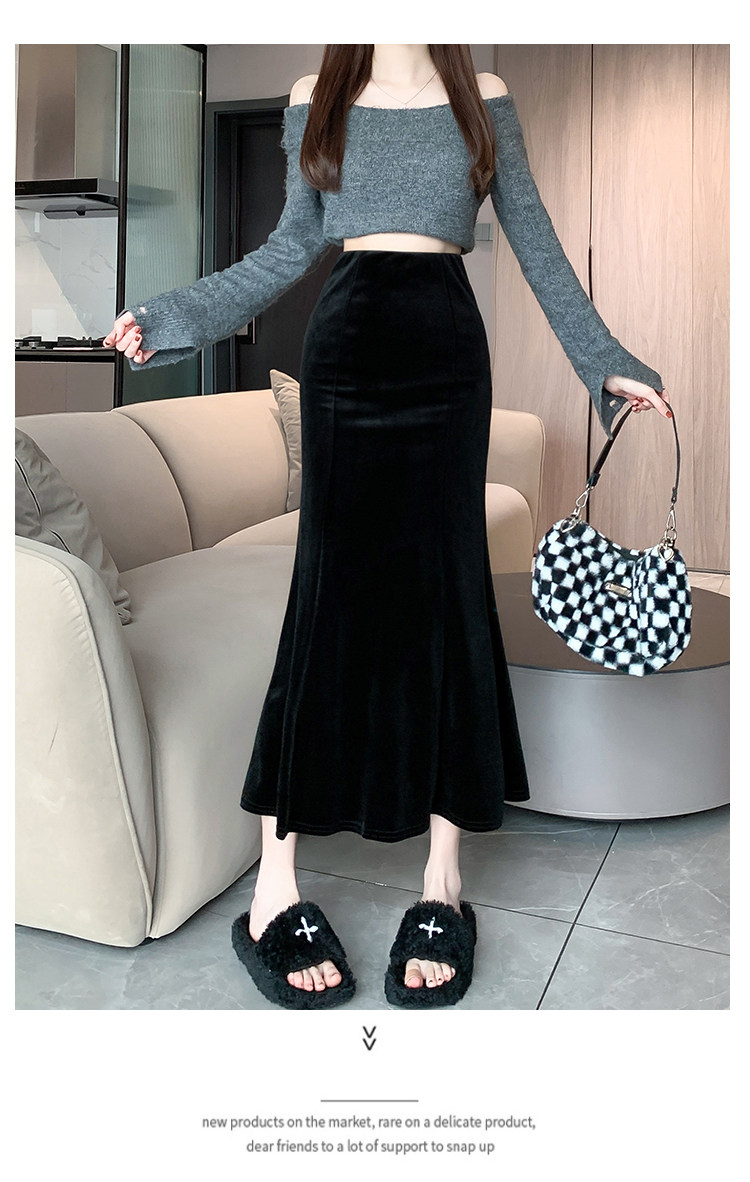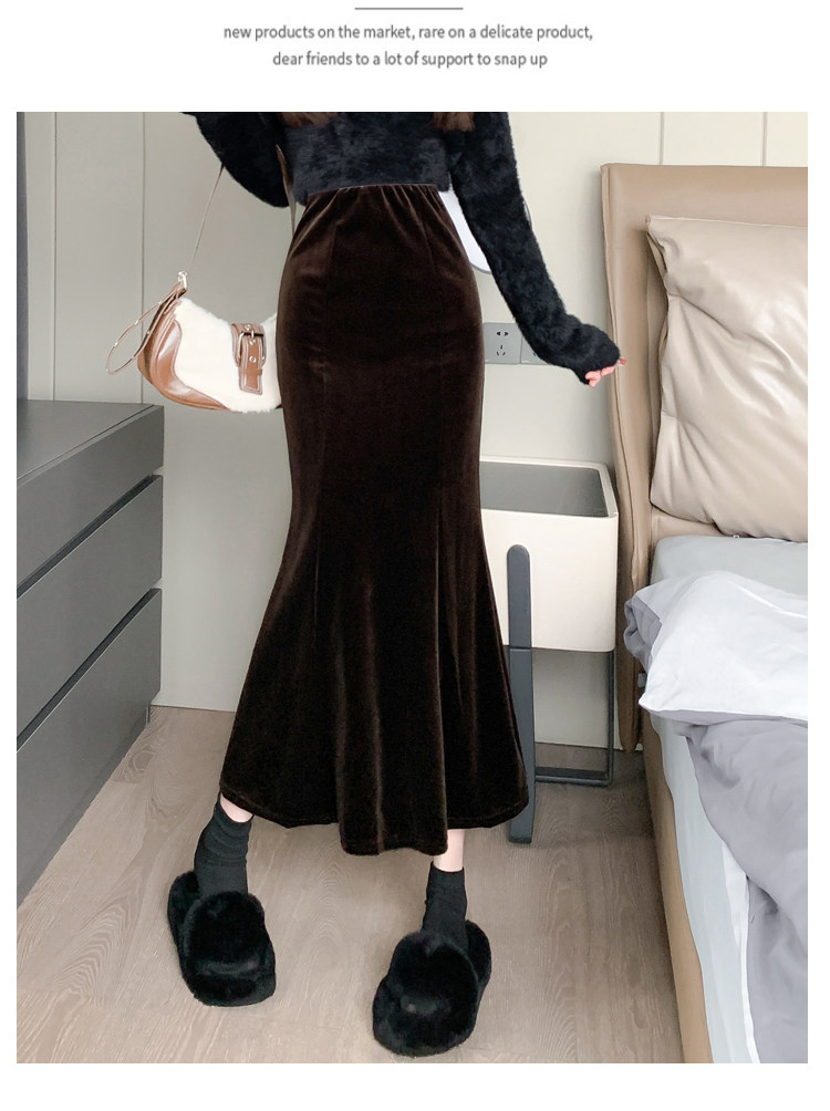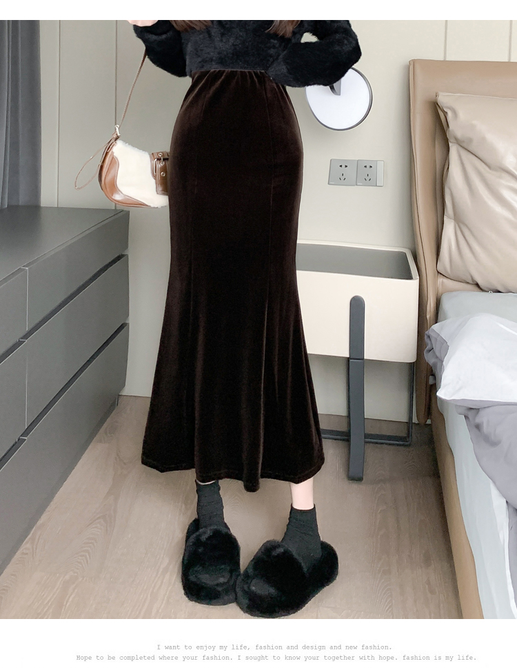 黑色金絲絨半身裙女秋冬天加絨加厚高腰顯瘦中長款a字包臀魚尾裙