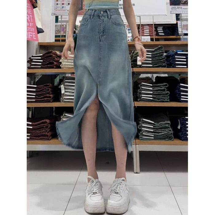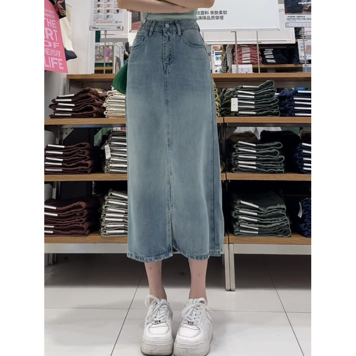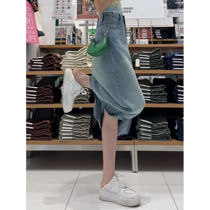 梨形身材藍色天絲牛仔半身裙女夏季薄款大碼高腰顯瘦中長款a字裙