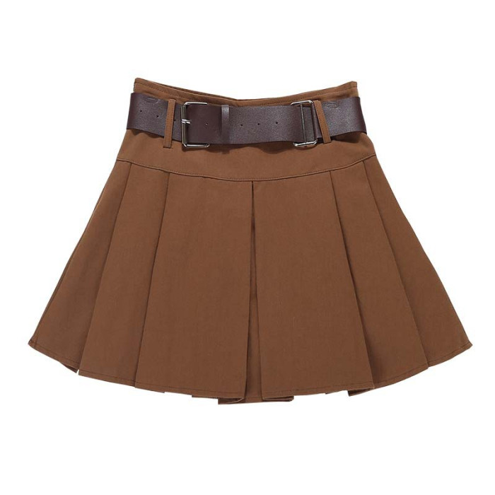 復古校園風百褶裙春季女裝高腰百搭繖裙顯瘦工裝半身裙配腰帶3173
