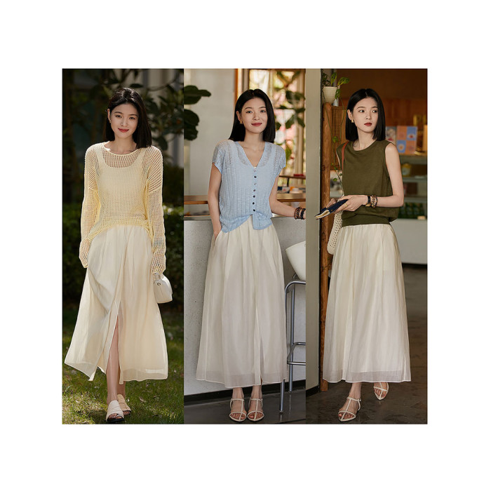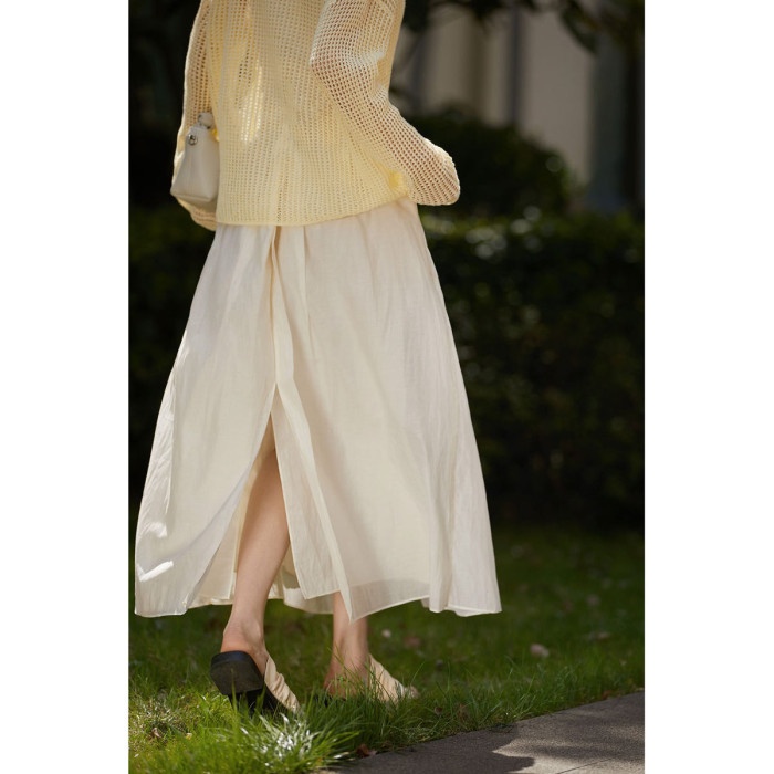 柔光拂夏|桑蠶絲+棉前後開叉設計松緊腰半身裙女A字中長裙夏新の
