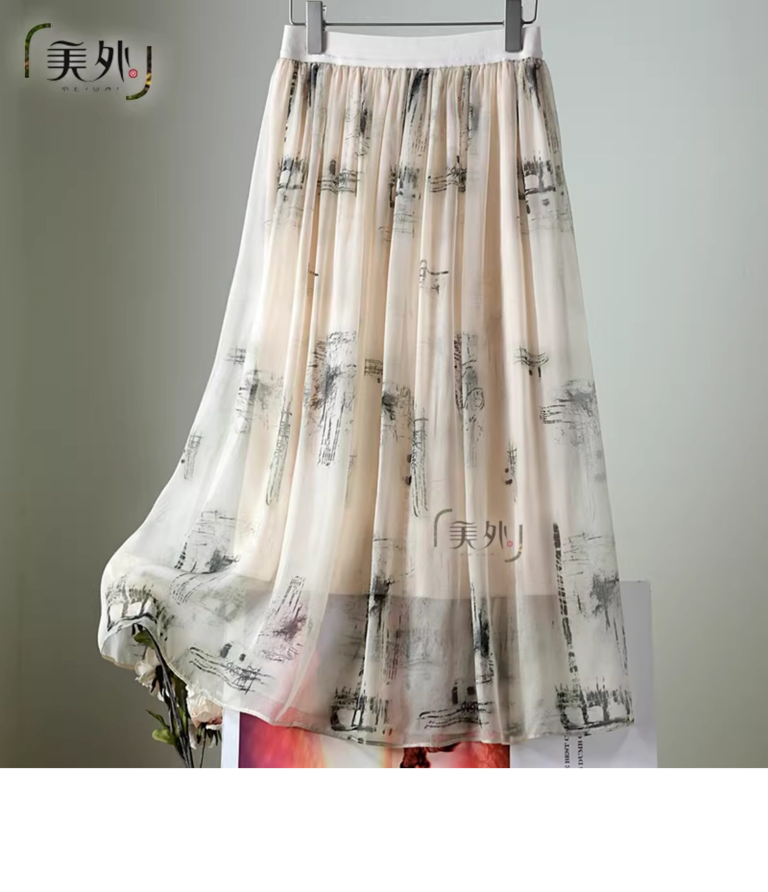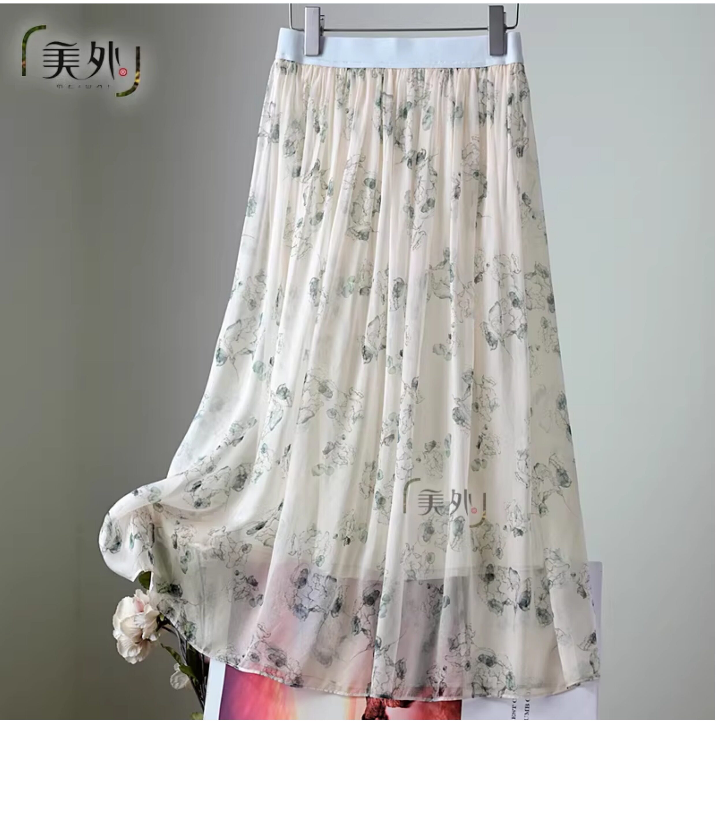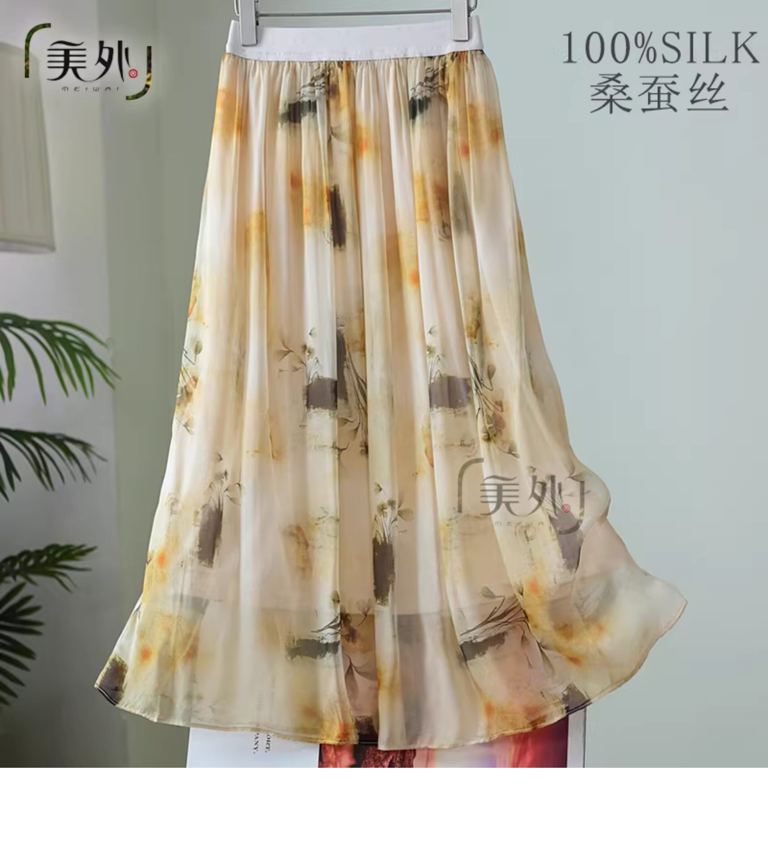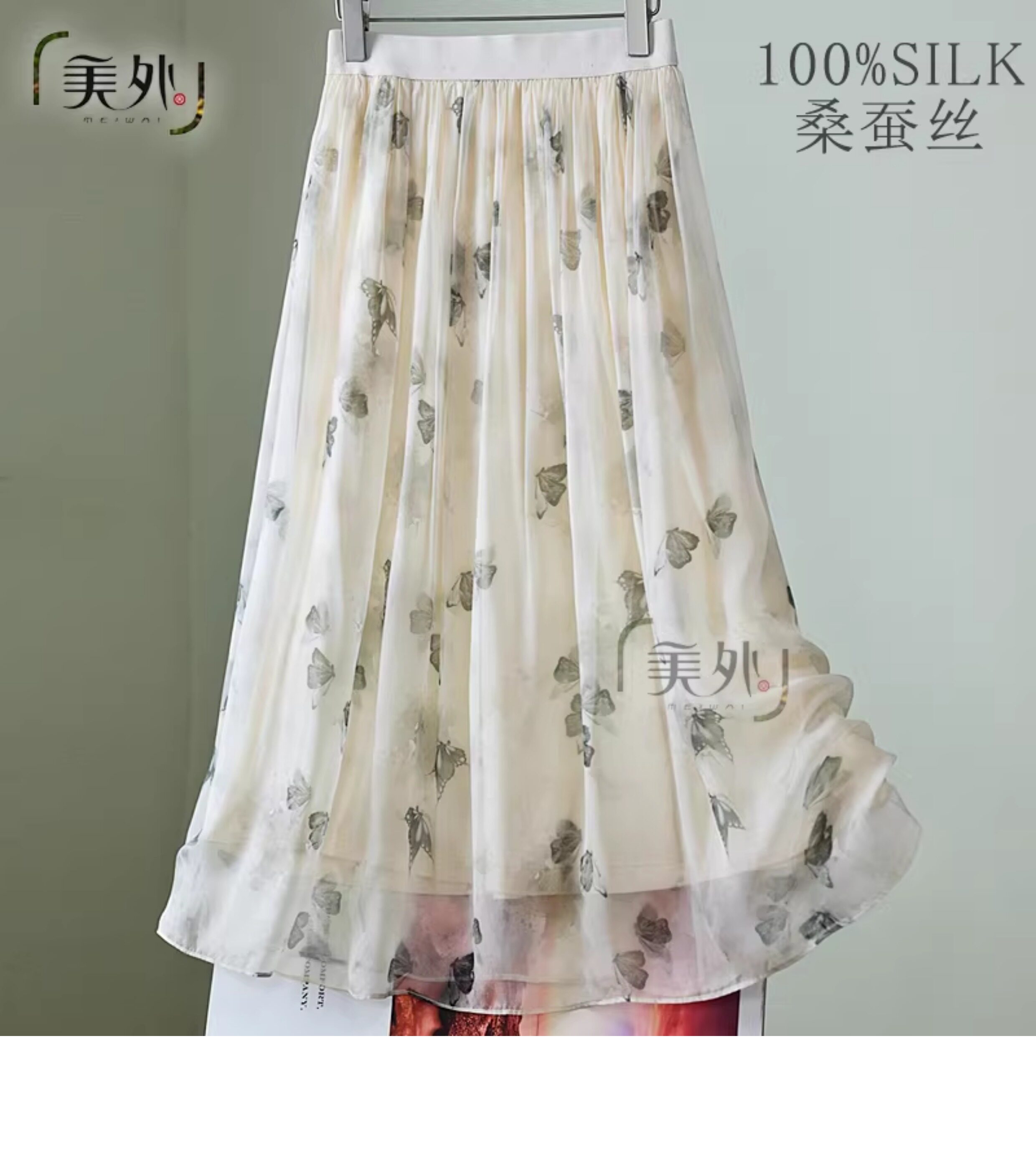 新款真絲半身裙女春夏季蝴蝶碎花高腰顯瘦遮肉桑蠶絲中長A字裙