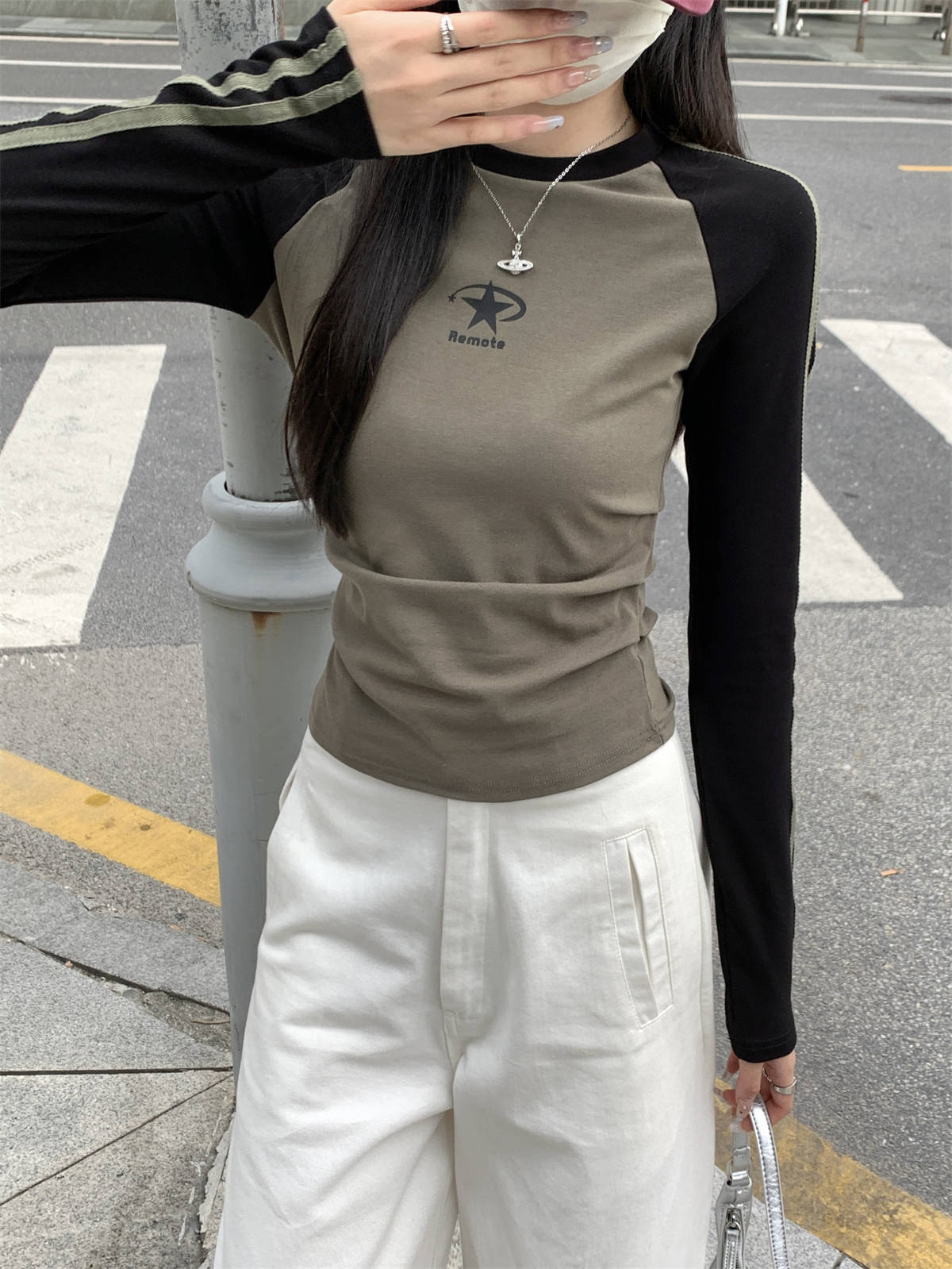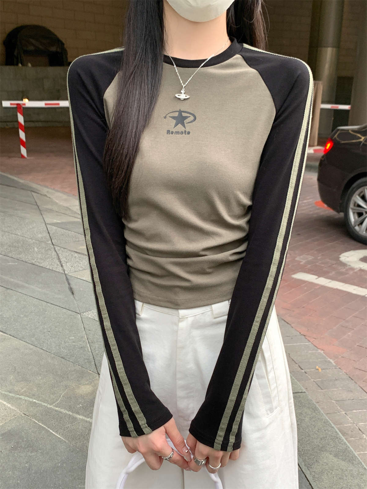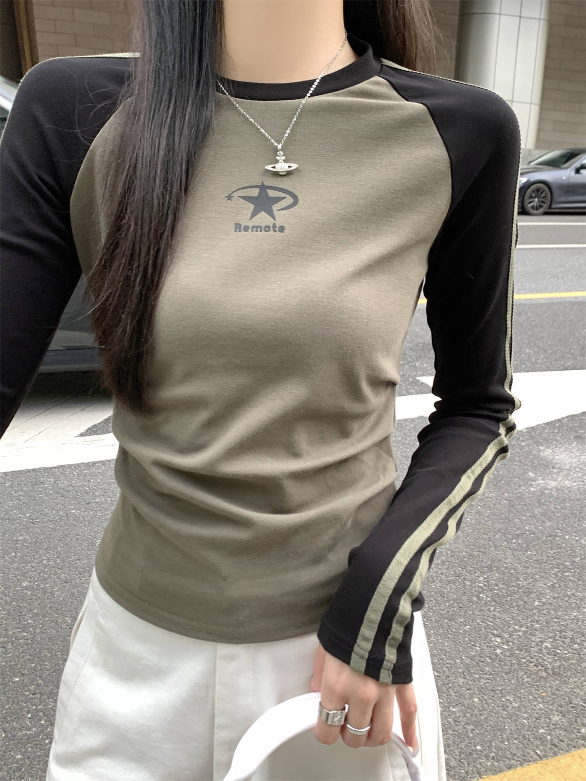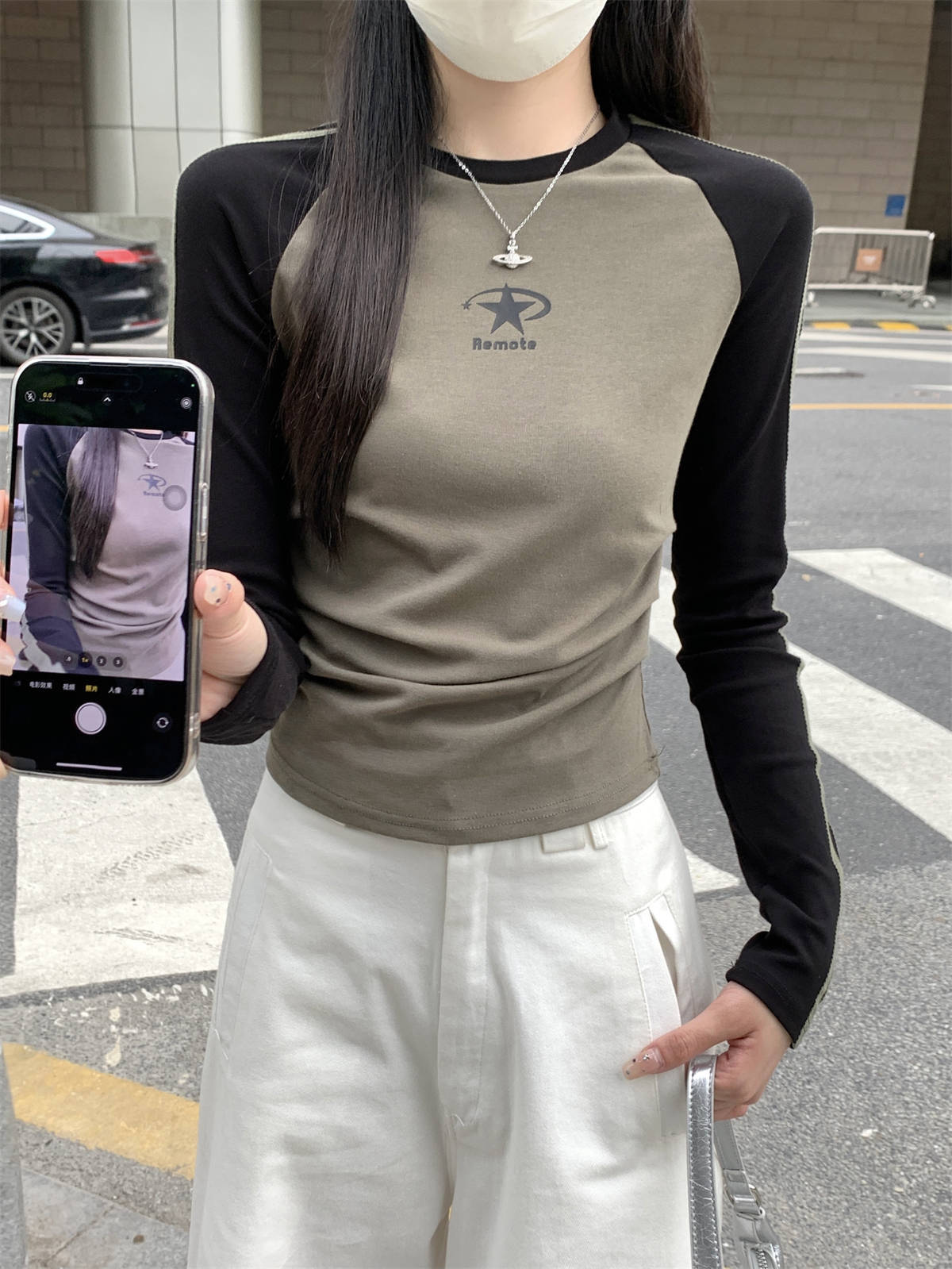 春秋冬季新款ins撞色插肩袖印花T恤女上衣美式辣妹長袖T恤打底衫