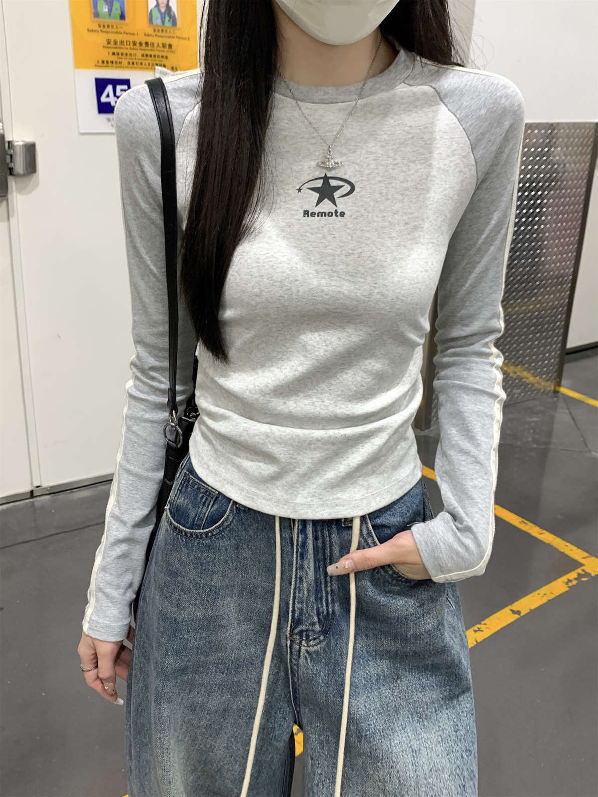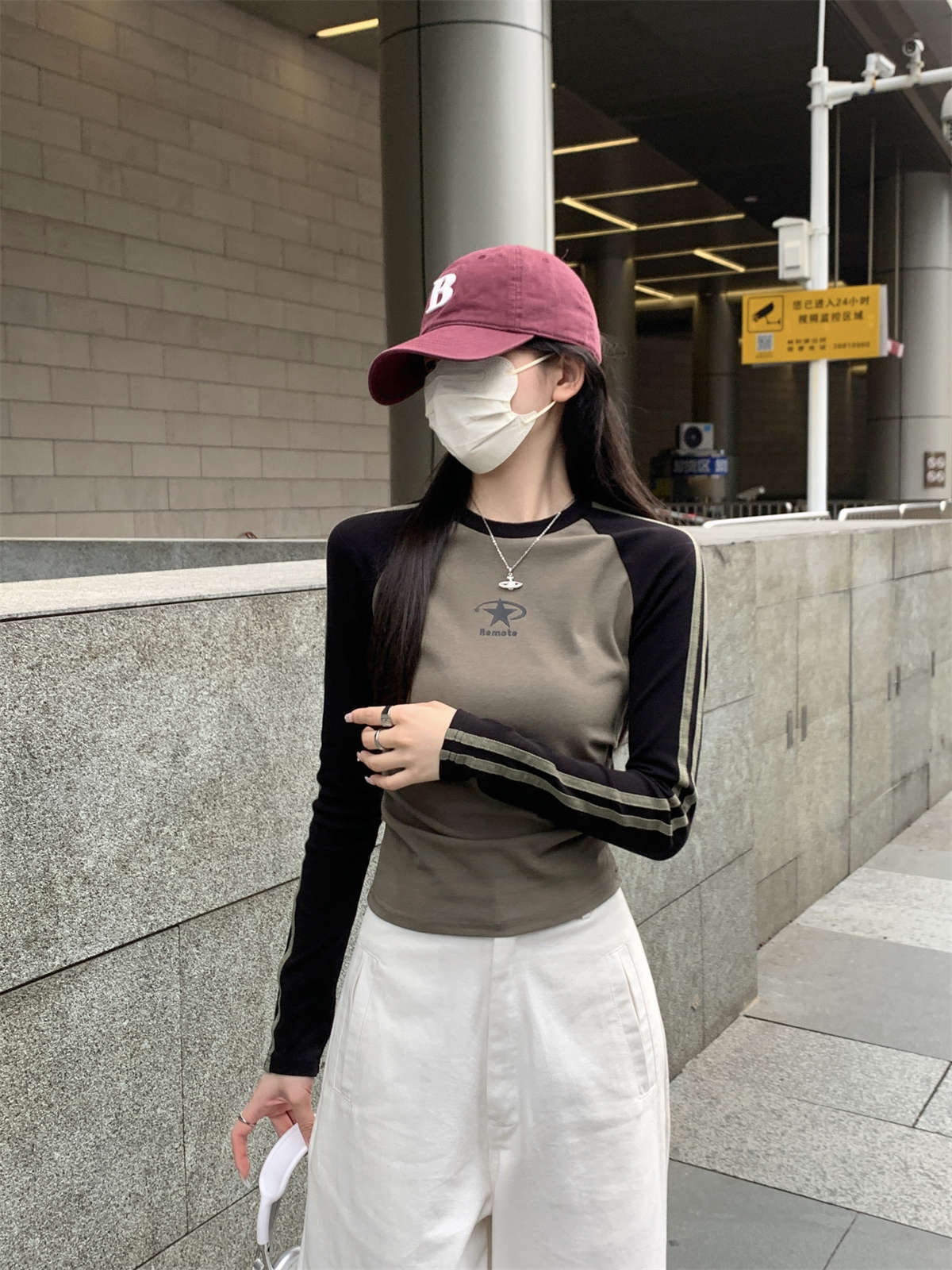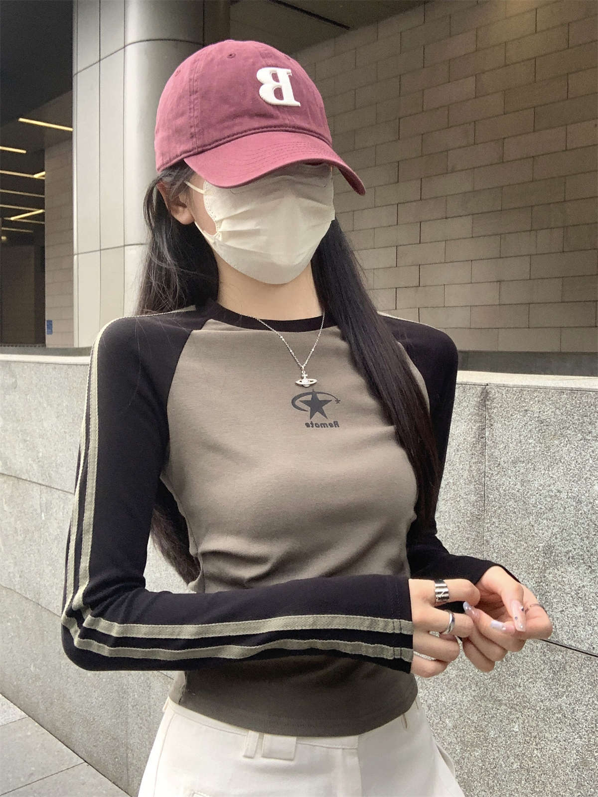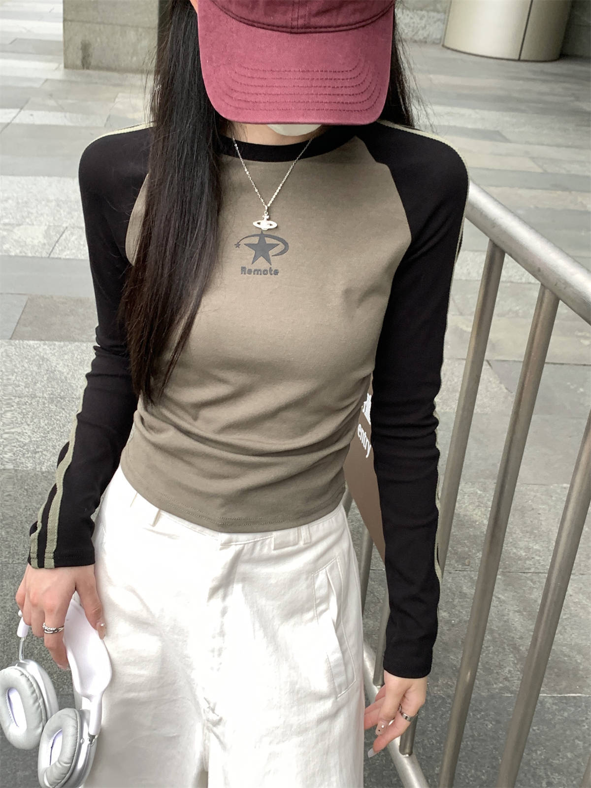 春秋冬季新款ins撞色插肩袖印花T恤女上衣美式辣妹長袖T恤打底衫