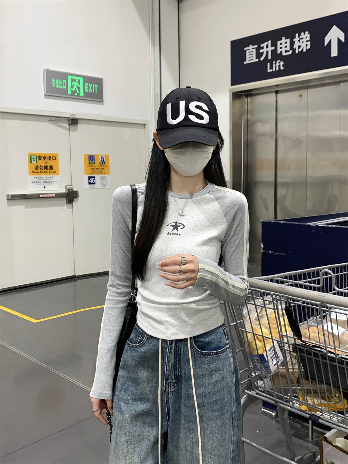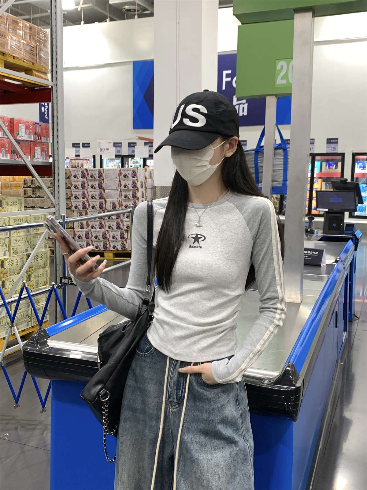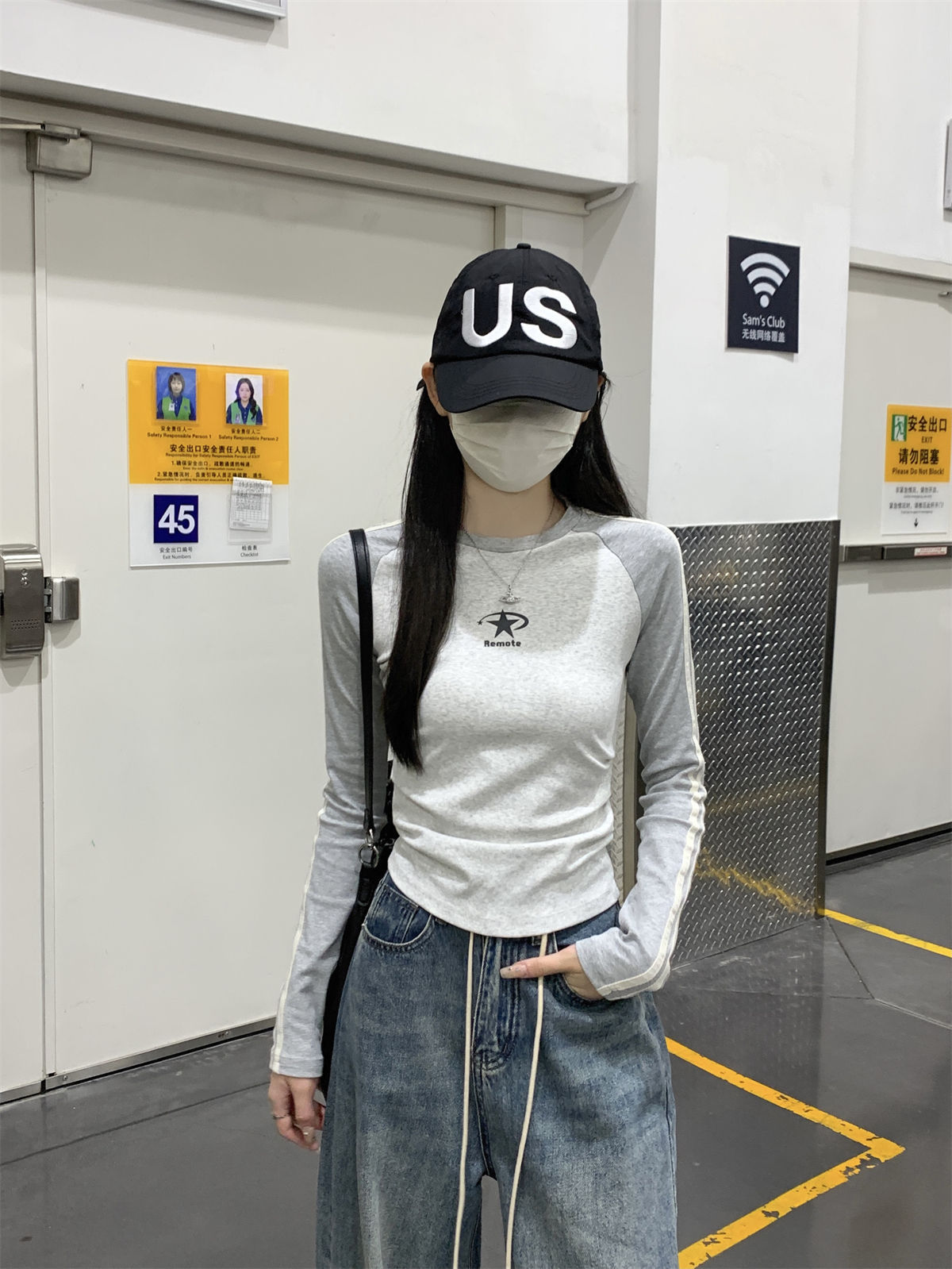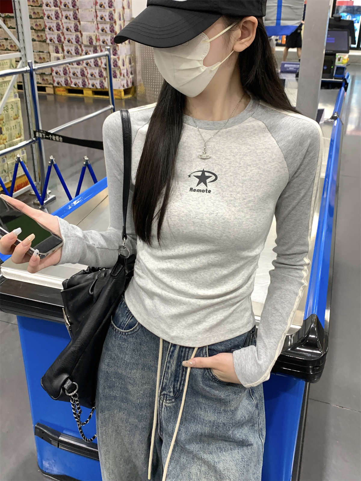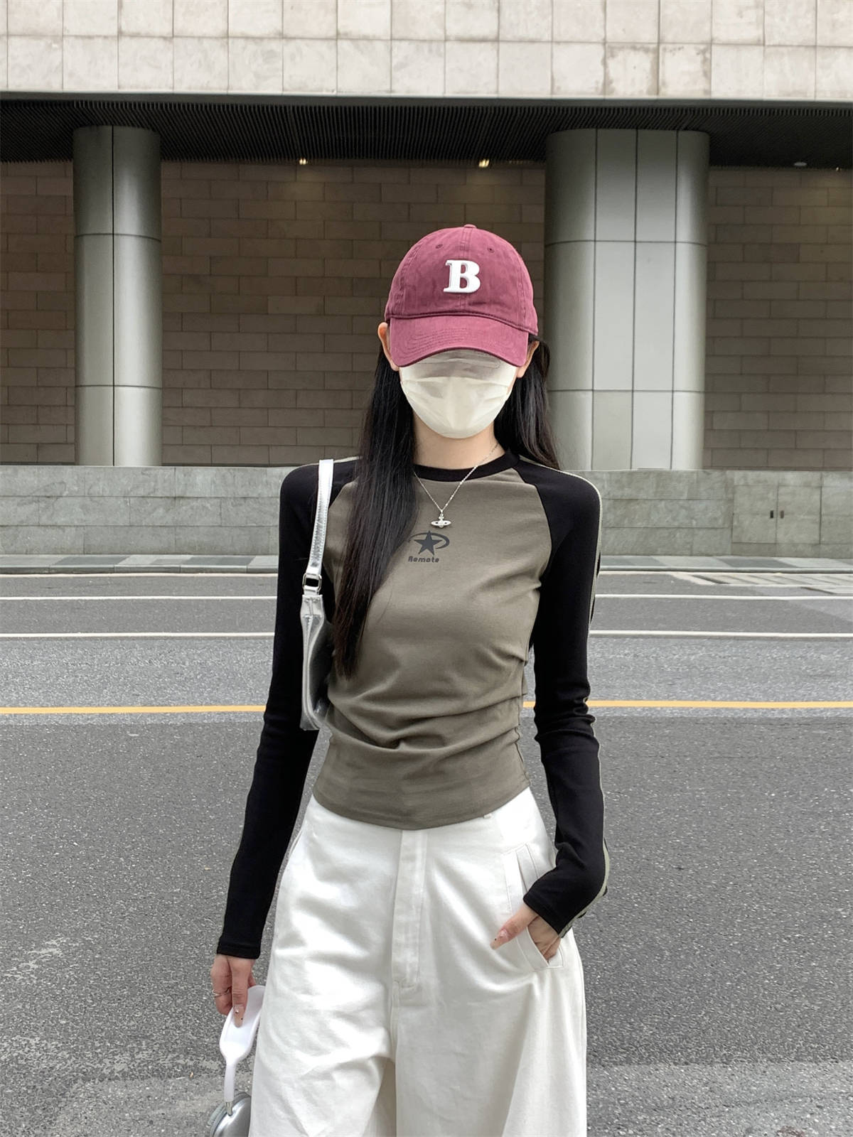 春秋冬季新款ins撞色插肩袖印花T恤女上衣美式辣妹長袖T恤打底衫