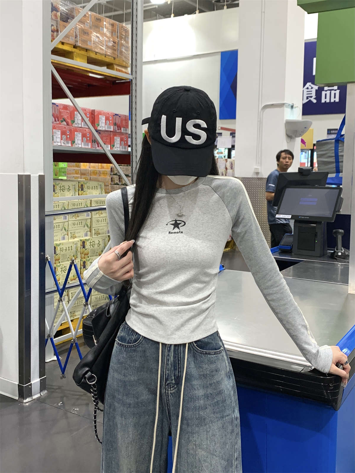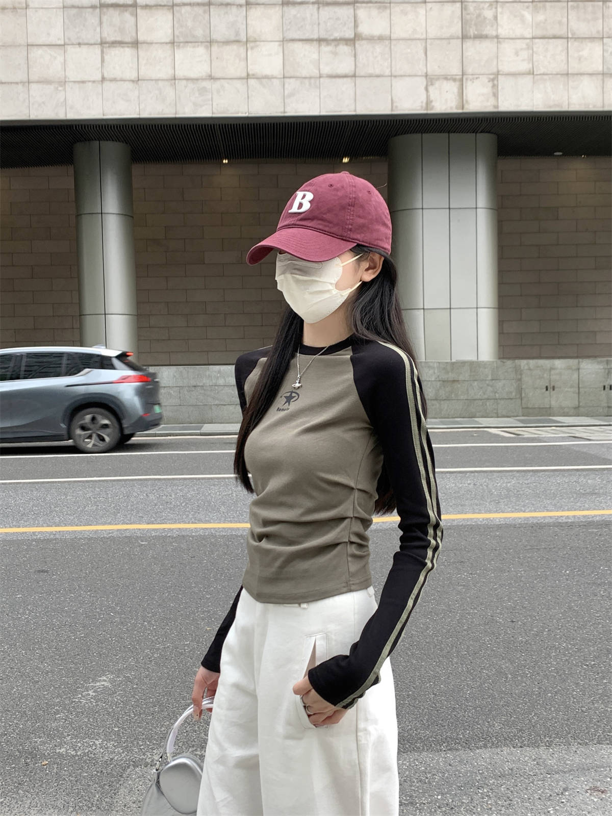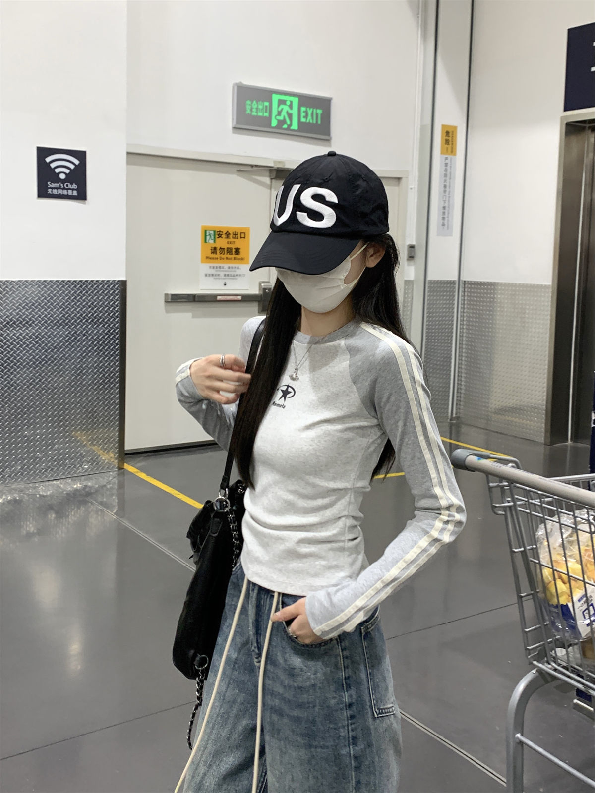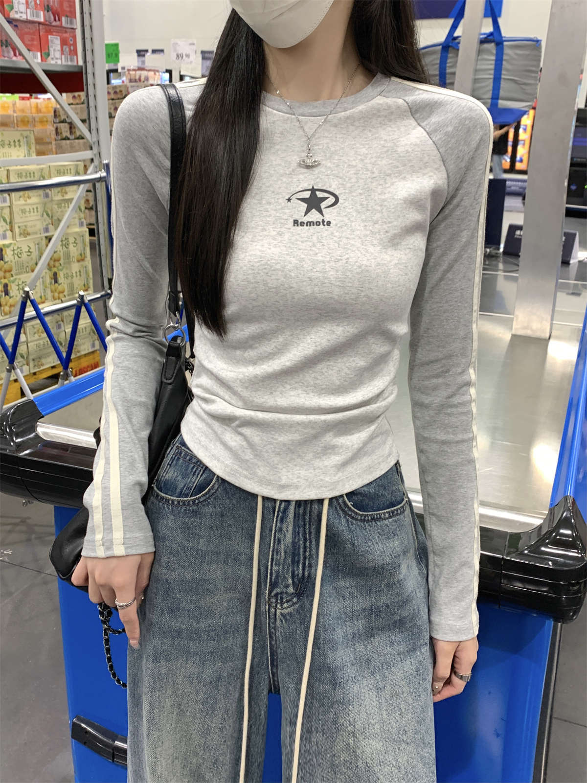 春秋冬季新款ins撞色插肩袖印花T恤女上衣美式辣妹長袖T恤打底衫