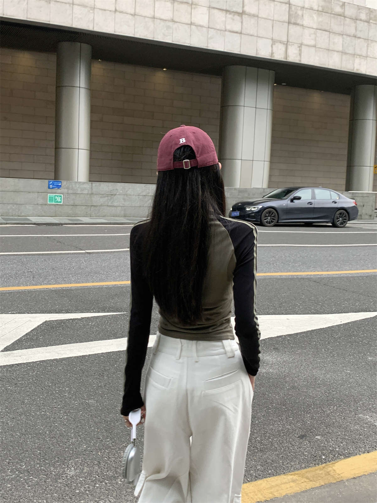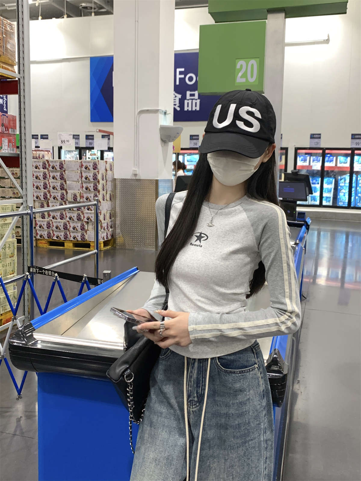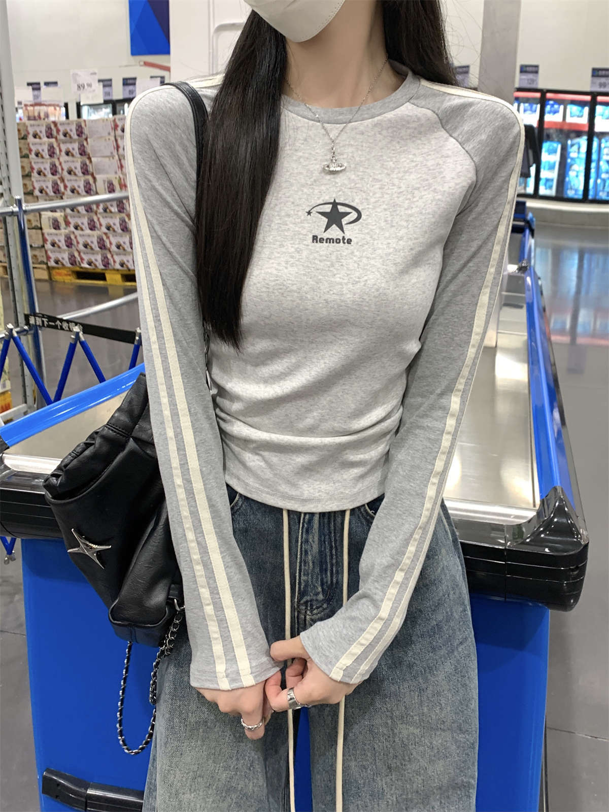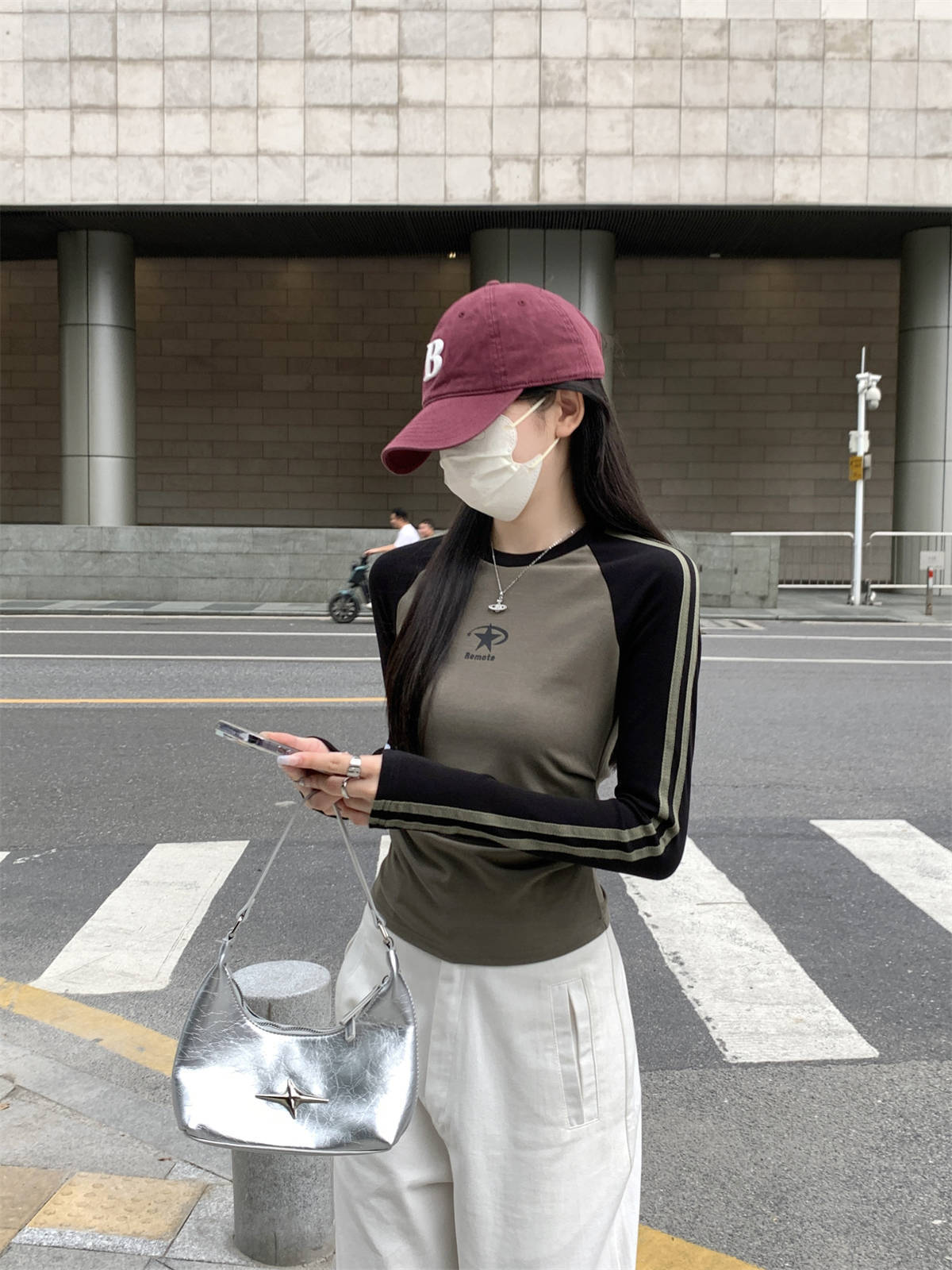 春秋冬季新款ins撞色插肩袖印花T恤女上衣美式辣妹長袖T恤打底衫