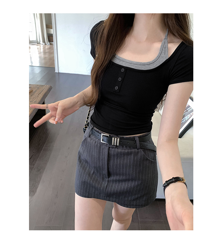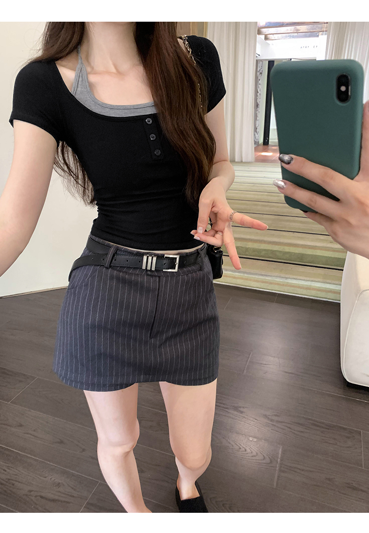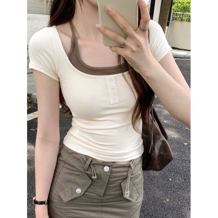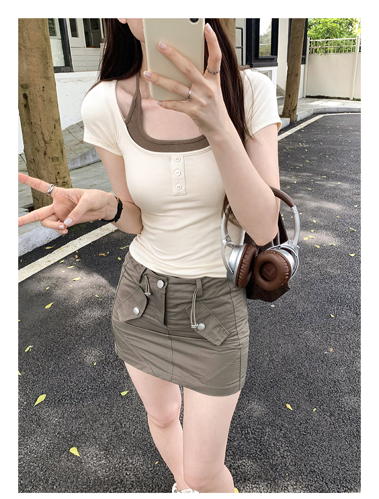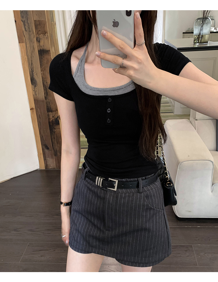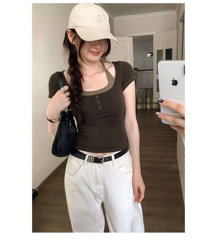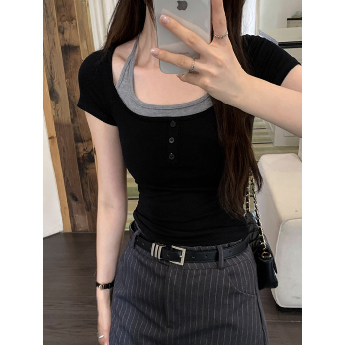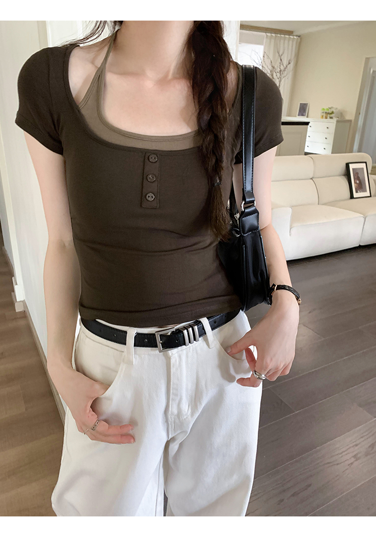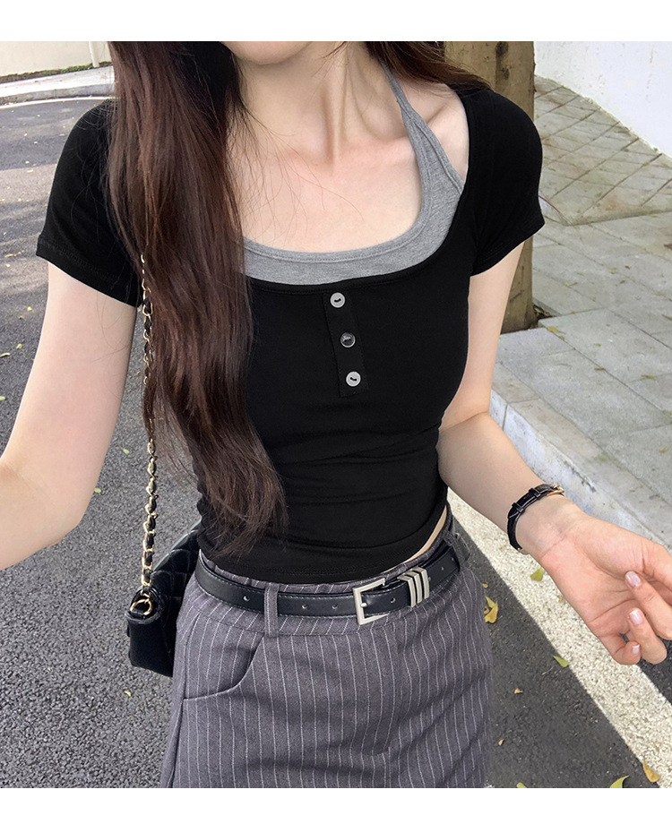 掛脖系帶方領假兩件修身短袖女夏2025新款設計感小衆別致顯瘦上衣