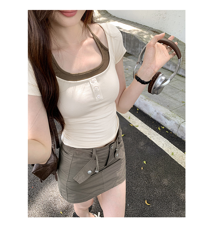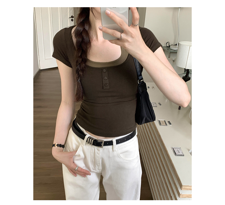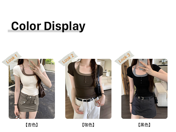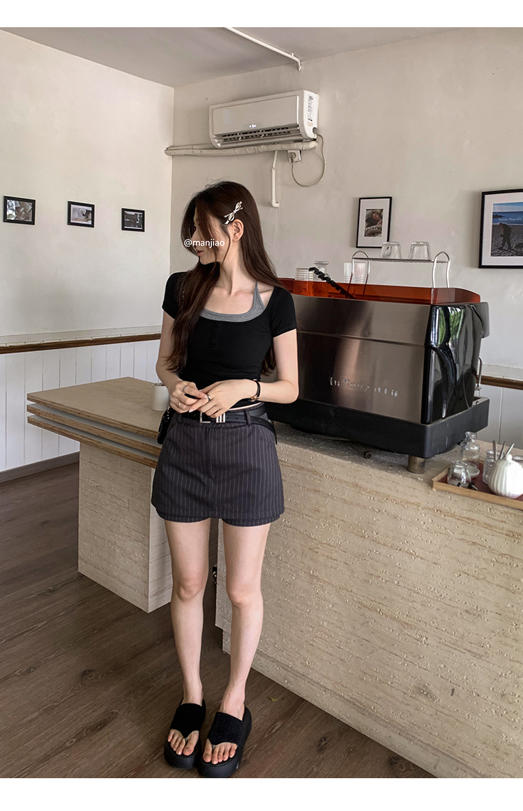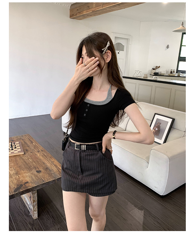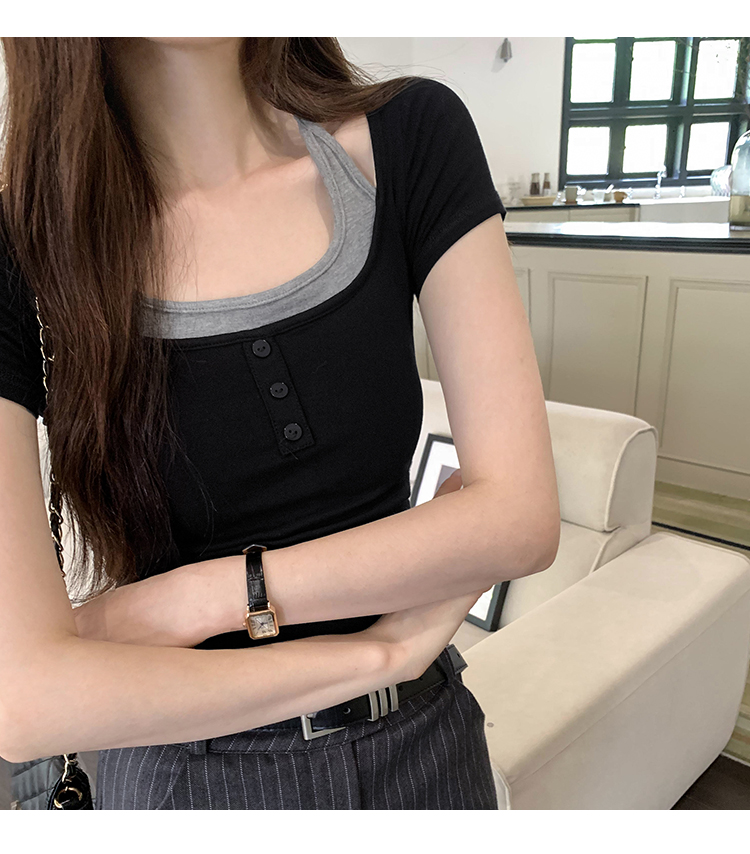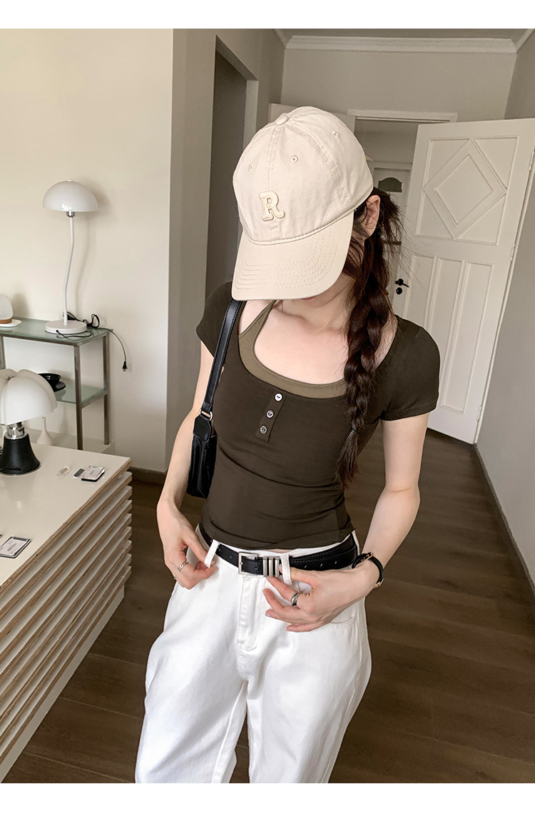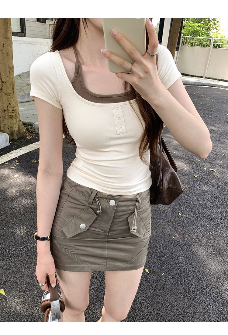 掛脖系帶方領假兩件修身短袖女夏2025新款設計感小衆別致顯瘦上衣