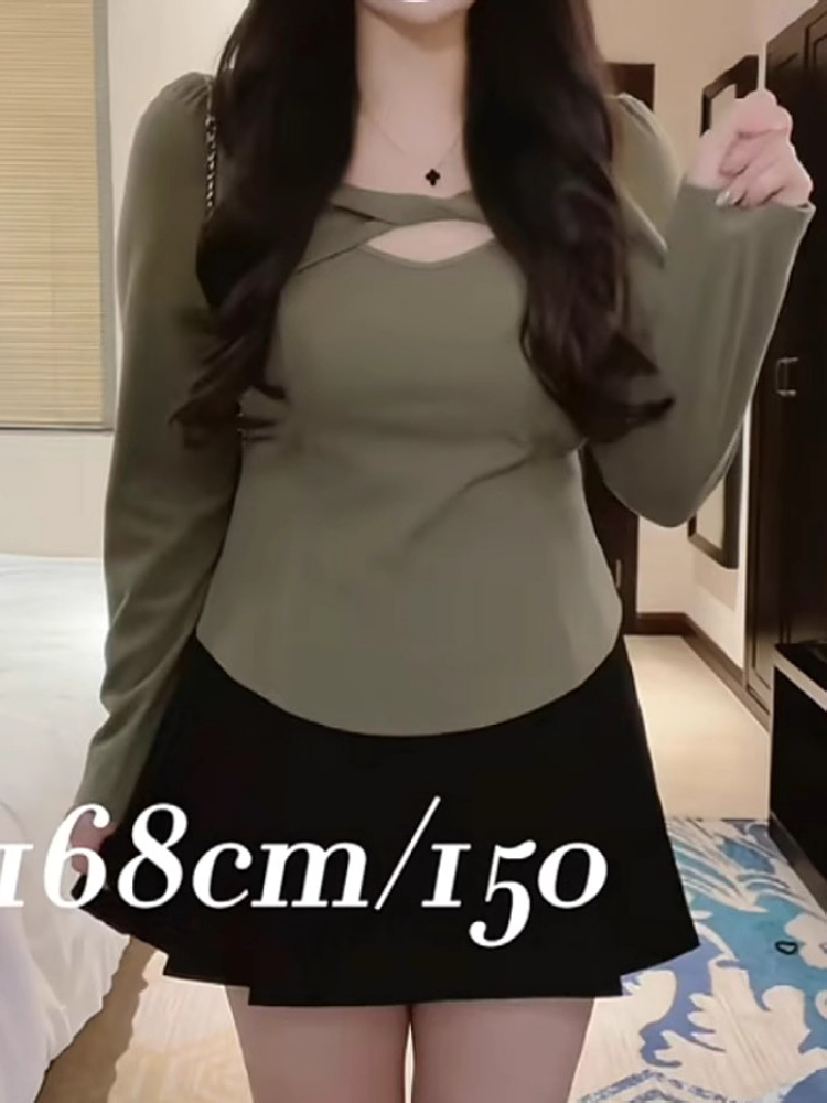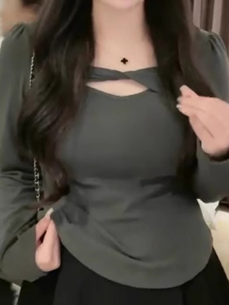 2025新款秋季獨特別致方領長袖T恤大碼女裝胖mm修身顯瘦打底上衣