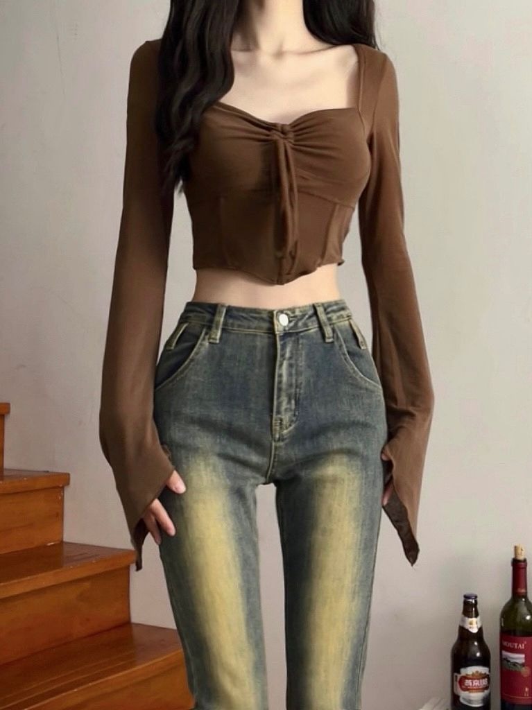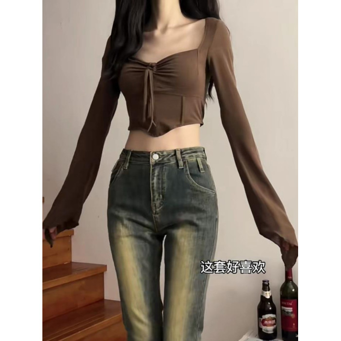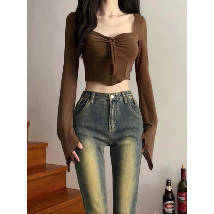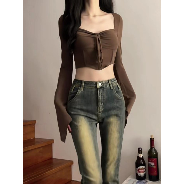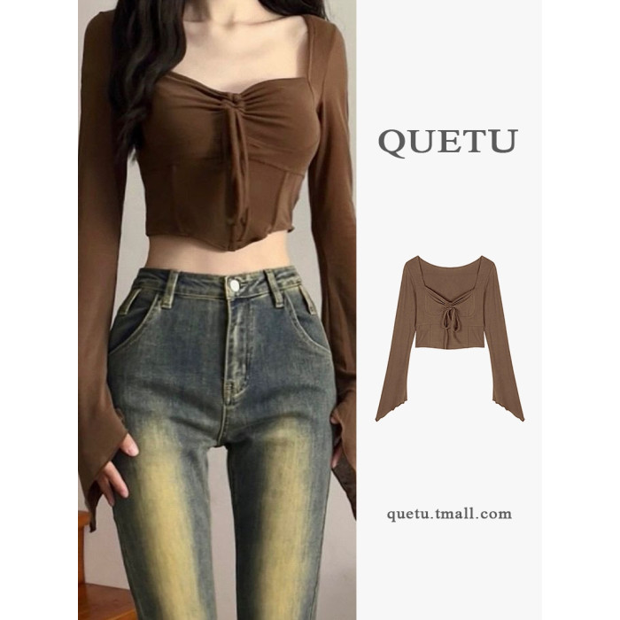 美式性感長袖T恤打底衫女裝早秋季新款設計感純欲辣妹短款小上衣