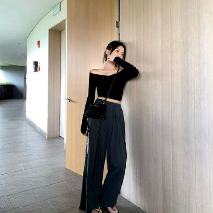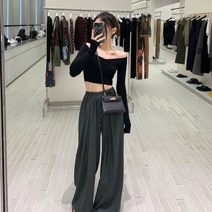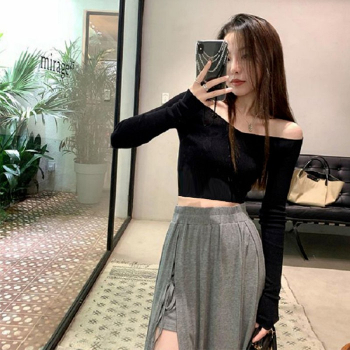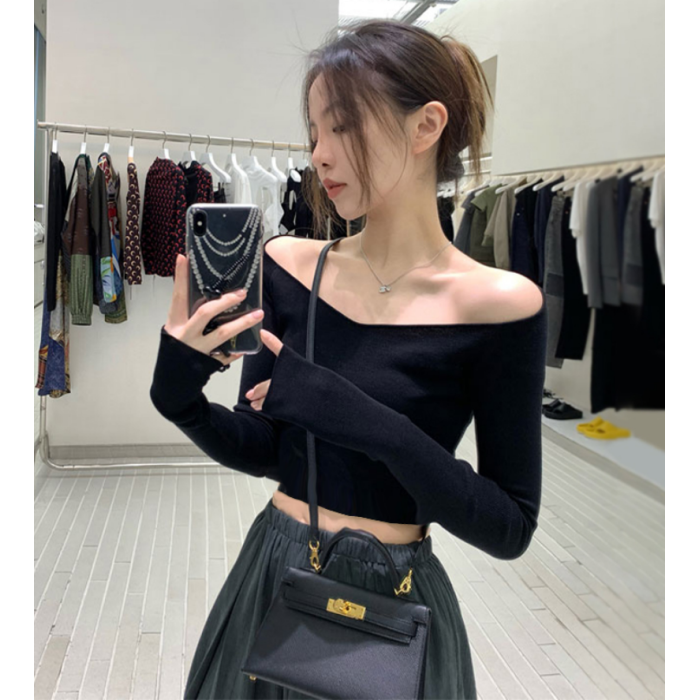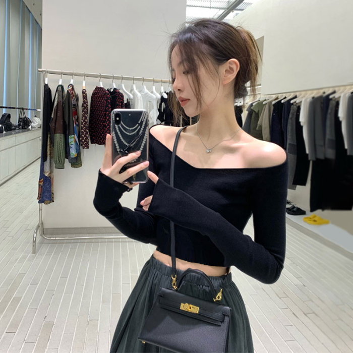 一字肩上衣別致長袖t恤漏肚臍女春秋季小衆設計感緊身短款打底衫