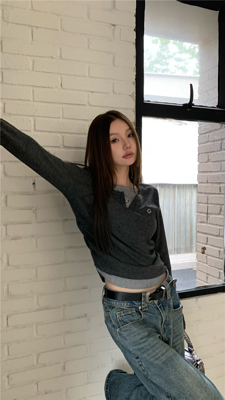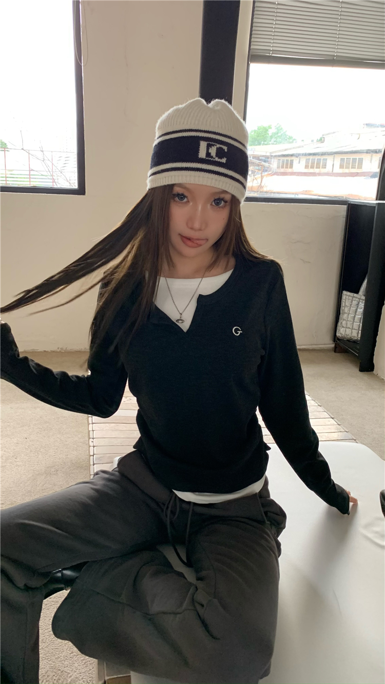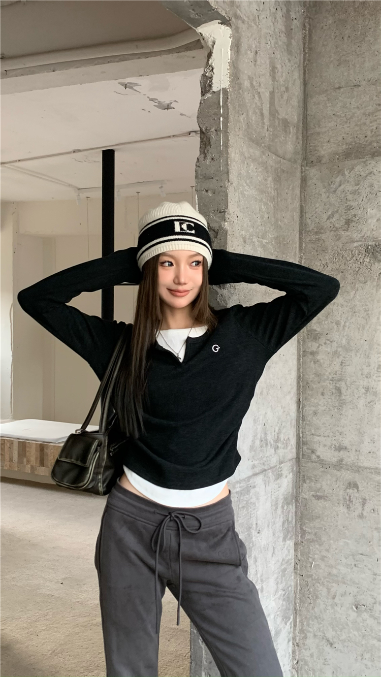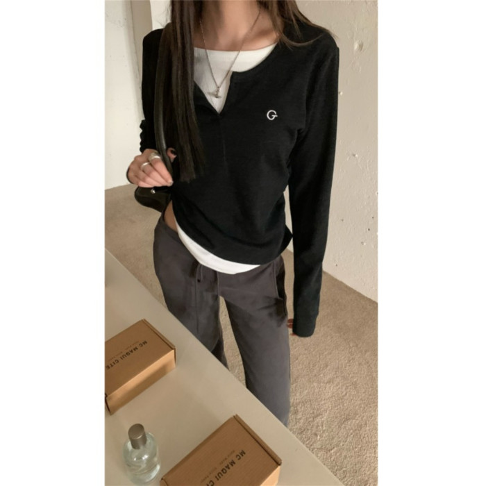 PPHOME甜欲學姐~假兩件設計百搭長袖T恤秋冬內搭修身顯瘦打底上衣