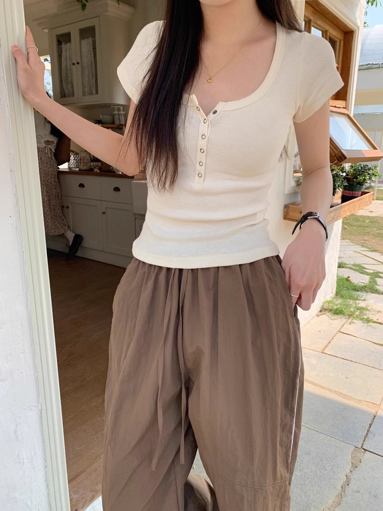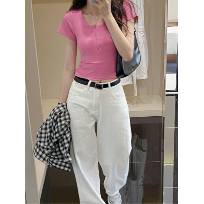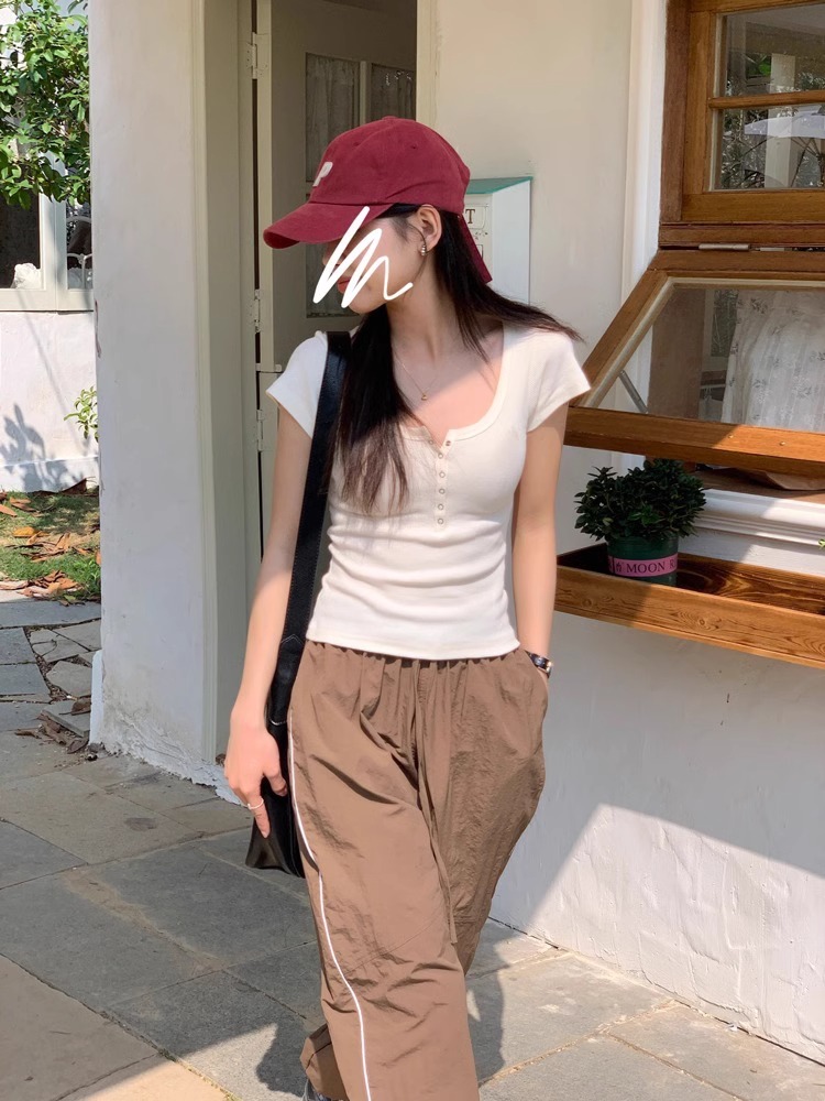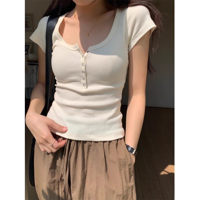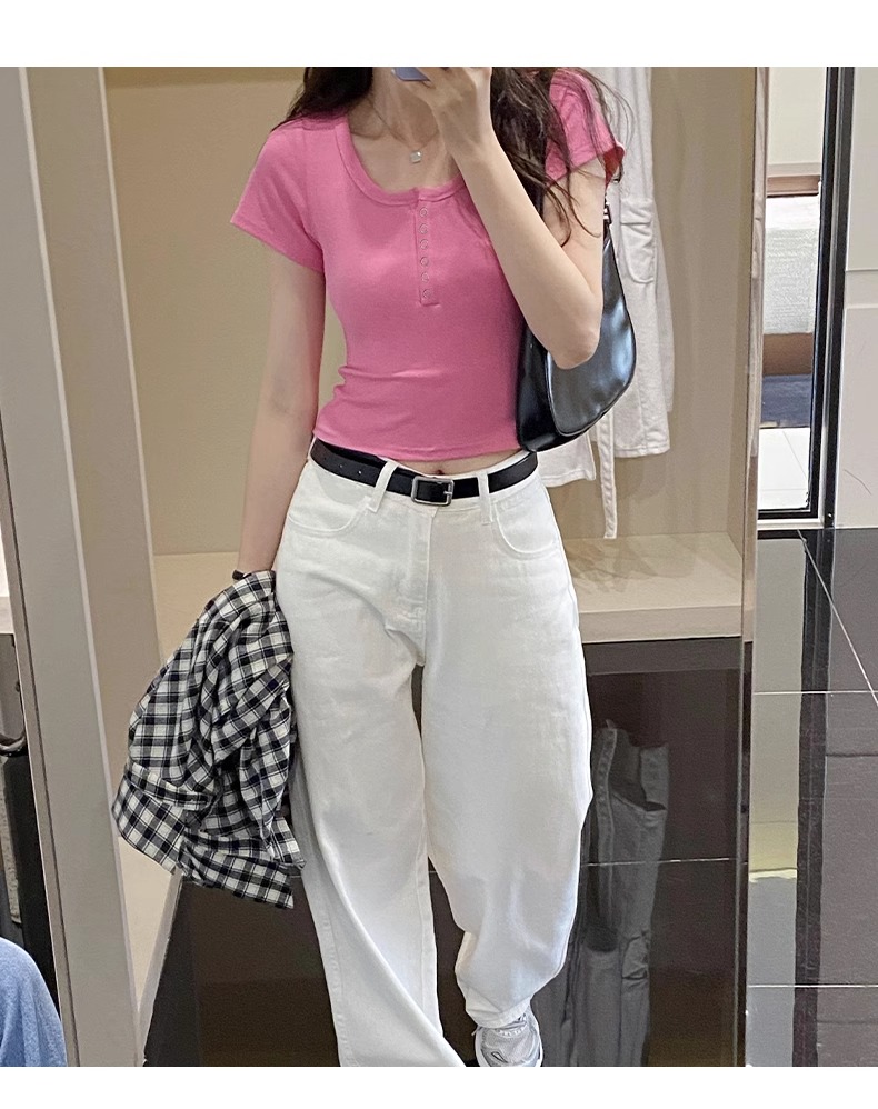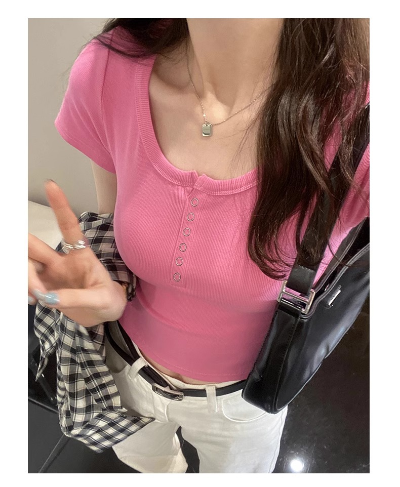 半開領紐釦上衣短款露臍U領正肩短袖2025夏季設計感修身白色T恤女