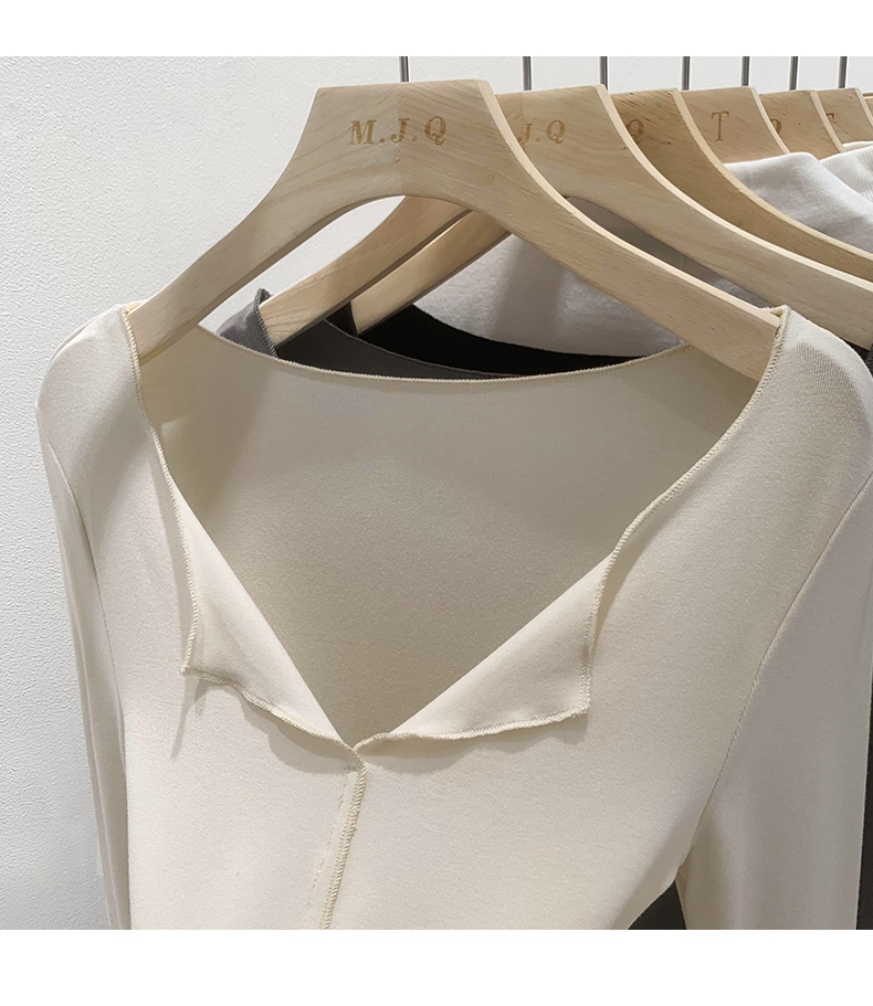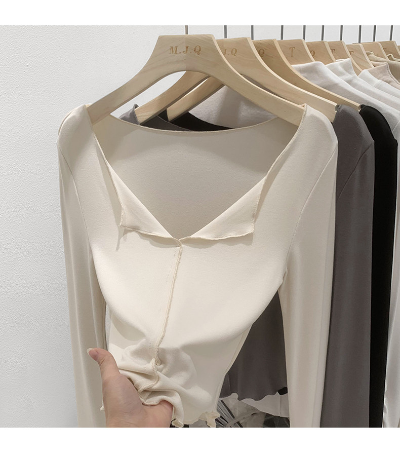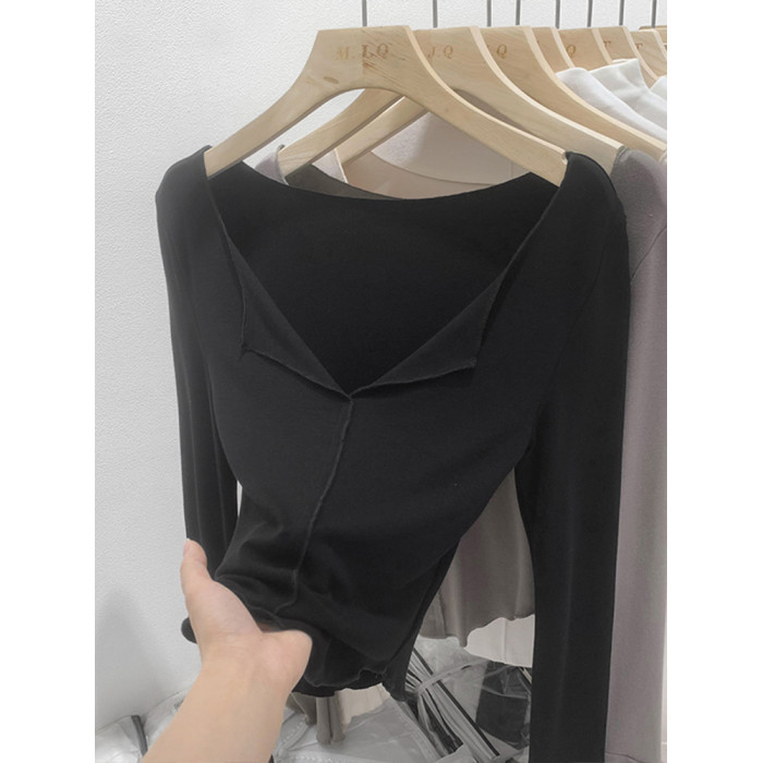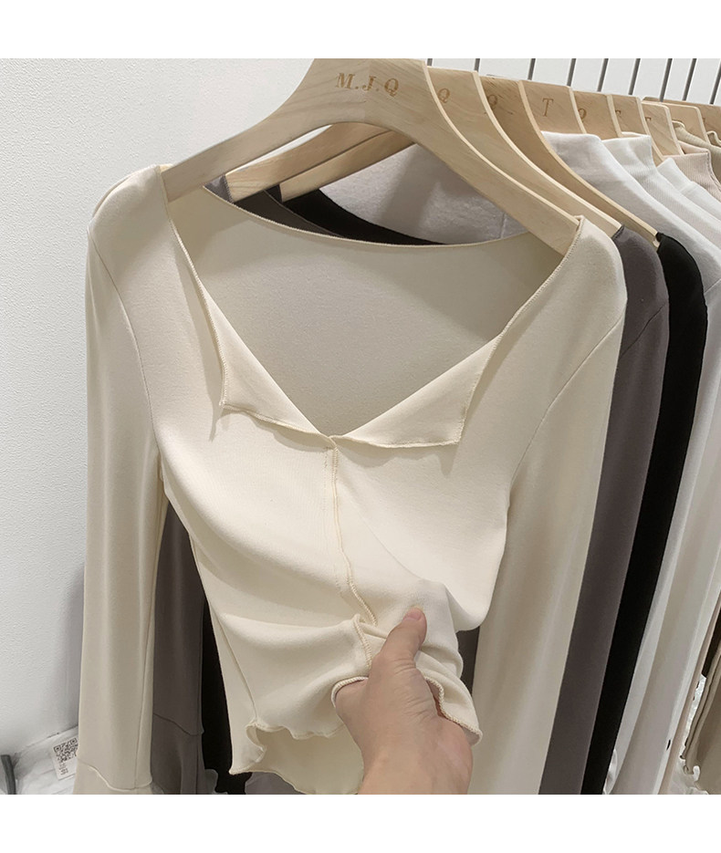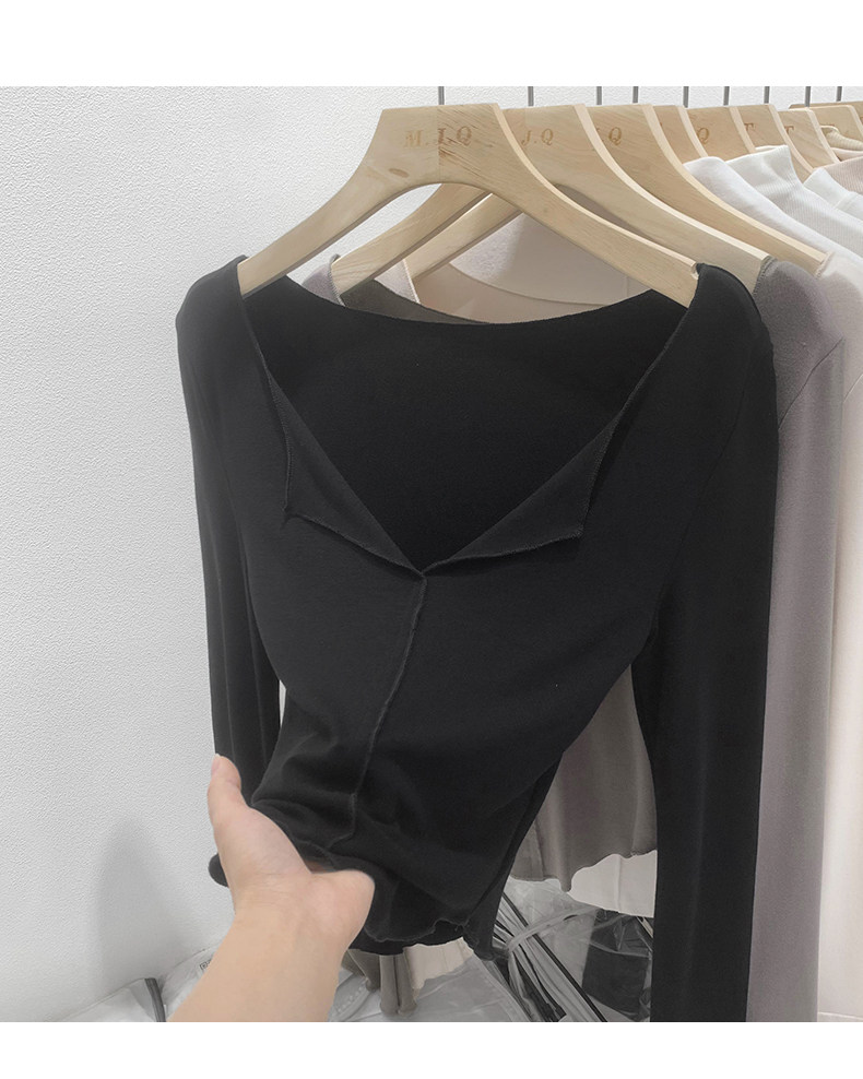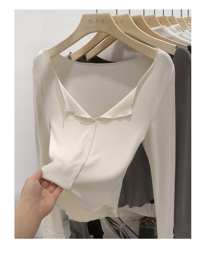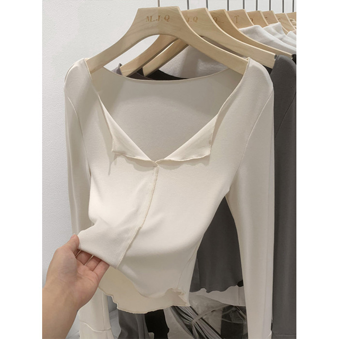 軟糯V領純欲正肩長袖t恤女春秋修身甜辣風chic木耳邊開叉白色上衣