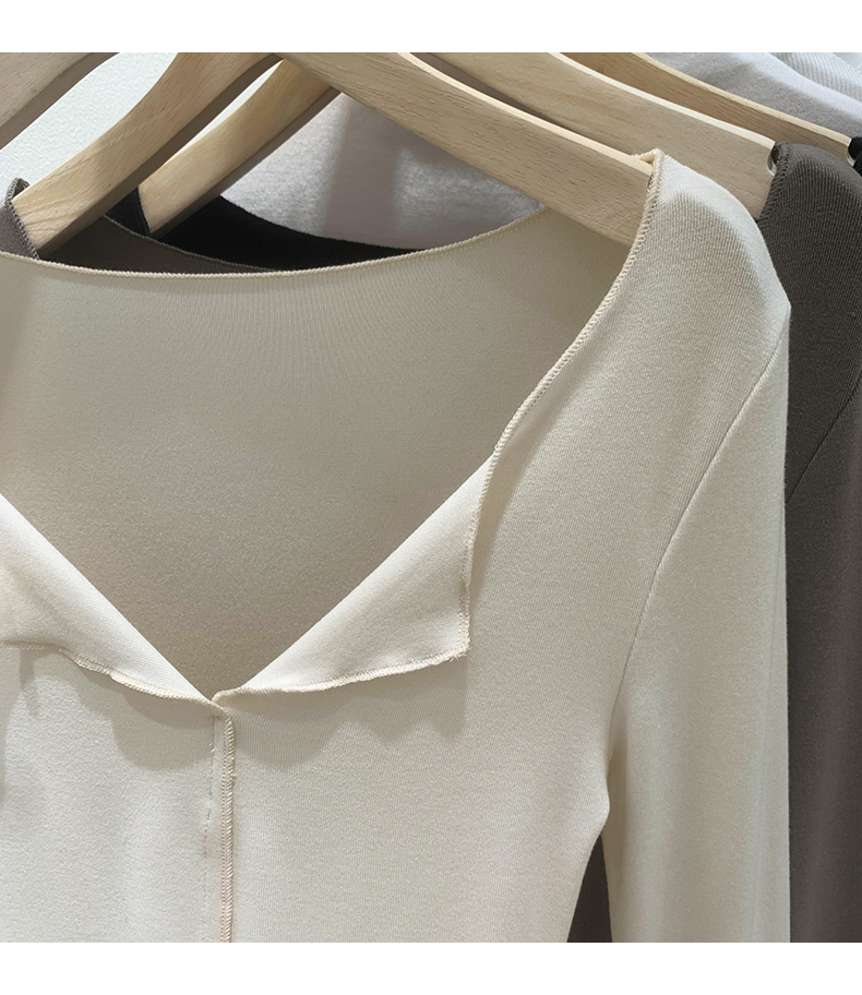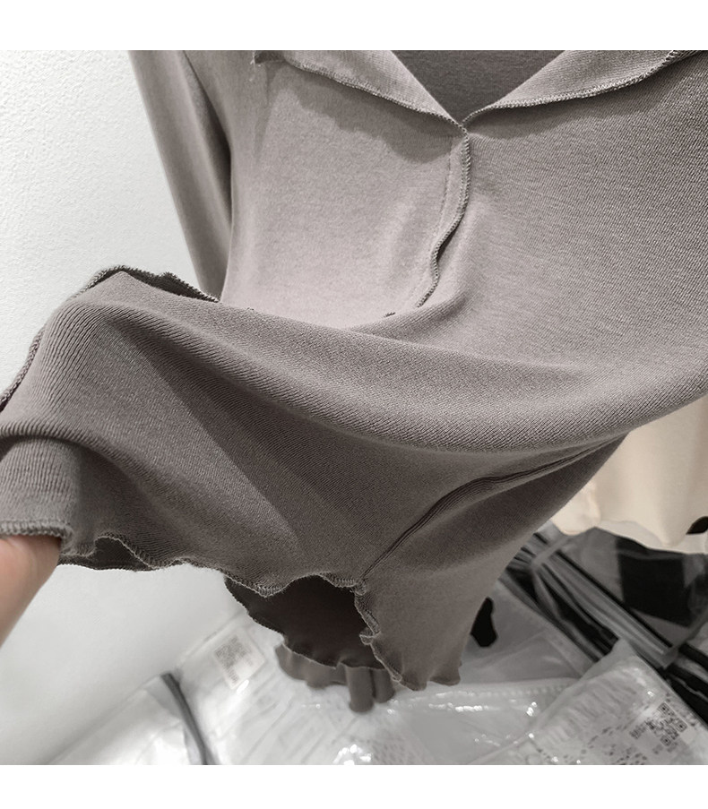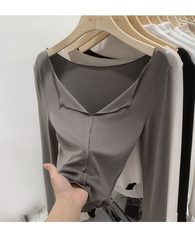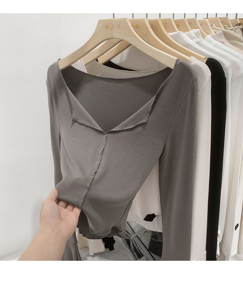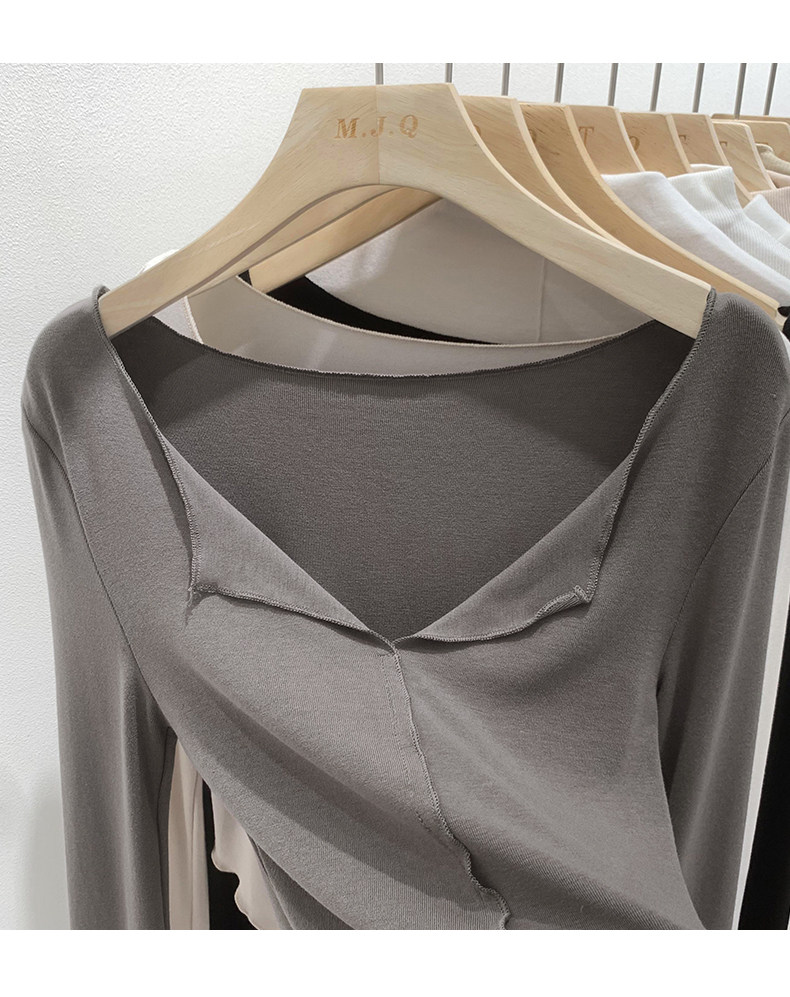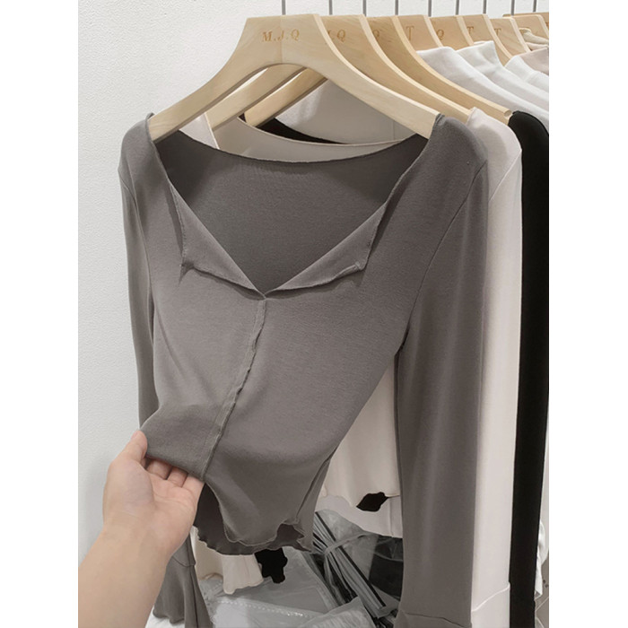 軟糯V領純欲正肩長袖t恤女春秋修身甜辣風chic木耳邊開叉白色上衣