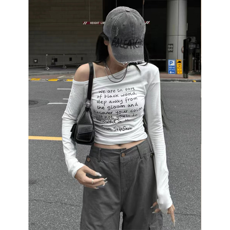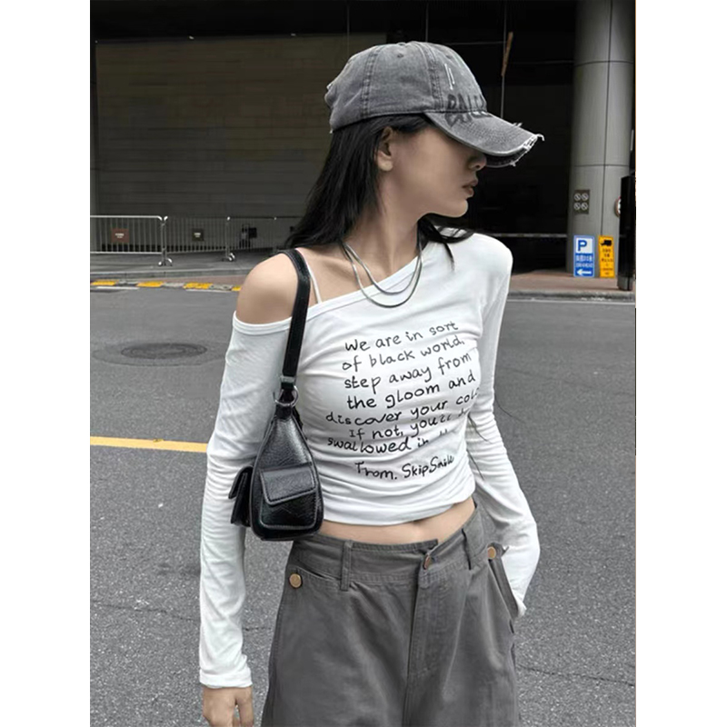 美式復古字母印花露肩長袖t恤女秋季新款設計感小衆顯瘦新款上衣