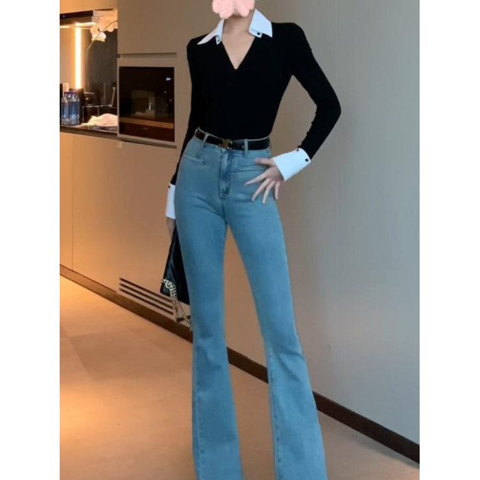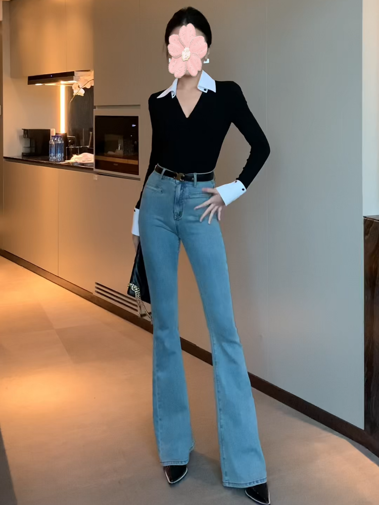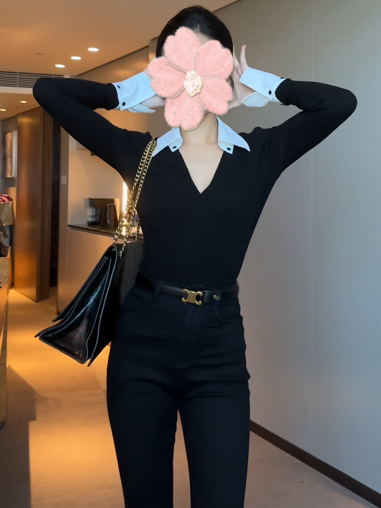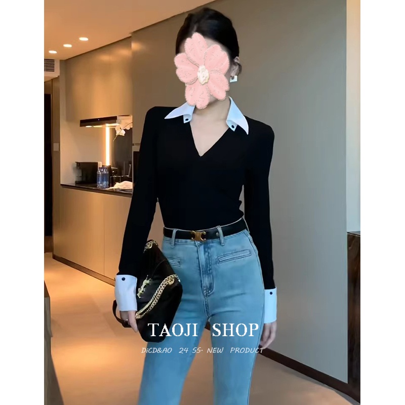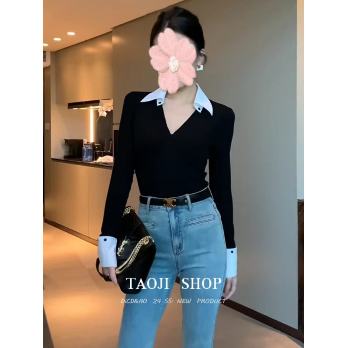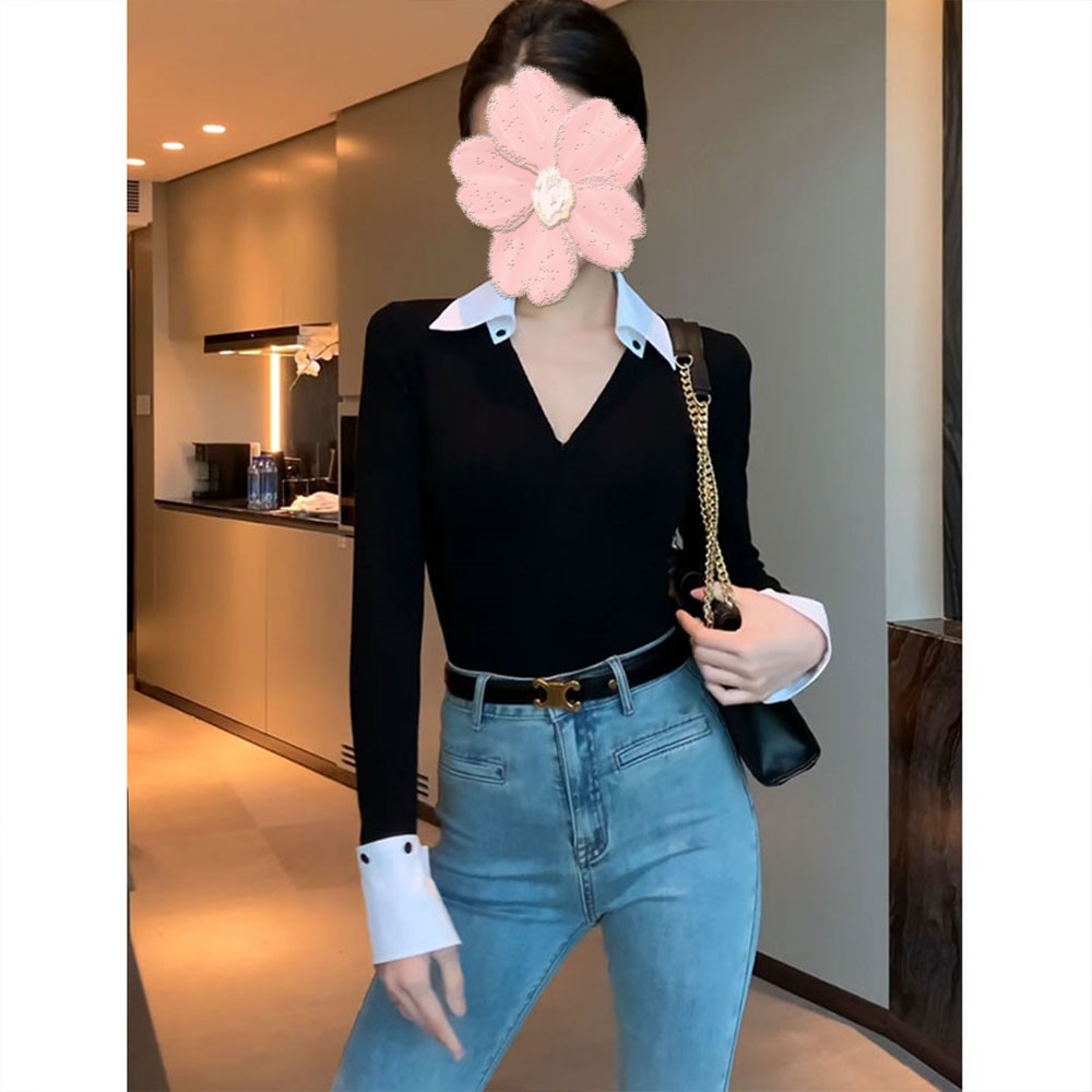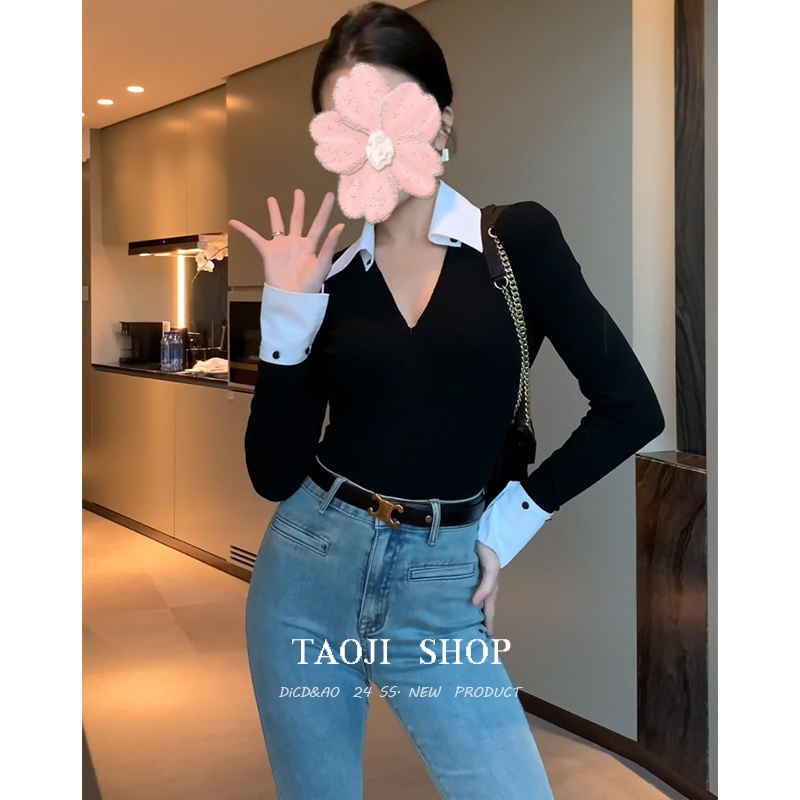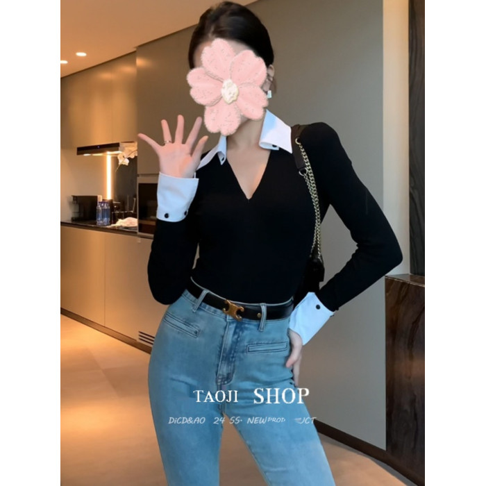 設計感撞色拼接翻領內搭上衣女秋季新款高級感修身長袖打底衫t恤