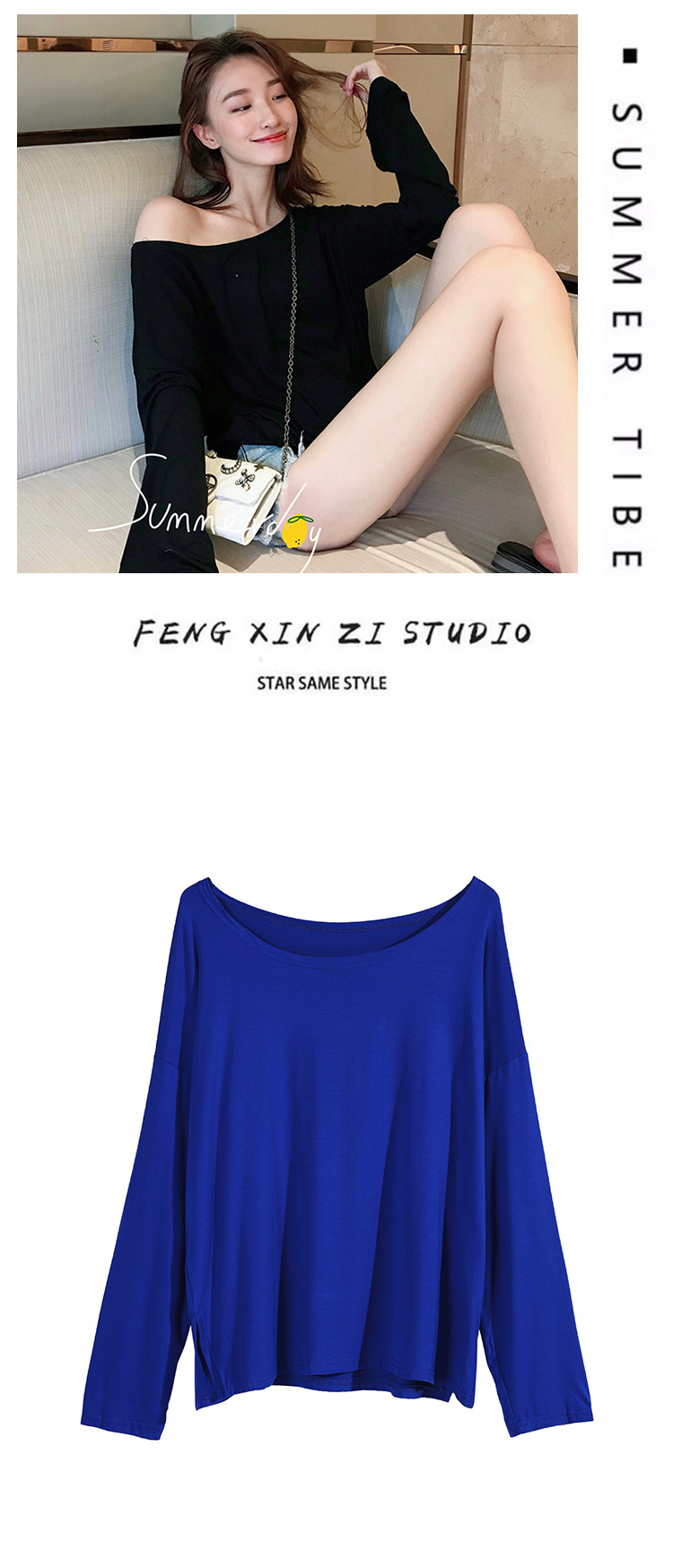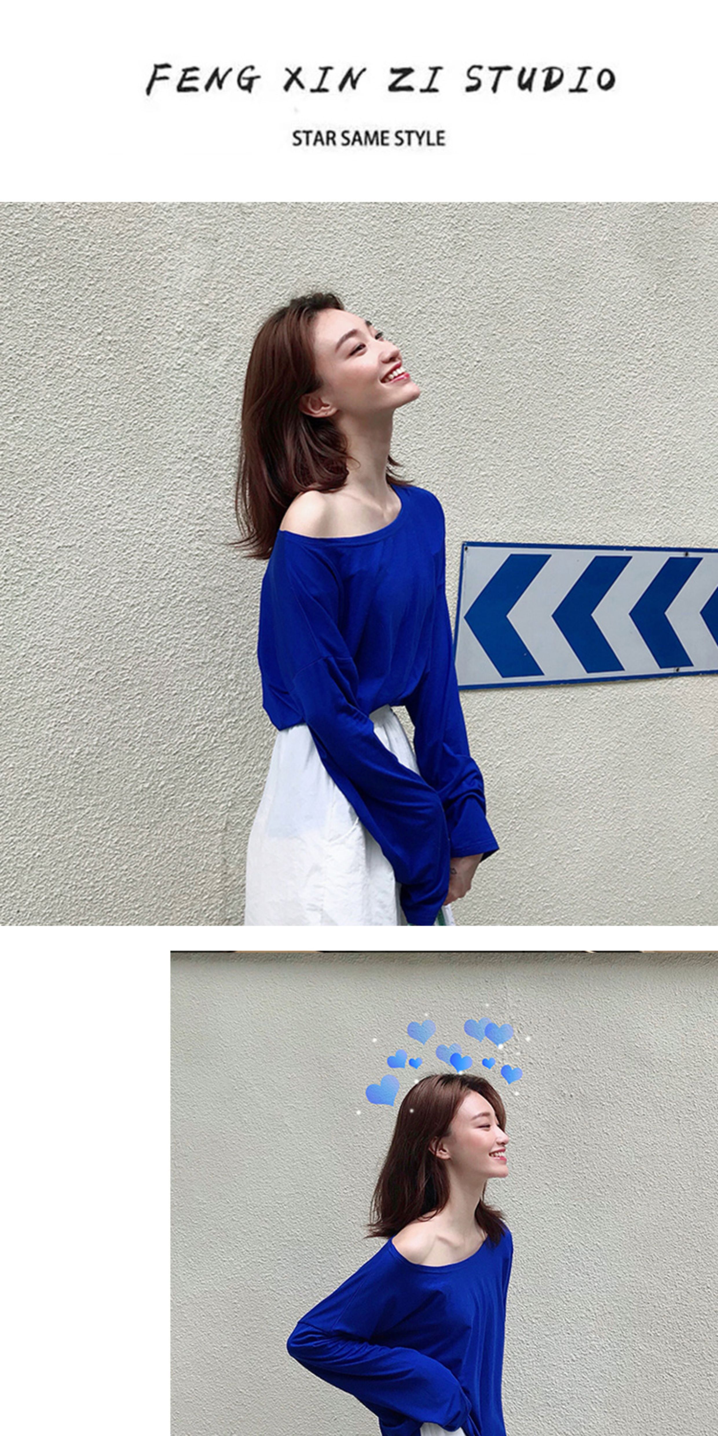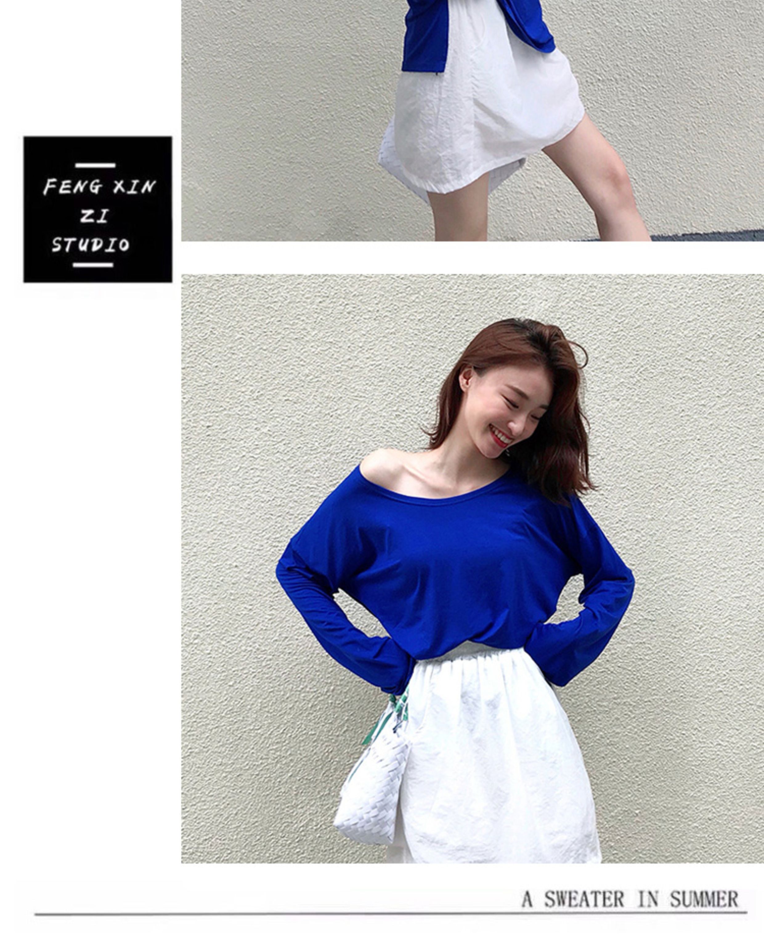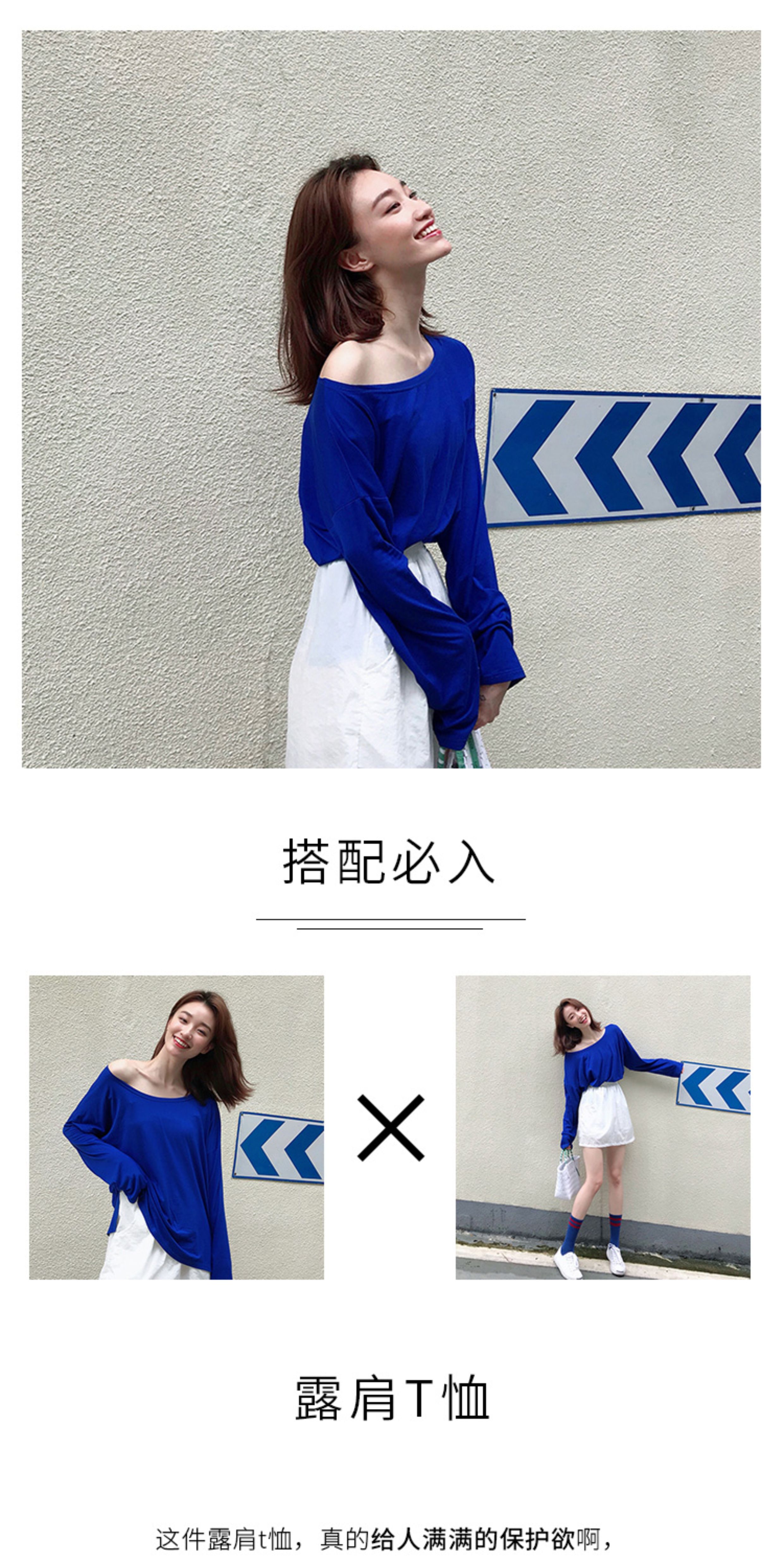 設計感克萊因藍t恤女露肩長袖莫代爾一字大領口寶藍斜肩上衣寬松
