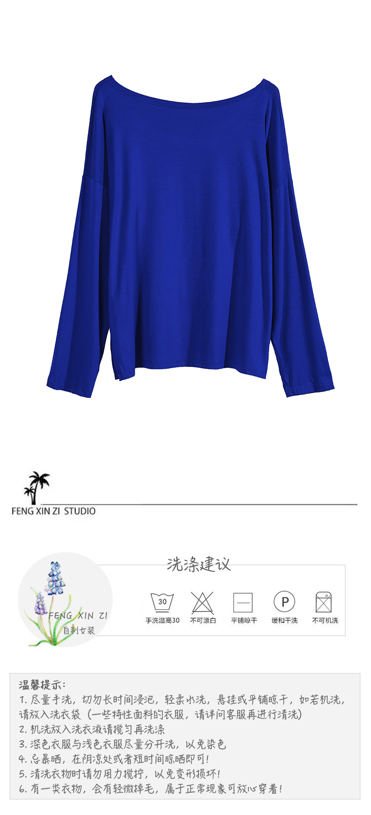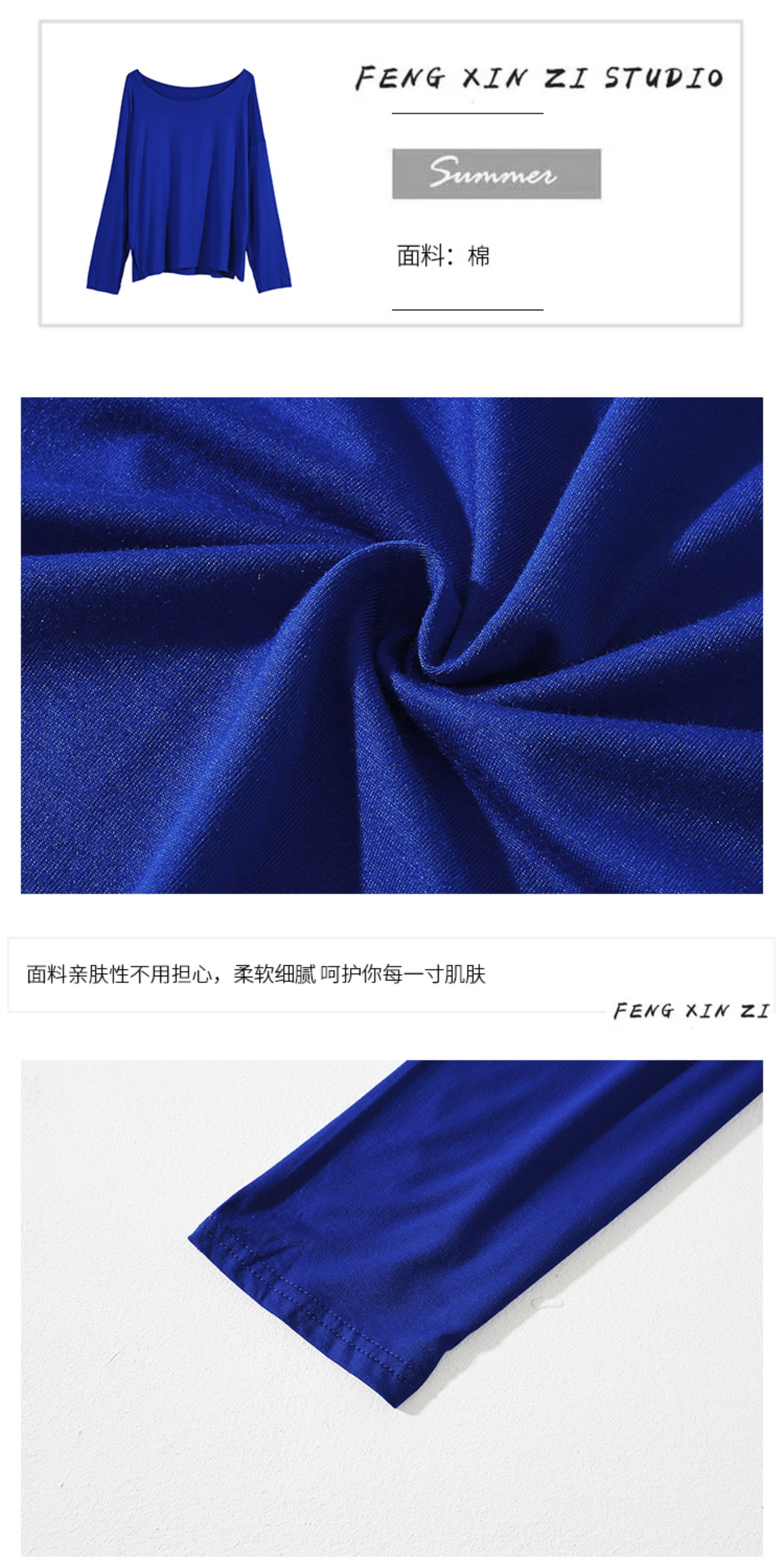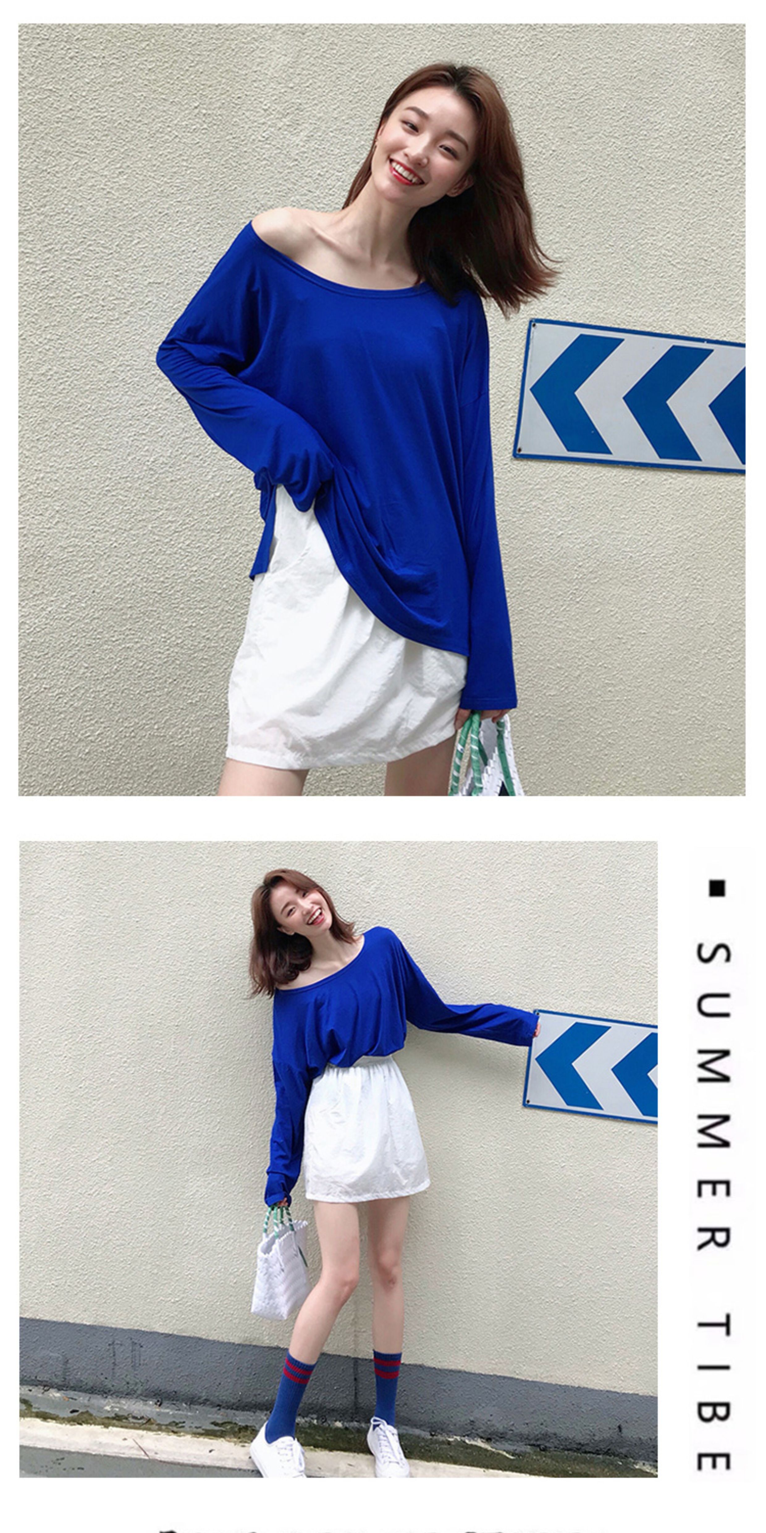 設計感克萊因藍t恤女露肩長袖莫代爾一字大領口寶藍斜肩上衣寬松